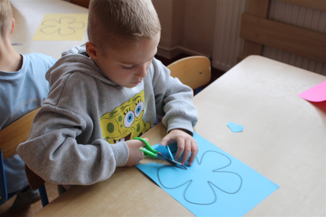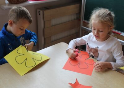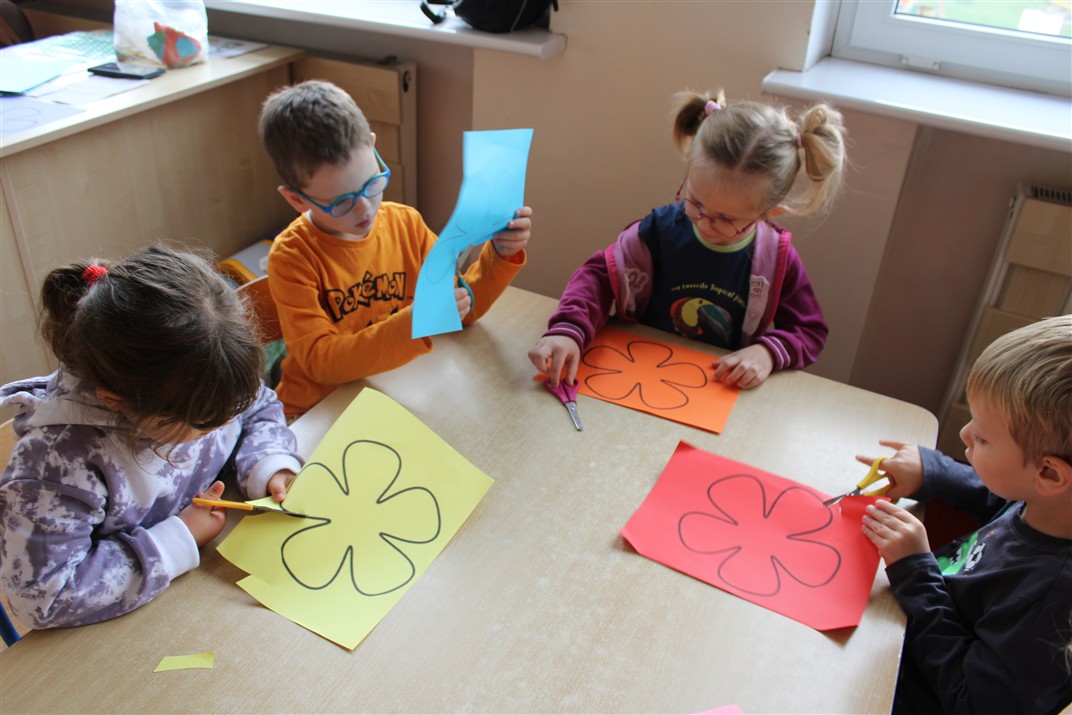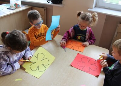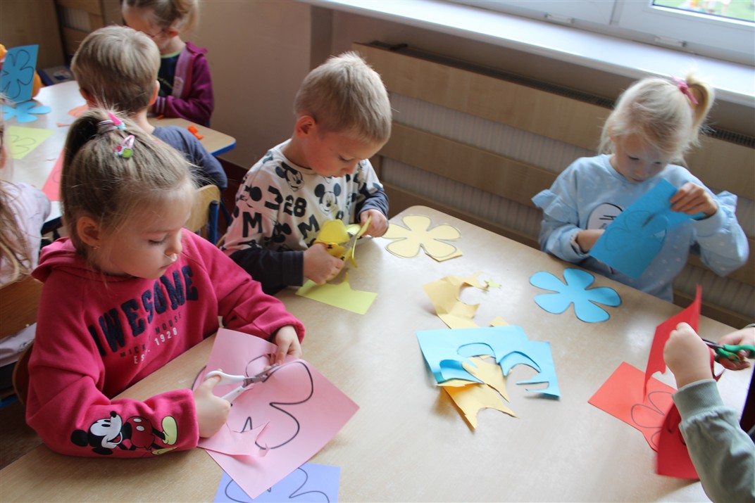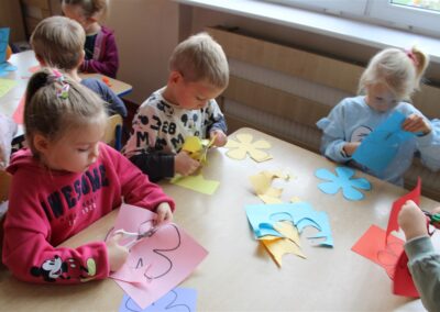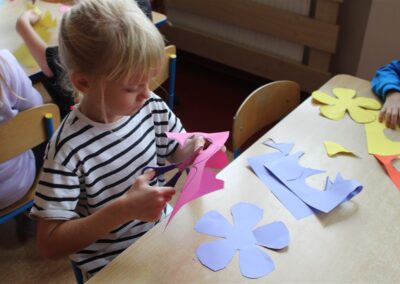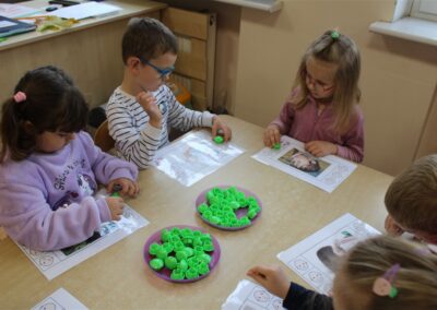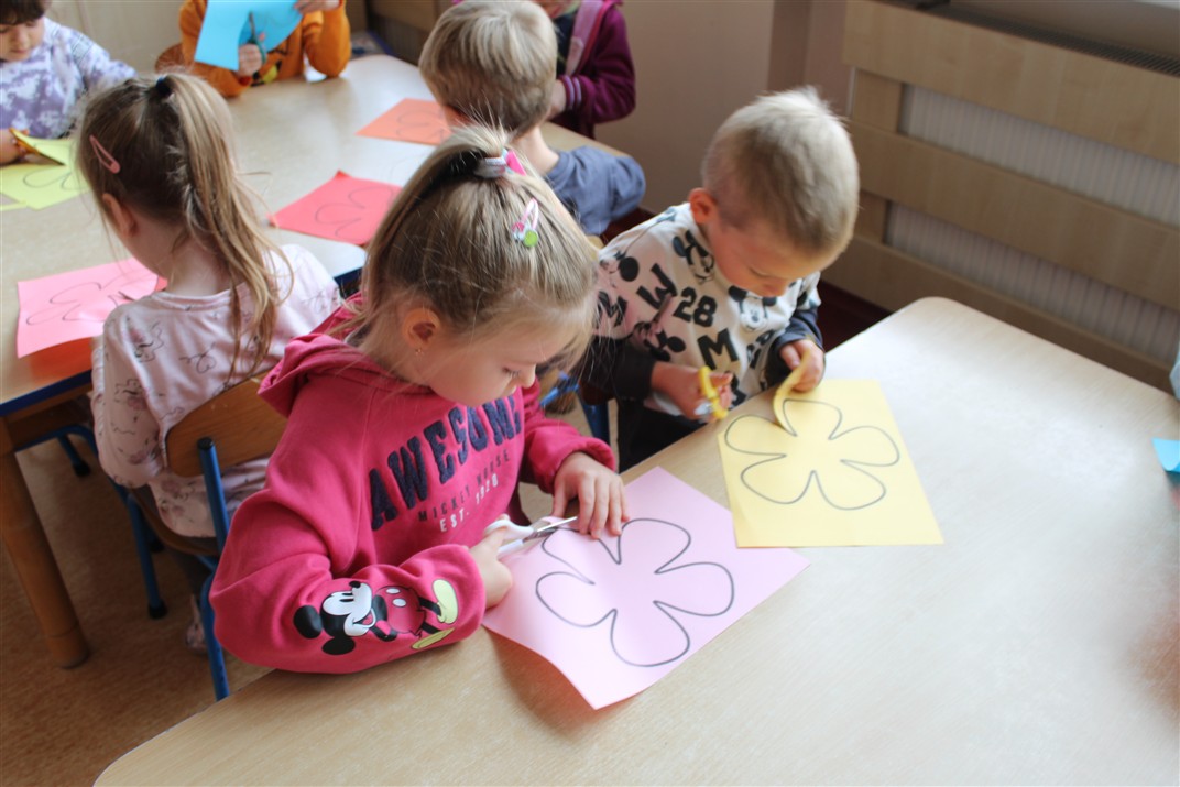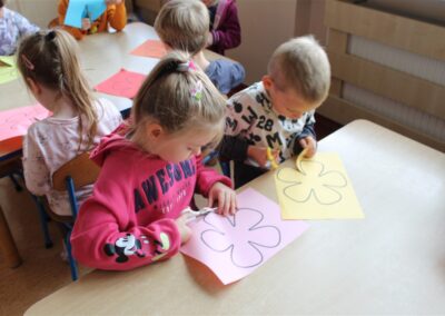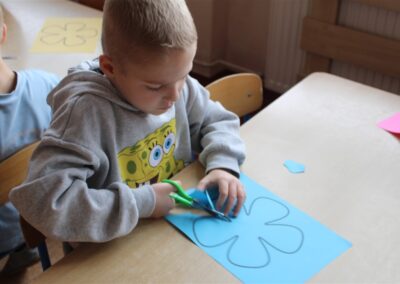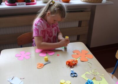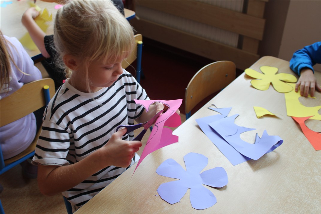 - usprawniały dłonie podczas wycinania kwiatów, lepienia z plasteliny, ćwiczeń grafomotorycznych…