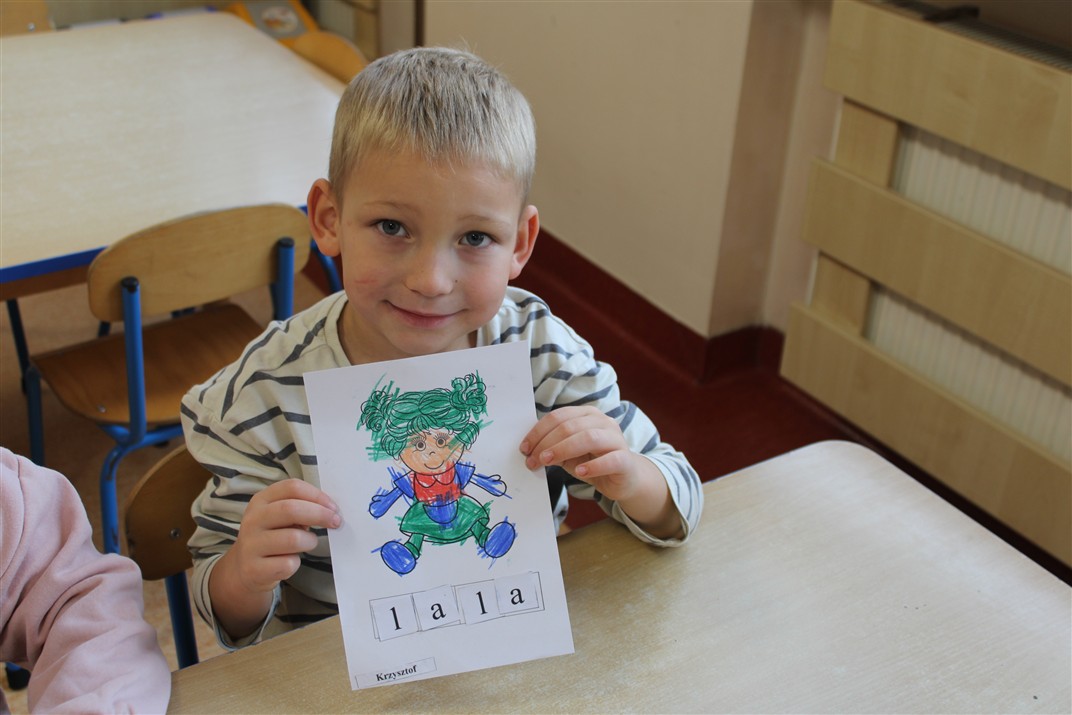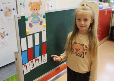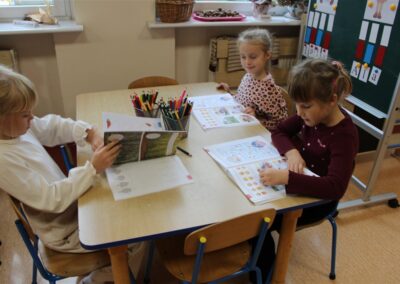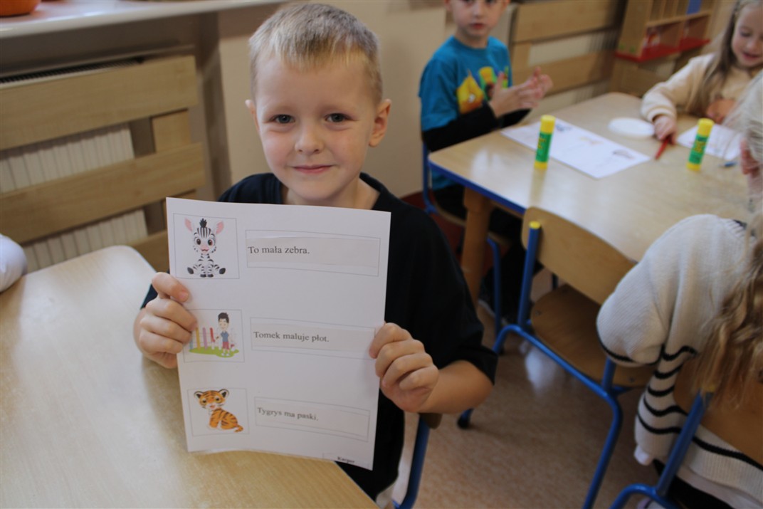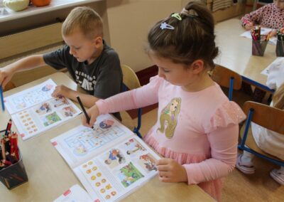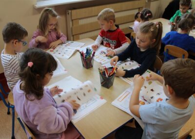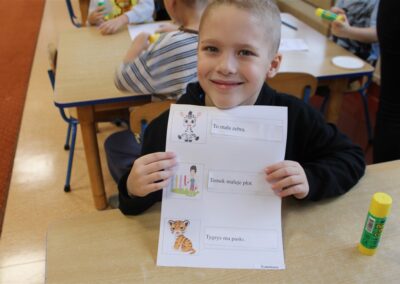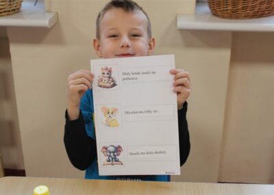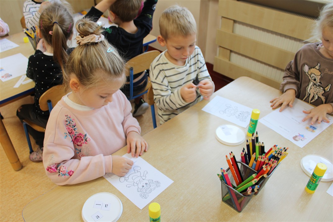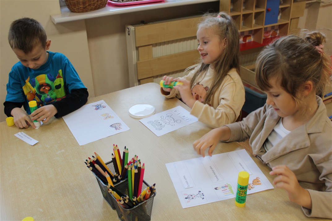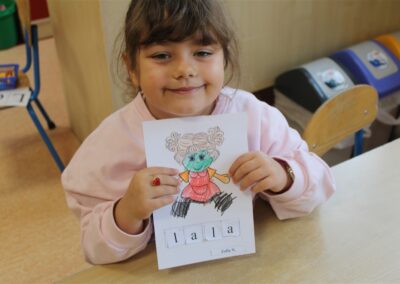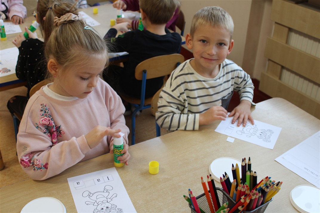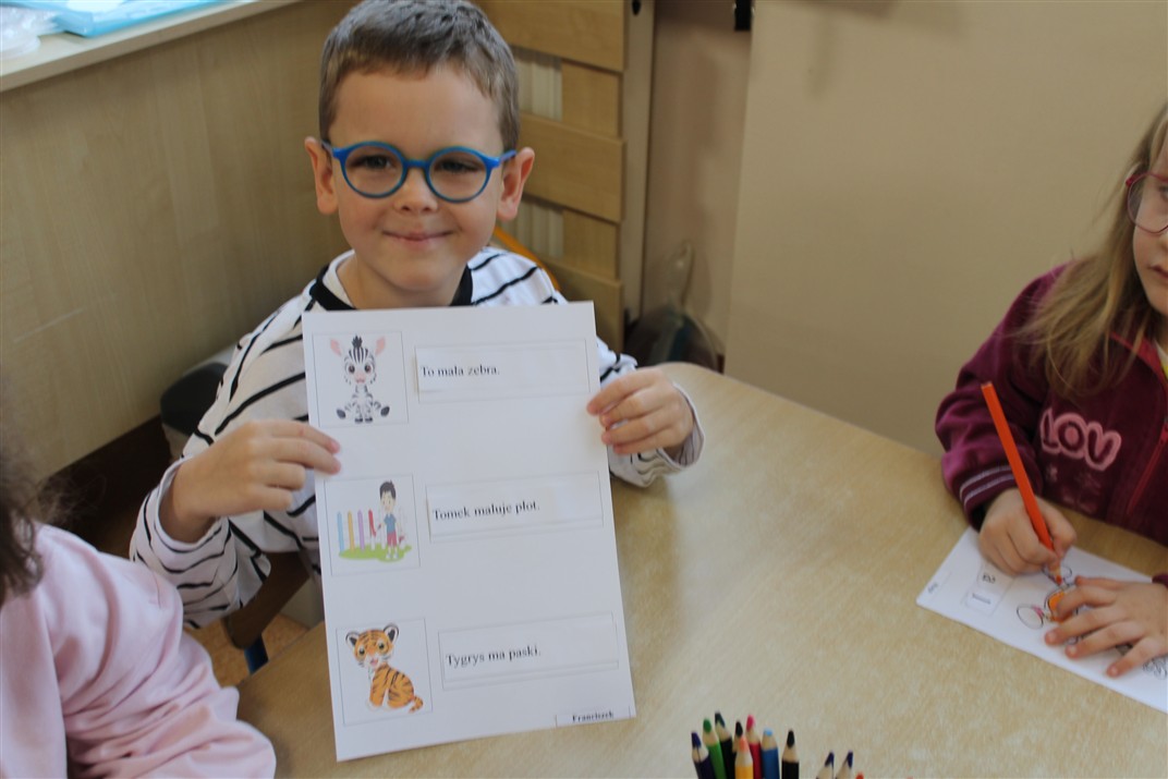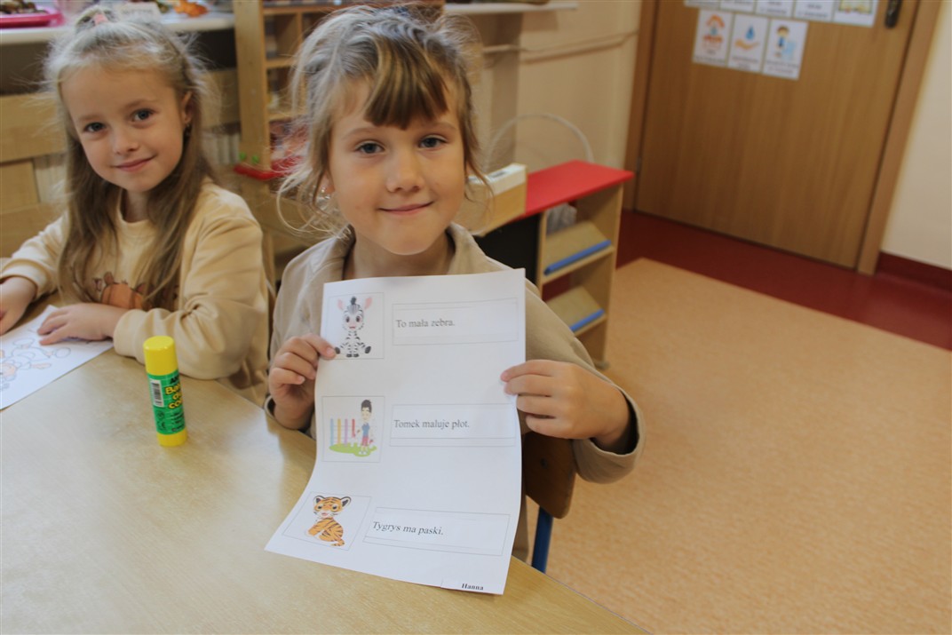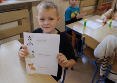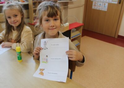 - rozwijały zainteresowanie literami i wykonywały pierwsze napisy z użyciem poznanych liter lub dobierały zdania do odpowiednich ilustracji – według indywidualnych możliwości