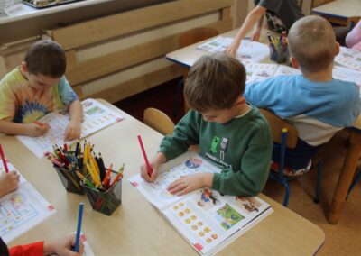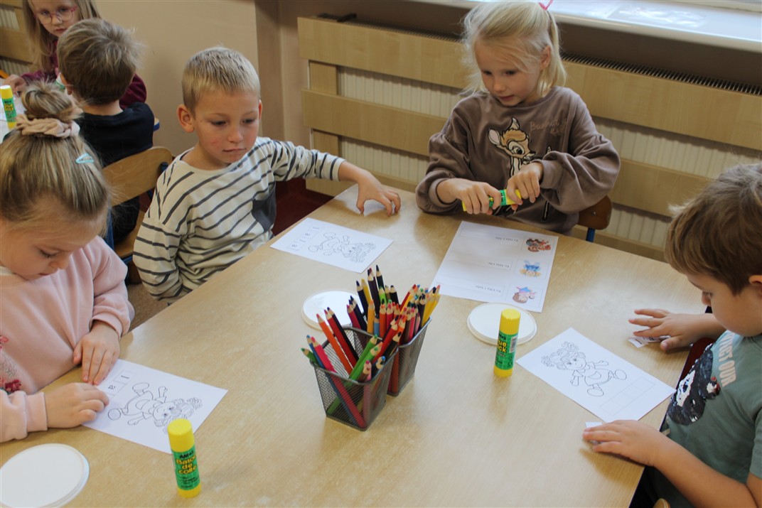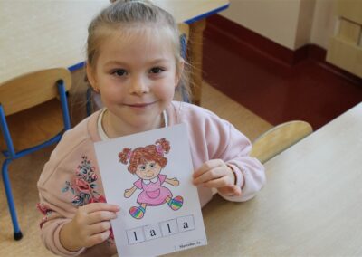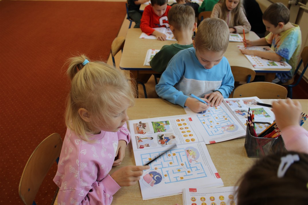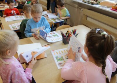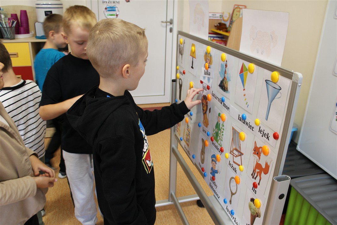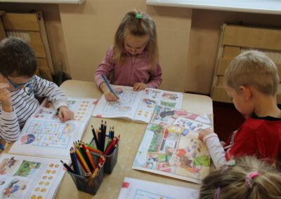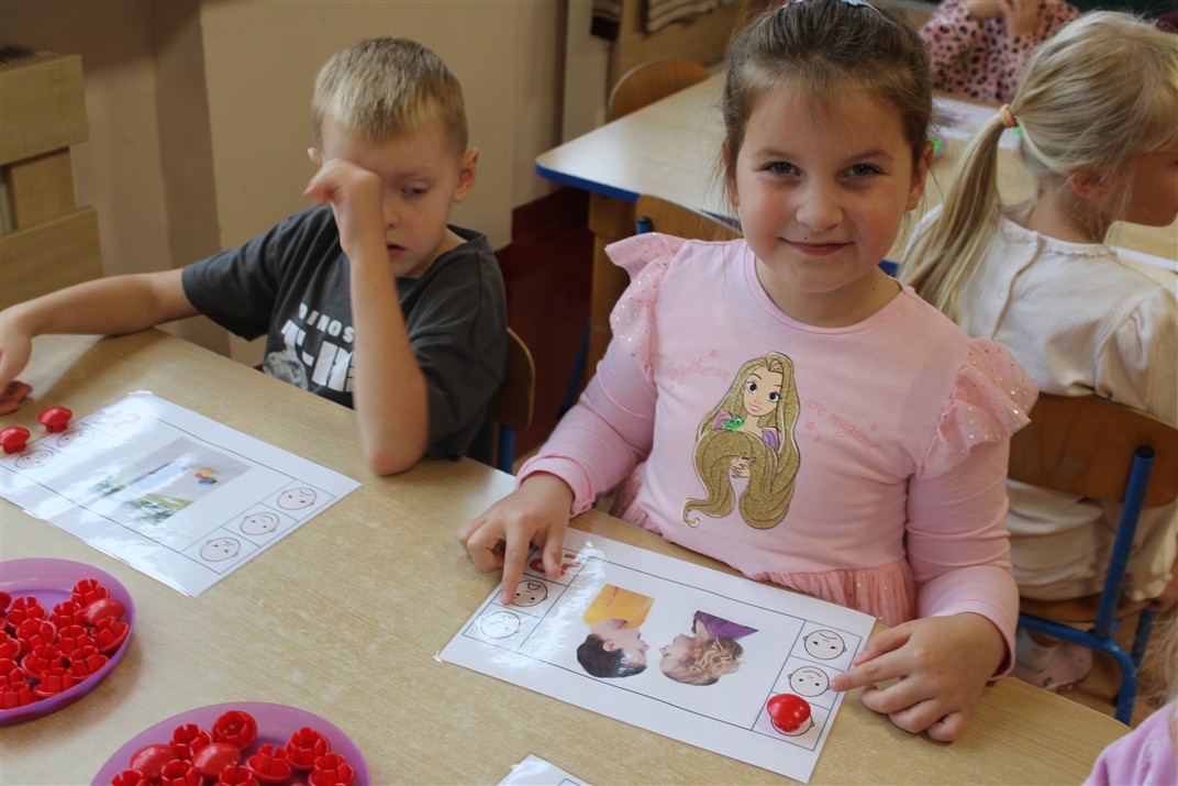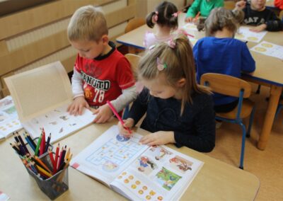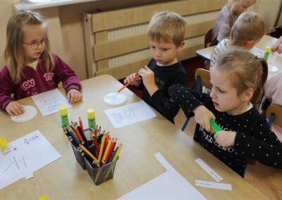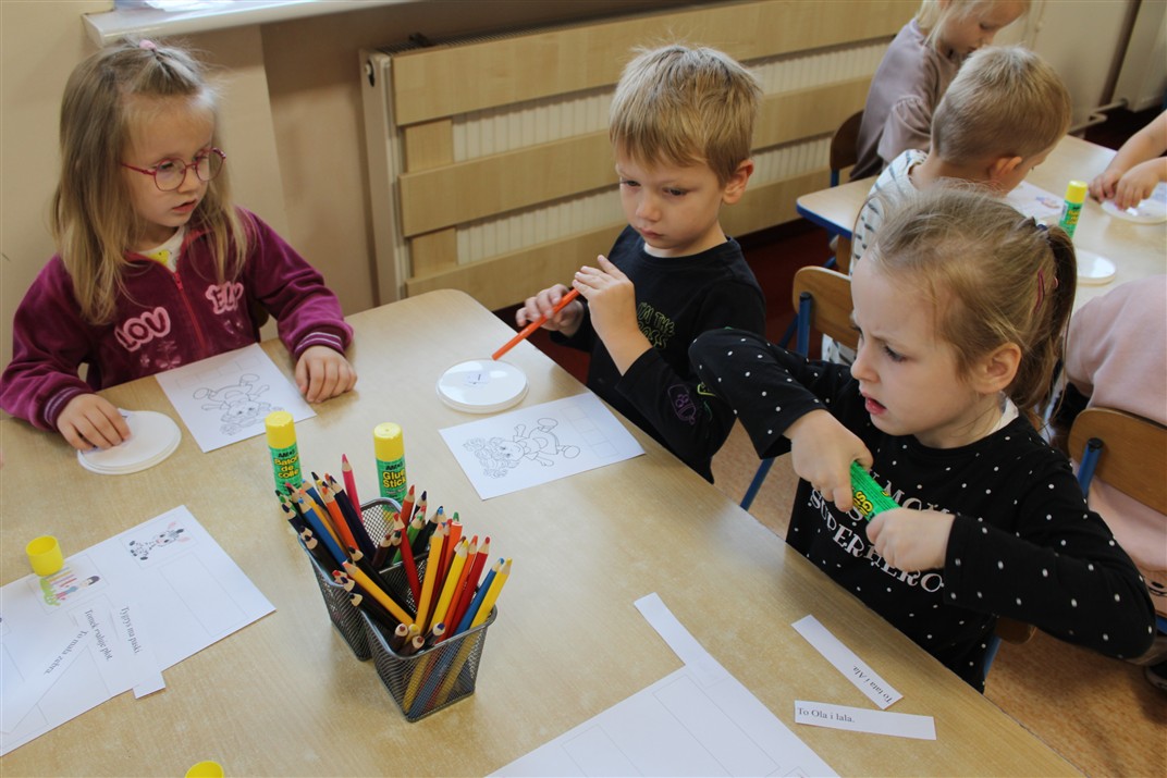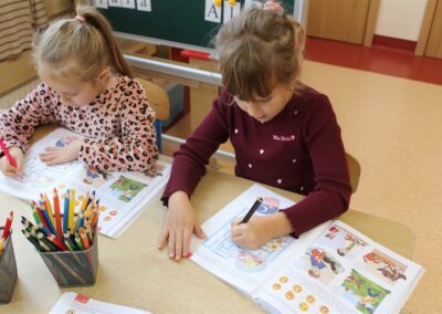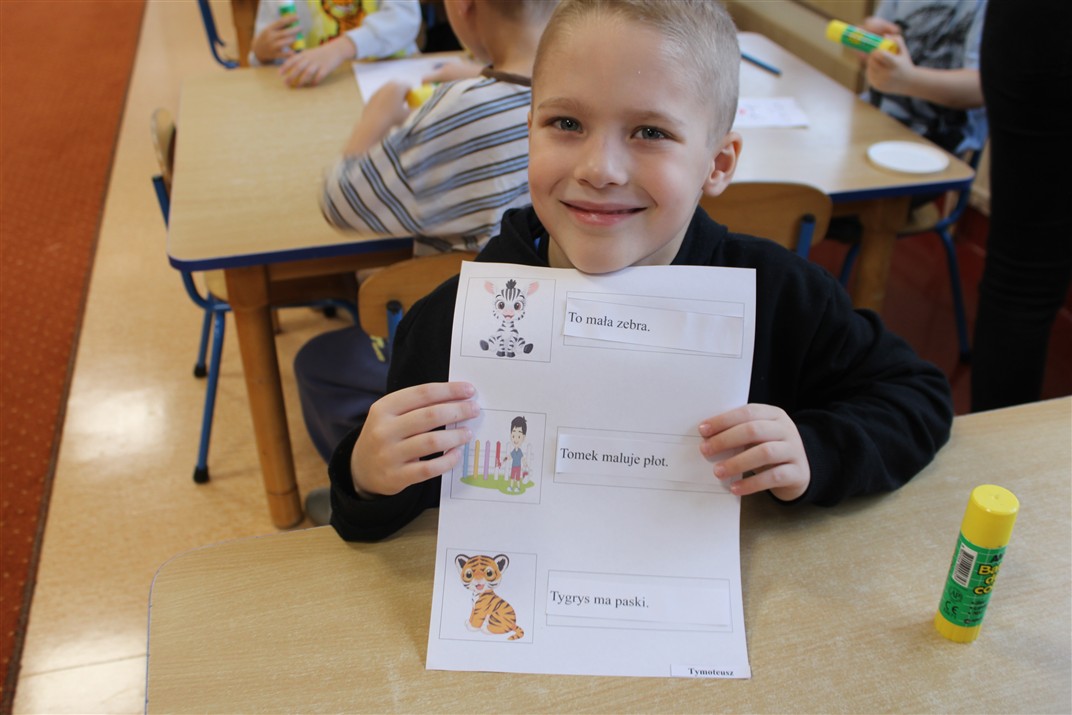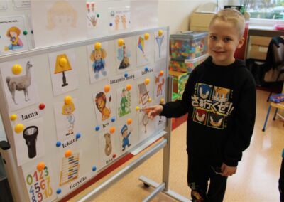 - rozwijały zainteresowanie literami i wykonywały pierwsze napisy z użyciem poznanych liter lub dobierały zdania do odpowiednich ilustracji – według indywidualnych możliwości