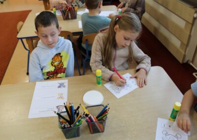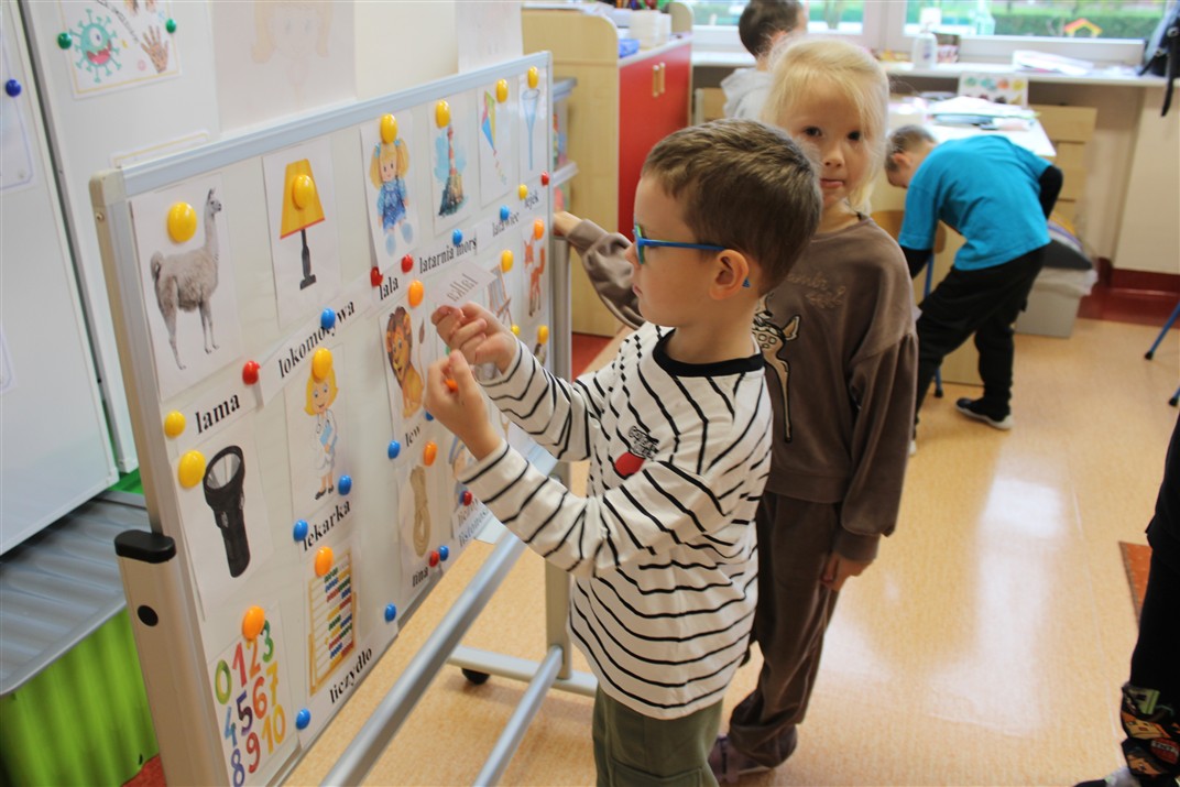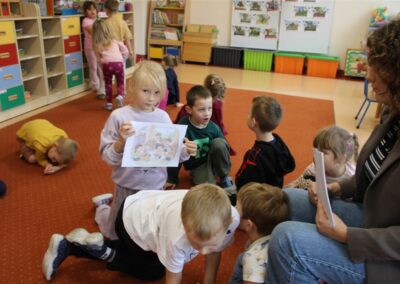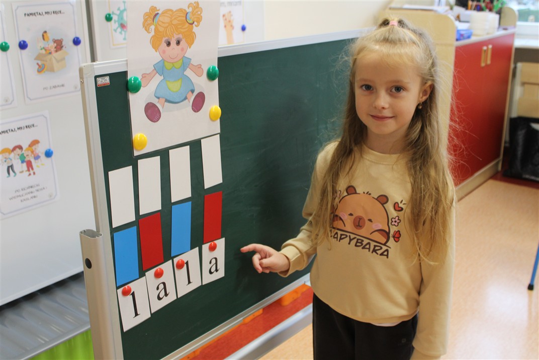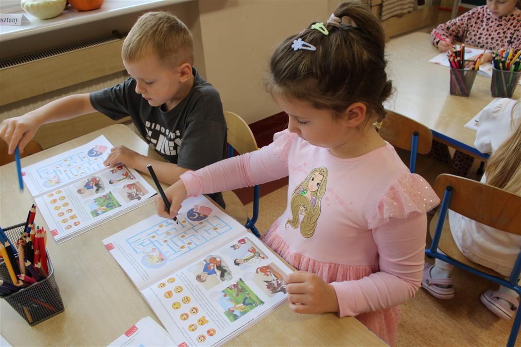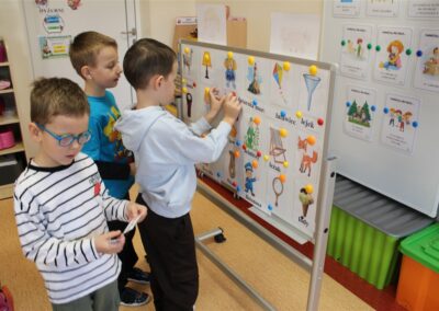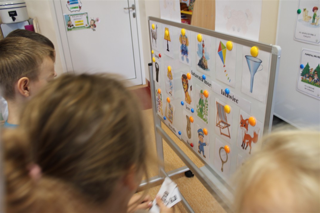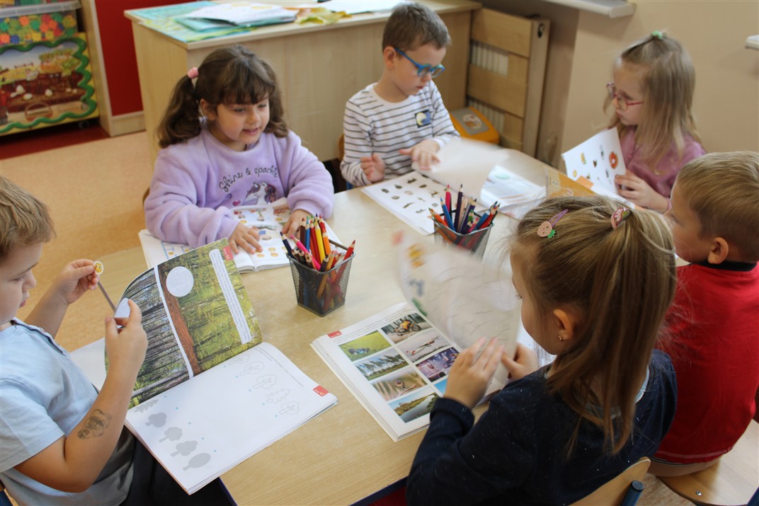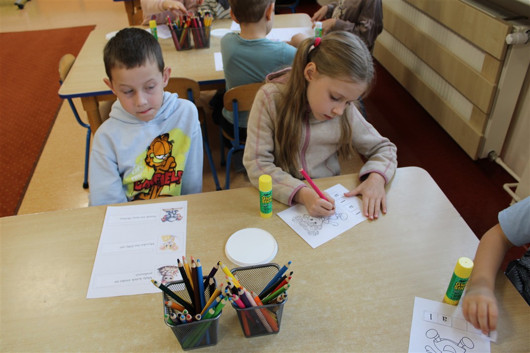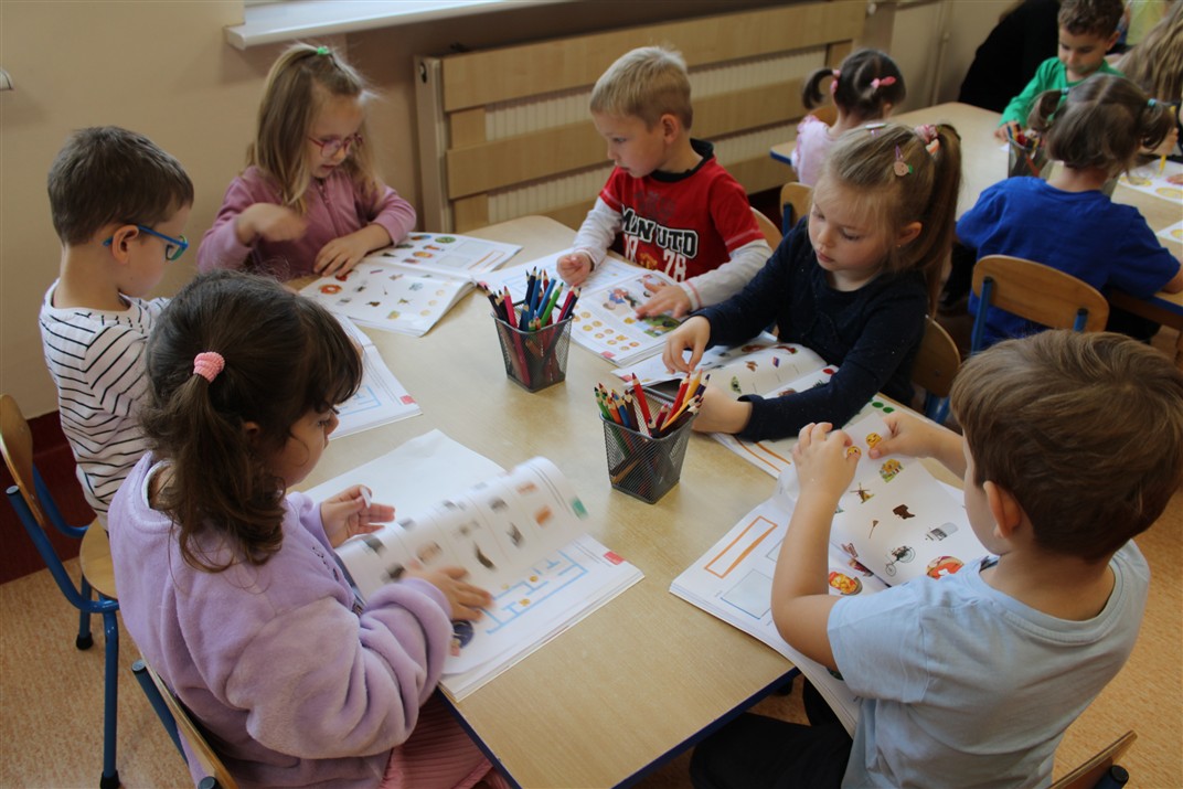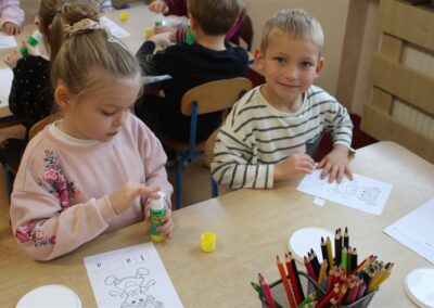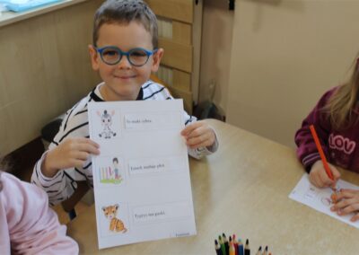 - rozwijały zainteresowanie literami i wykonywały pierwsze napisy z użyciem poznanych liter lub dobierały zdania do odpowiednich ilustracji – według indywidualnych możliwości