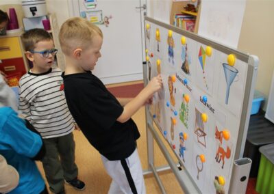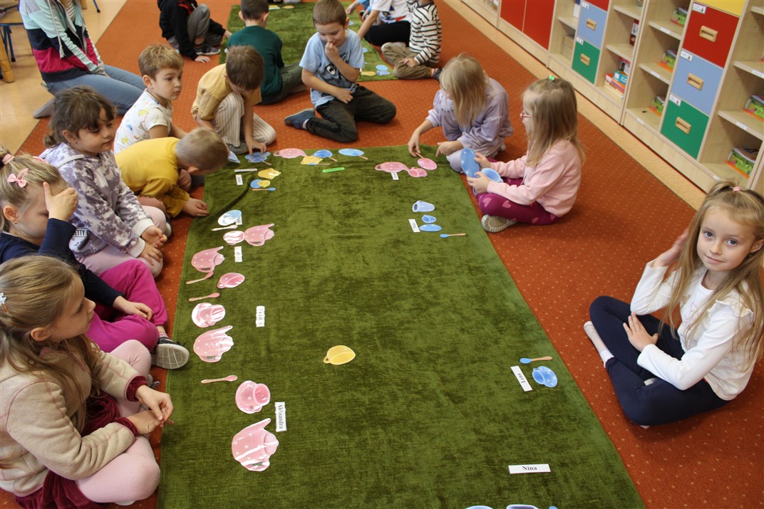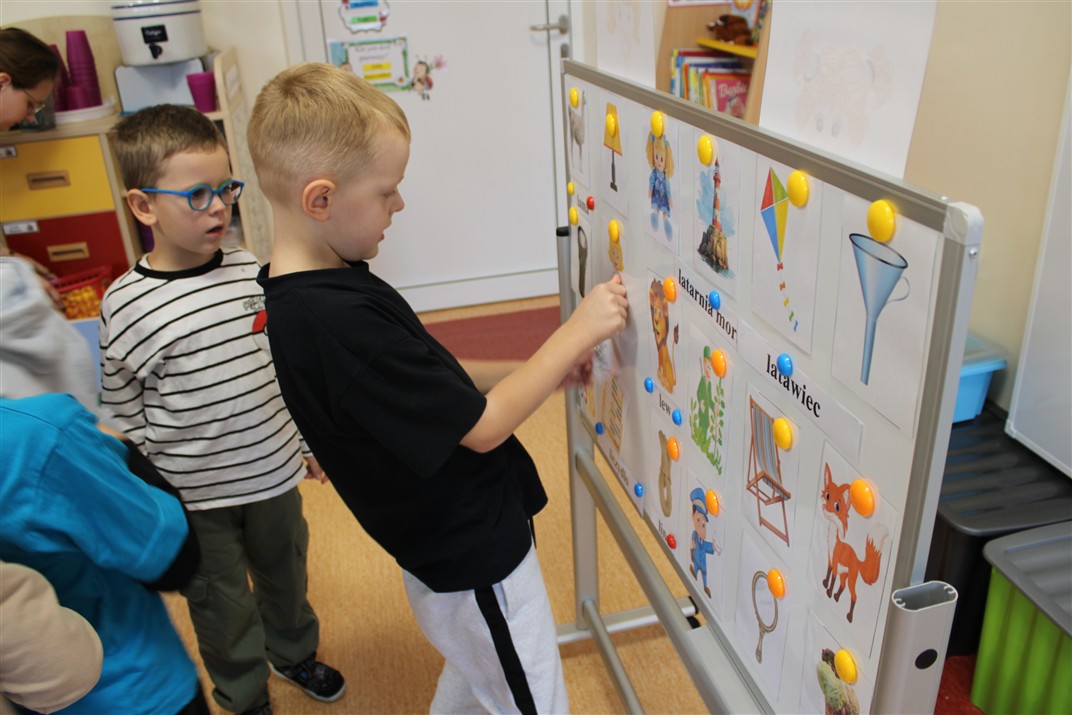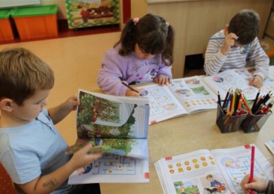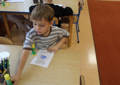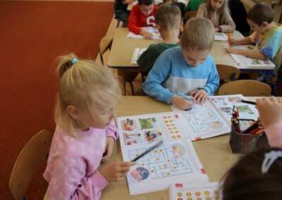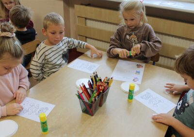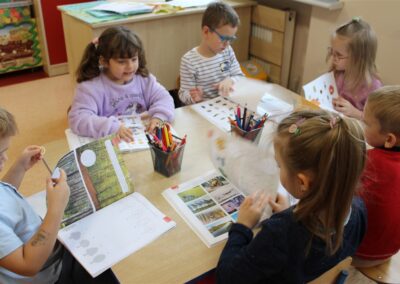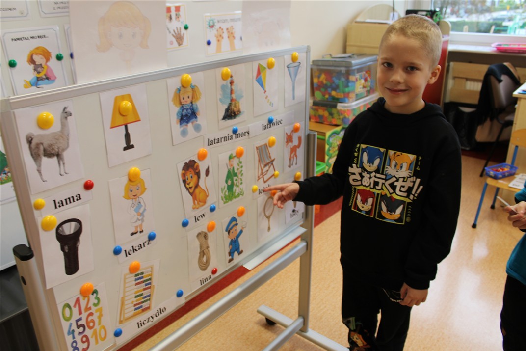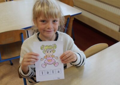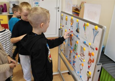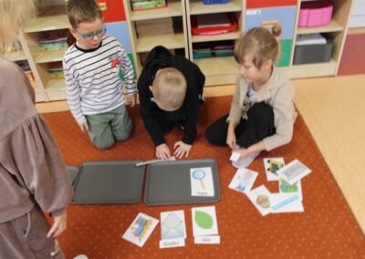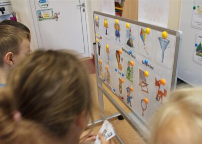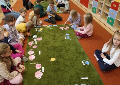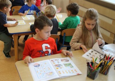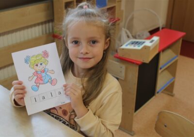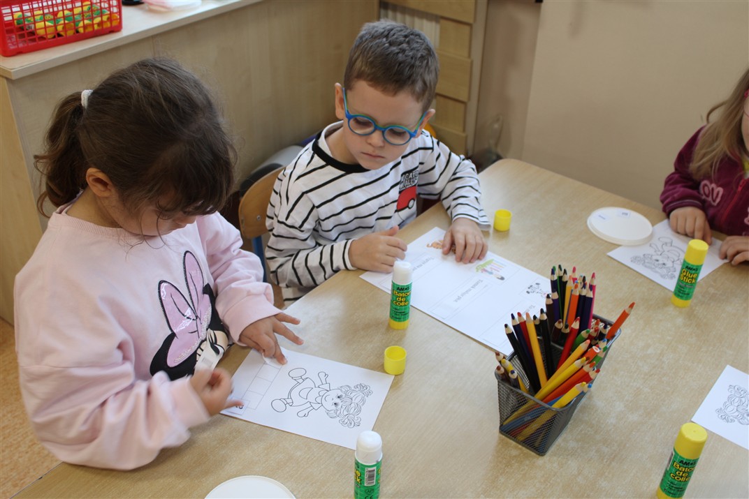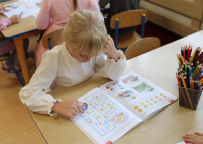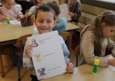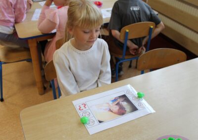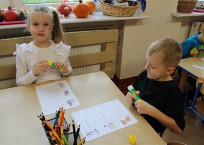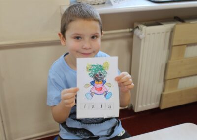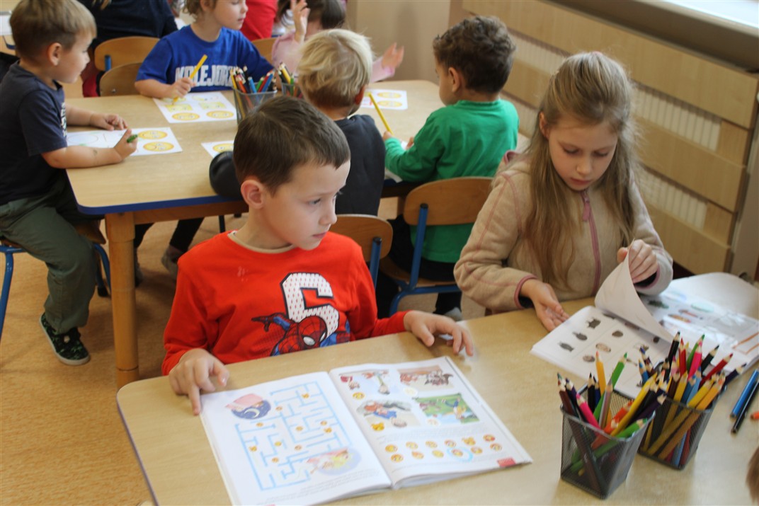 - rozwijały zainteresowanie literami i wykonywały pierwsze napisy z użyciem poznanych liter lub dobierały zdania do odpowiednich ilustracji – według indywidualnych możliwości