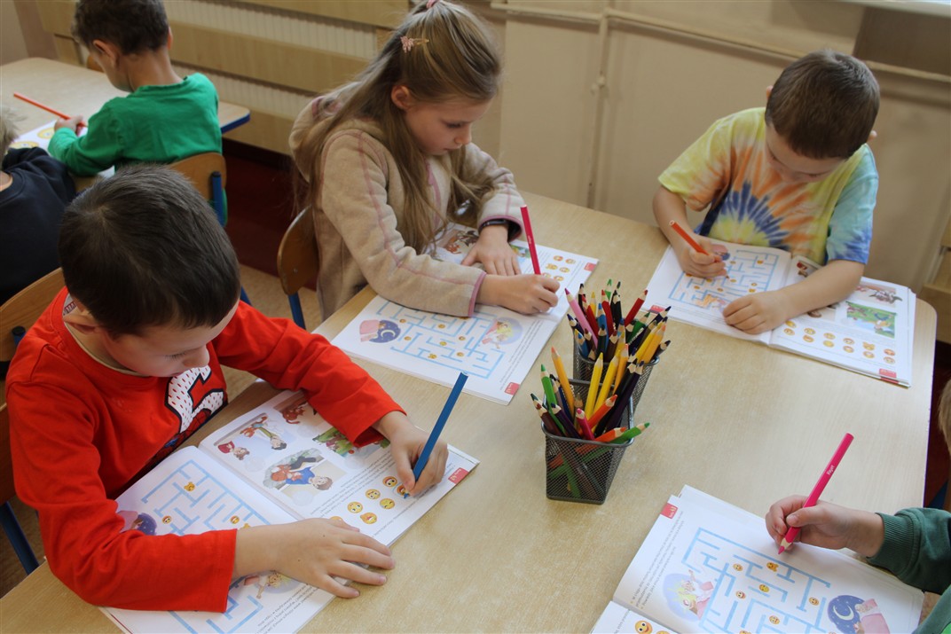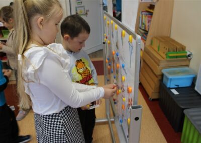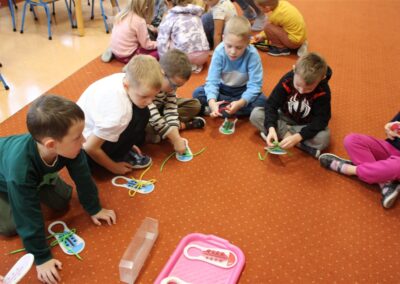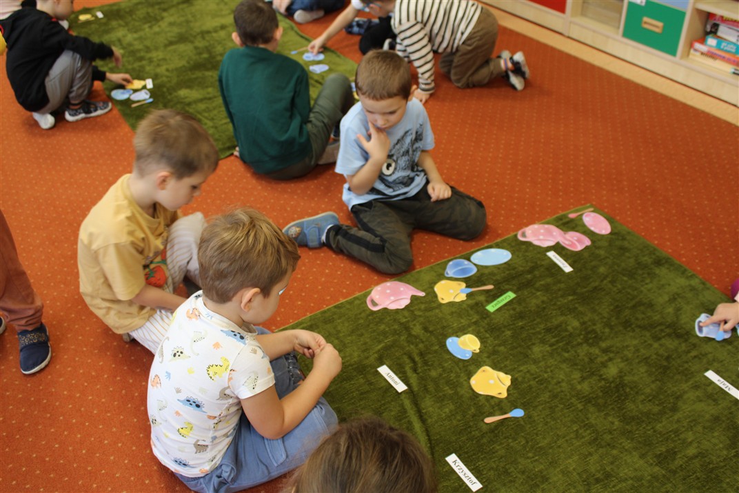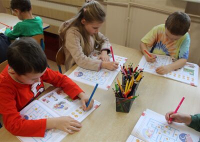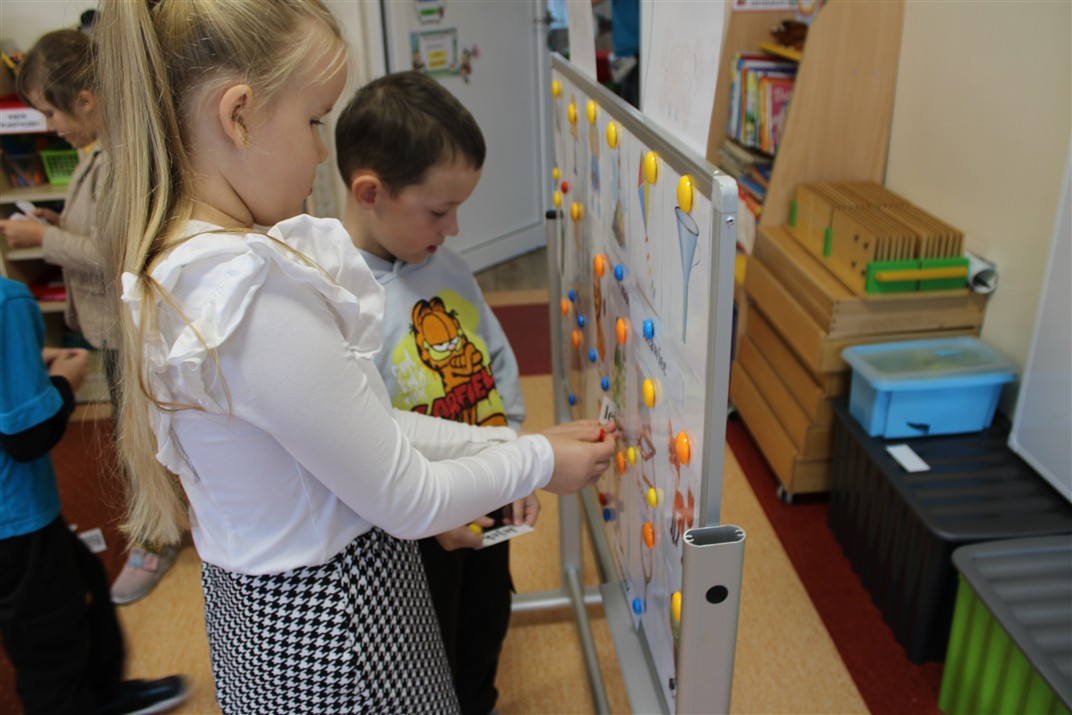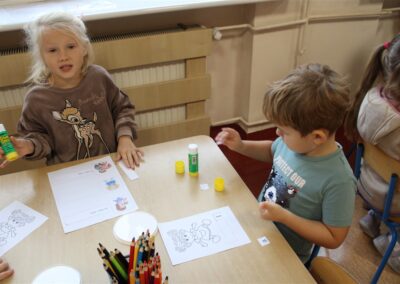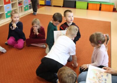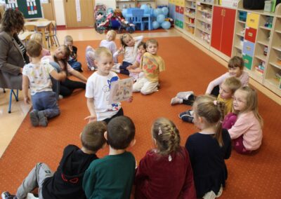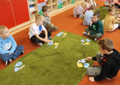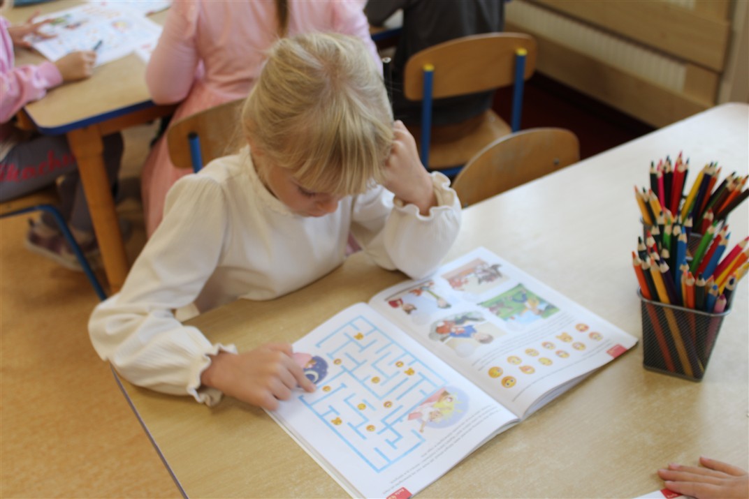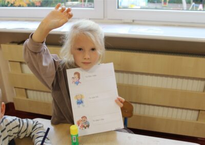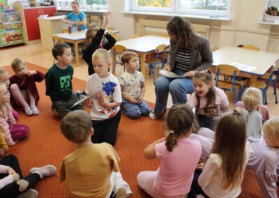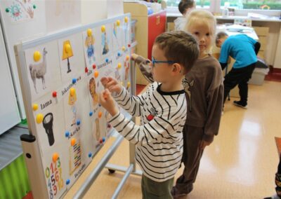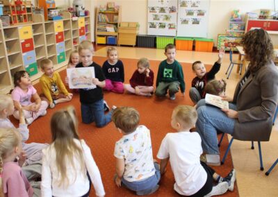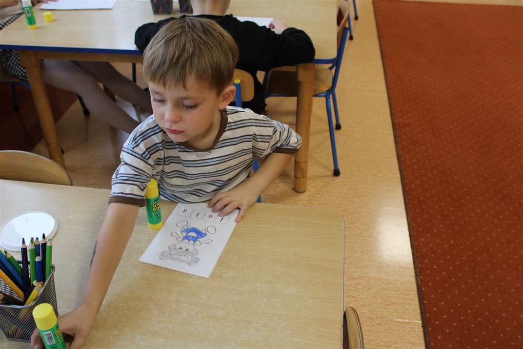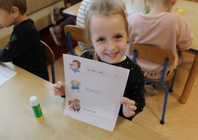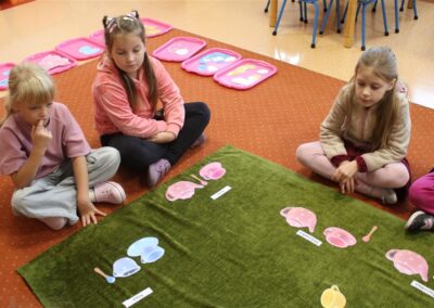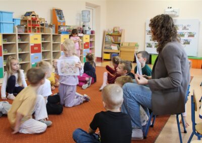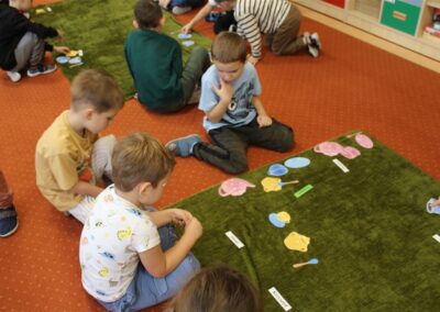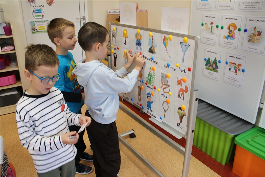 - rozwijały zainteresowanie literami i wykonywały pierwsze napisy z użyciem poznanych liter lub dobierały zdania do odpowiednich ilustracji – według indywidualnych możliwości