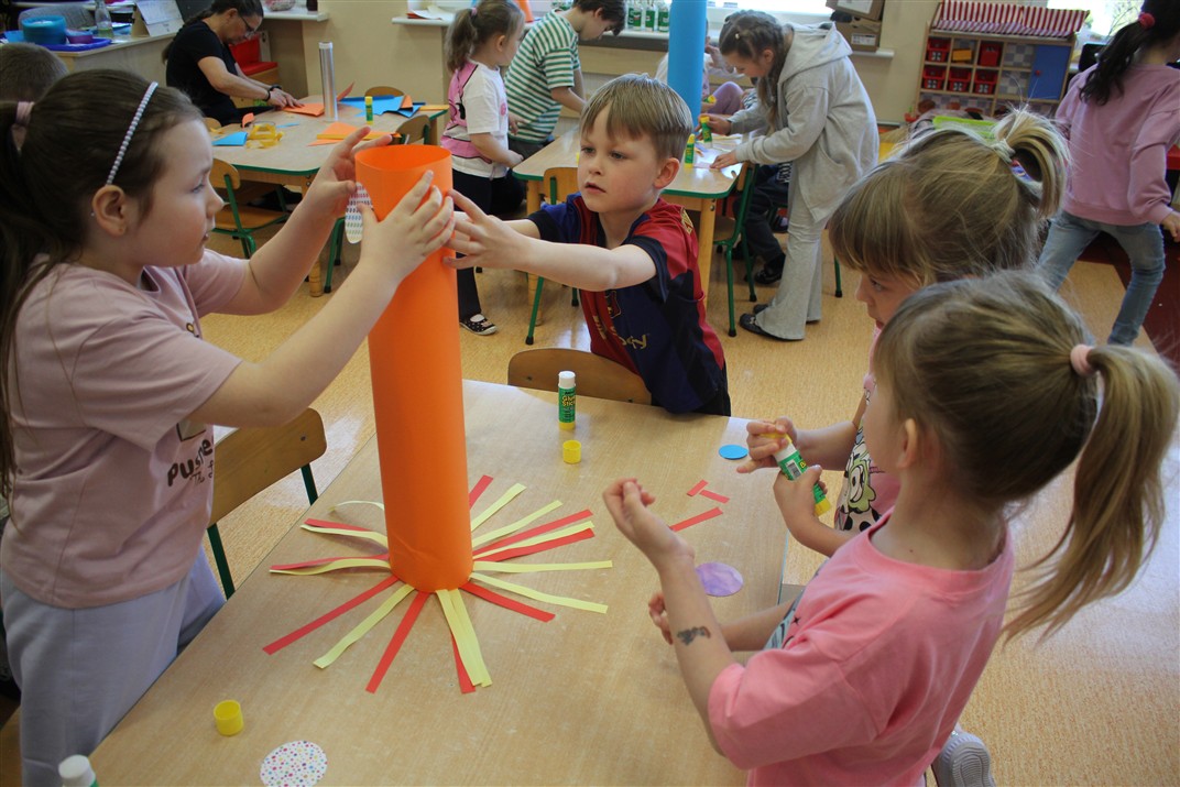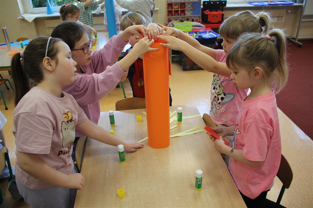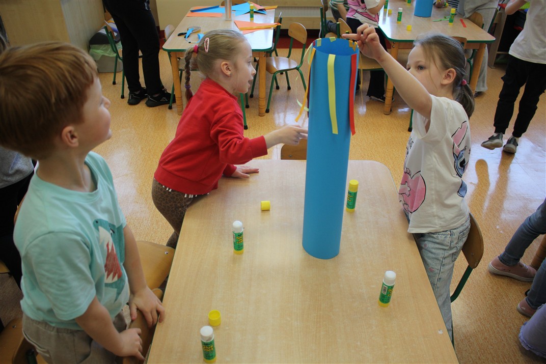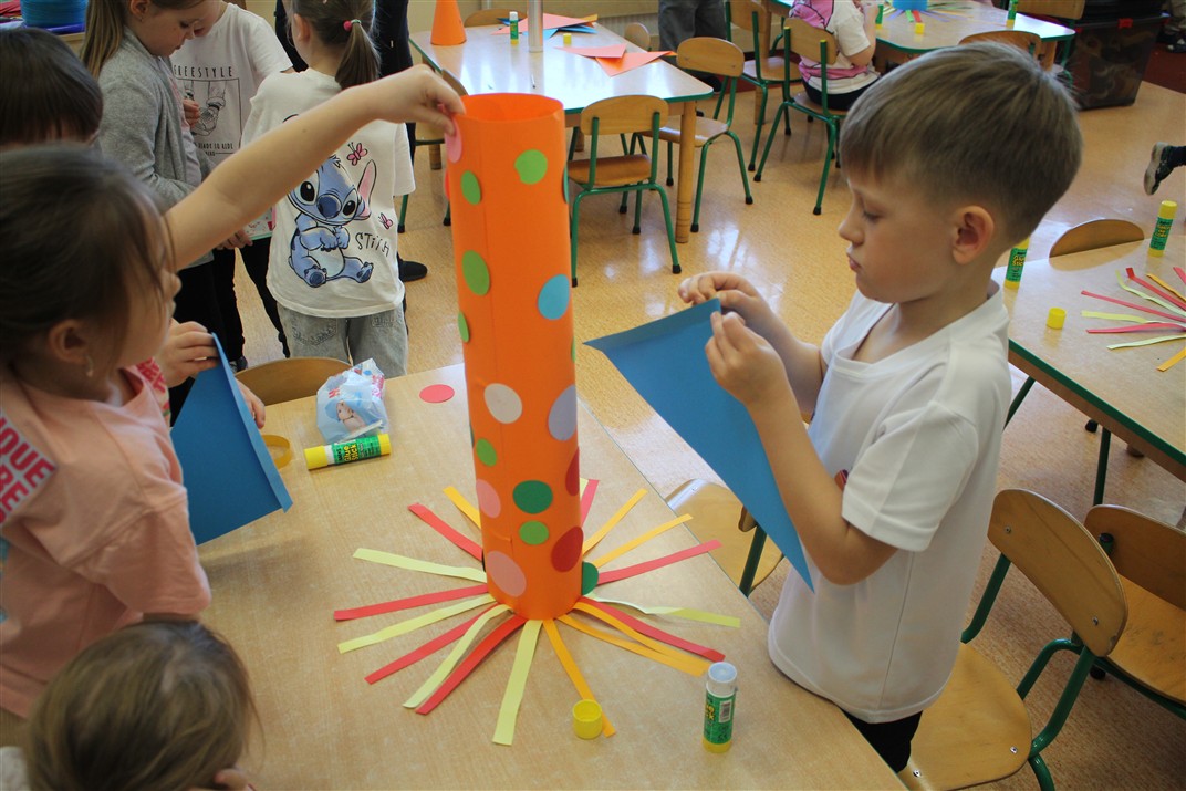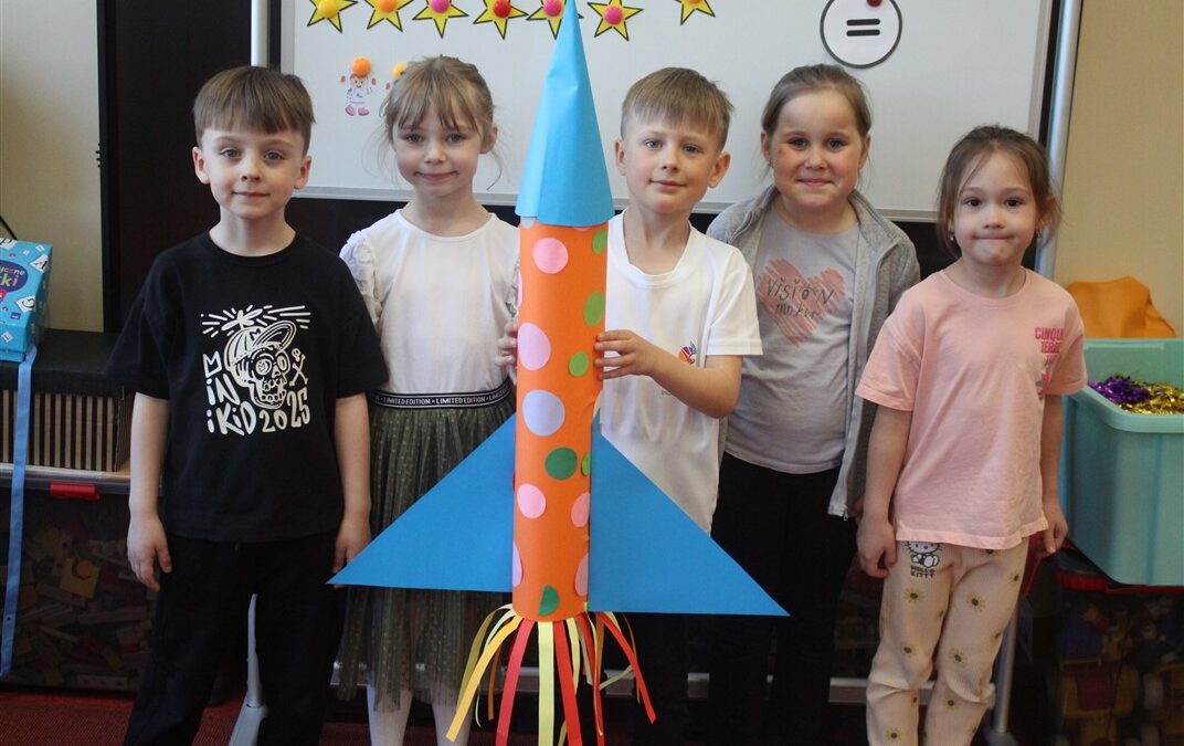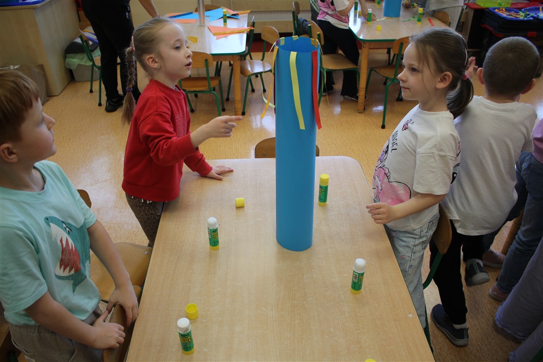 W środę 15 kwietnia przedszkolaki z grupy Myszek podczas kółka plastyczno – technicznego „Farby, kredki, pastele – plastyka ma technik wiele” wykonały pracę zespołową pt. „Rakieta” podczas którego: