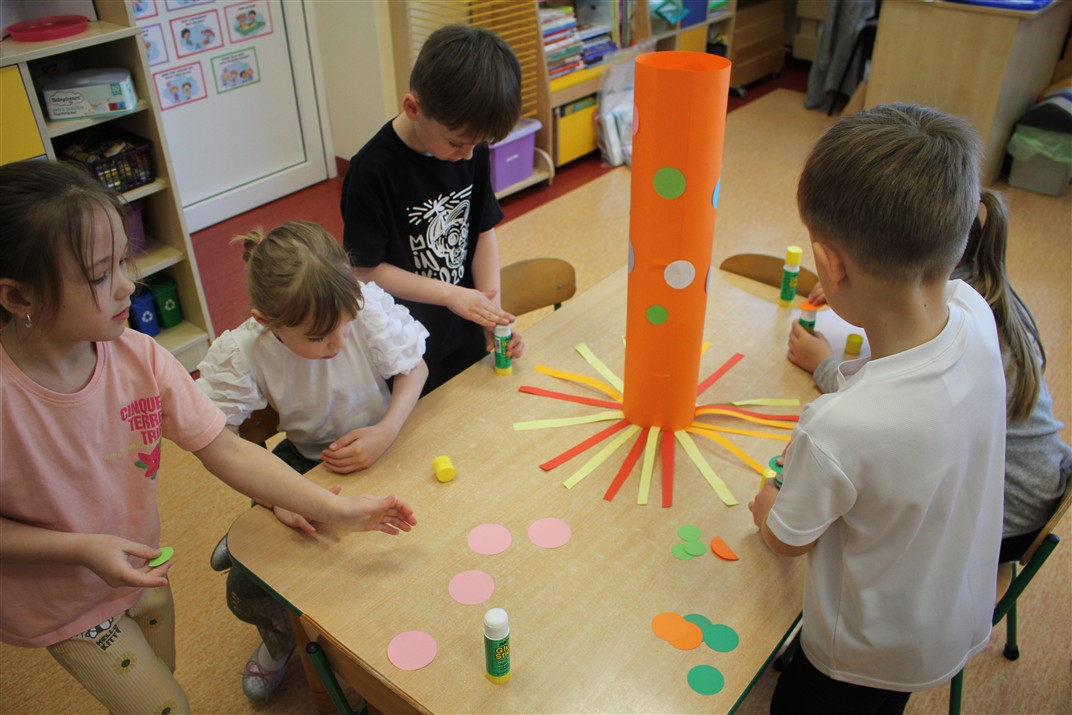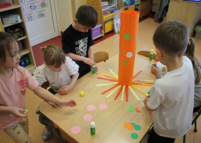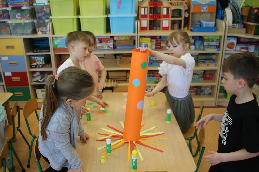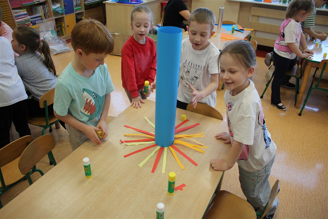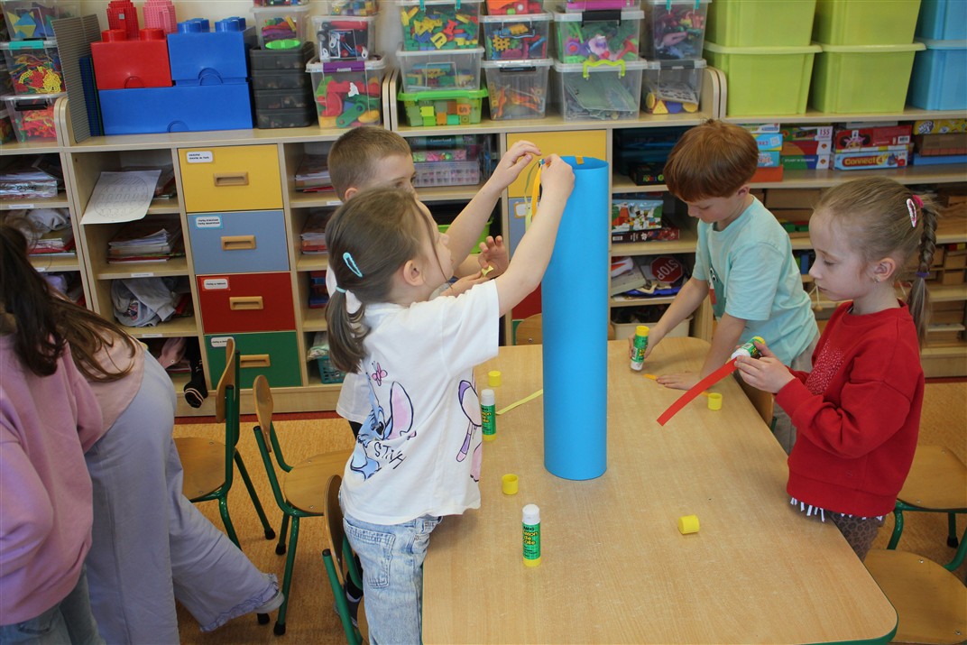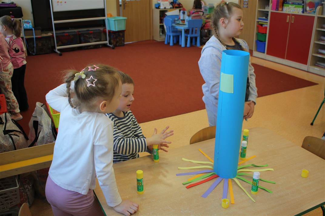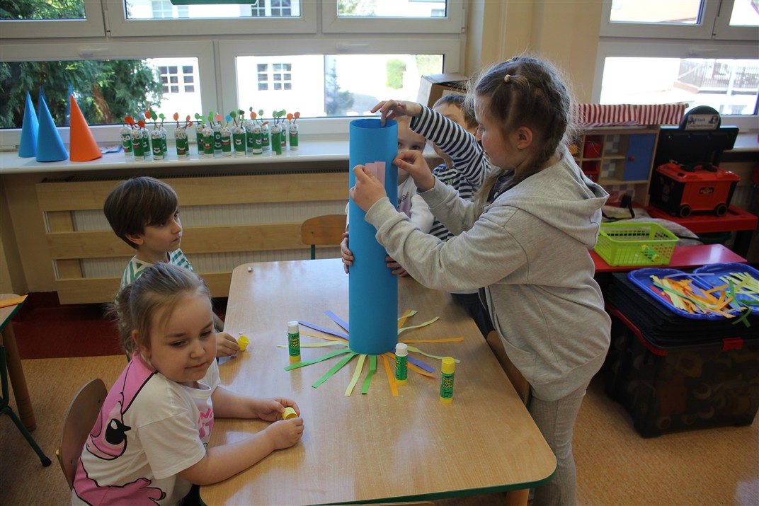 W środę 15 kwietnia przedszkolaki z grupy Myszek podczas kółka plastyczno – technicznego „Farby, kredki, pastele – plastyka ma technik wiele” wykonały pracę zespołową pt. „Rakieta” podczas którego: