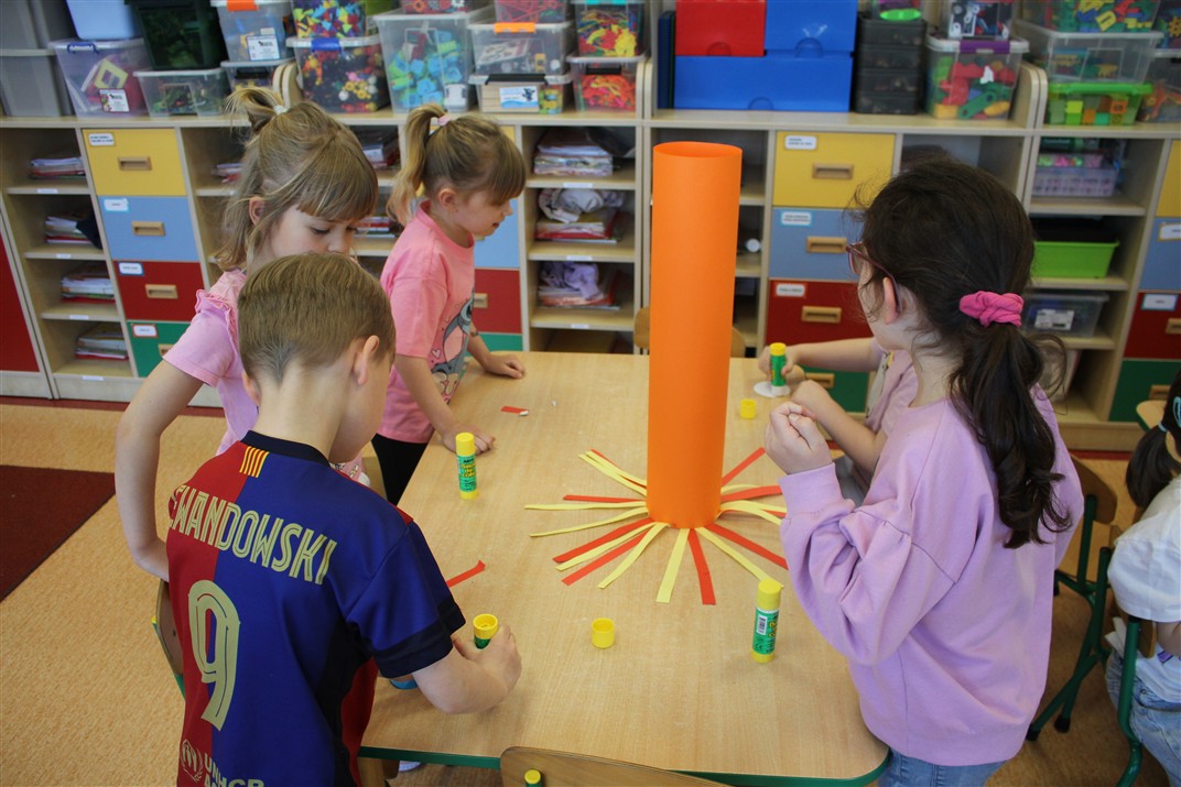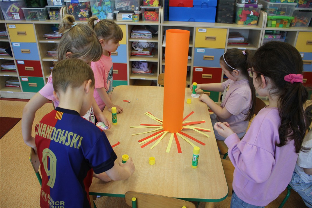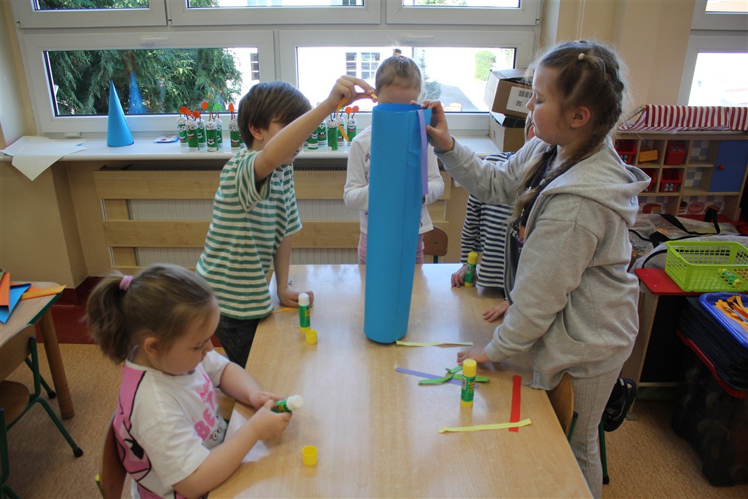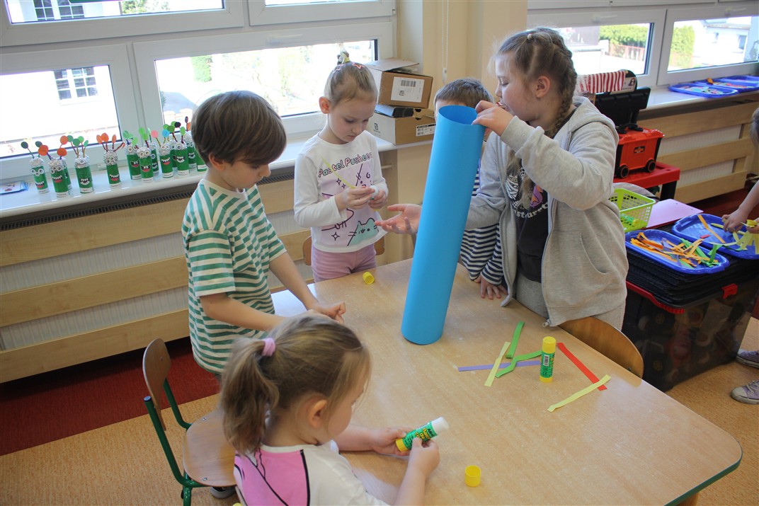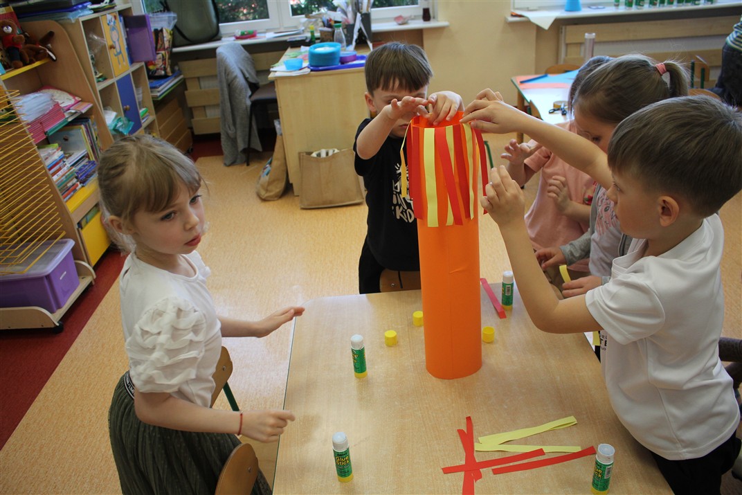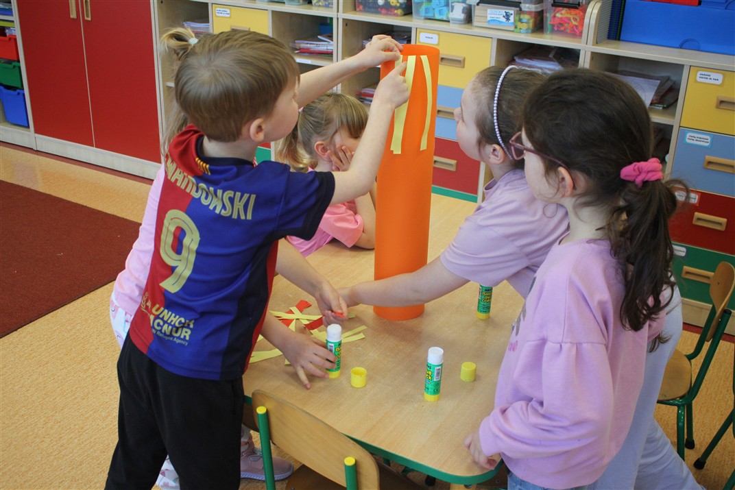 W środę 15 kwietnia przedszkolaki z grupy Myszek podczas kółka plastyczno – technicznego „Farby, kredki, pastele – plastyka ma technik wiele” wykonały pracę zespołową pt. „Rakieta” podczas którego: