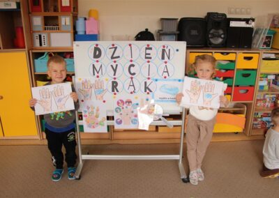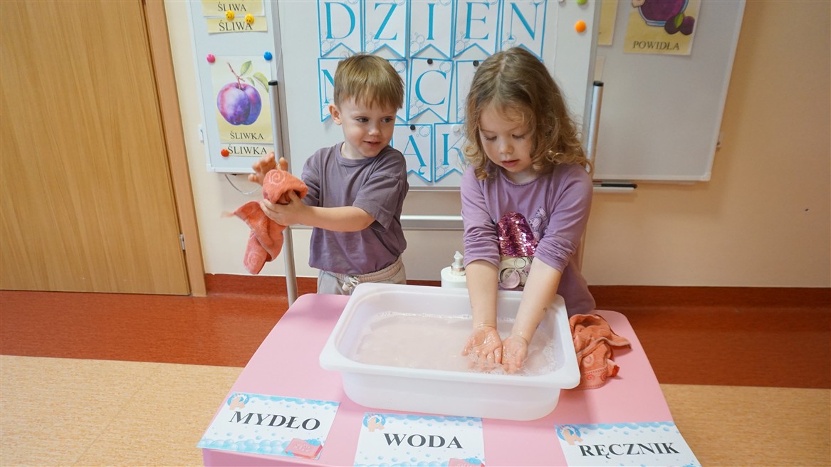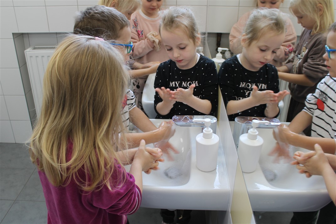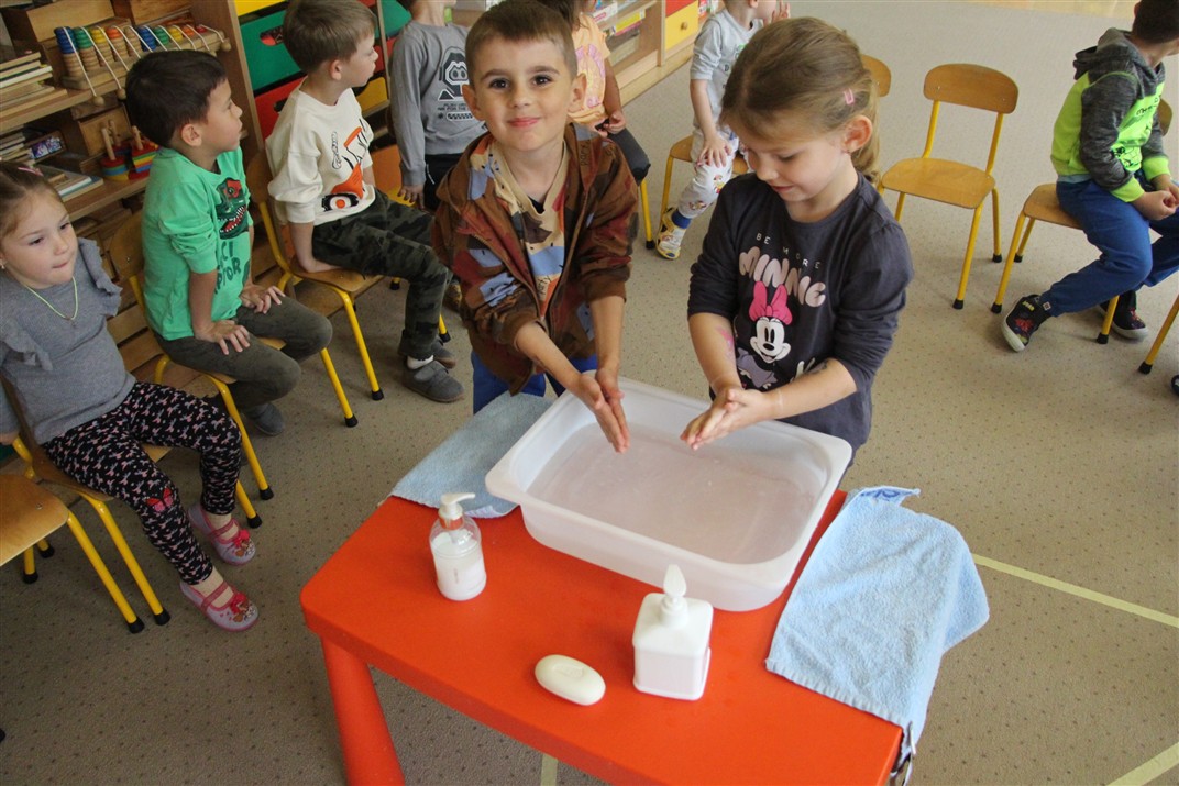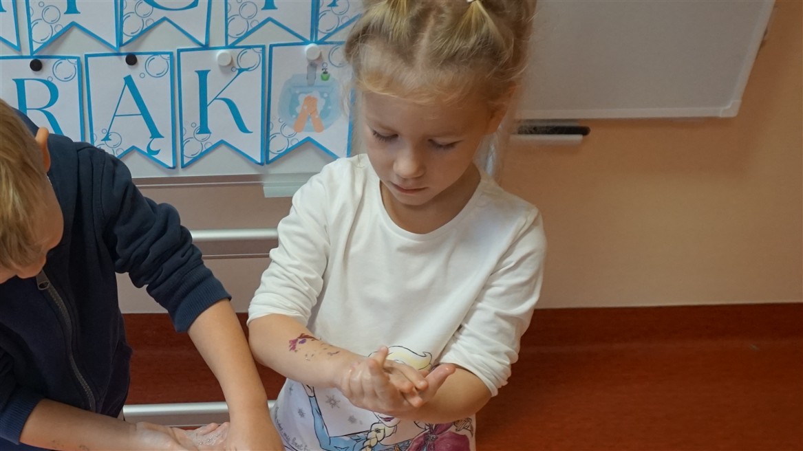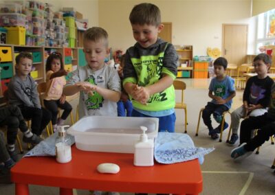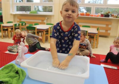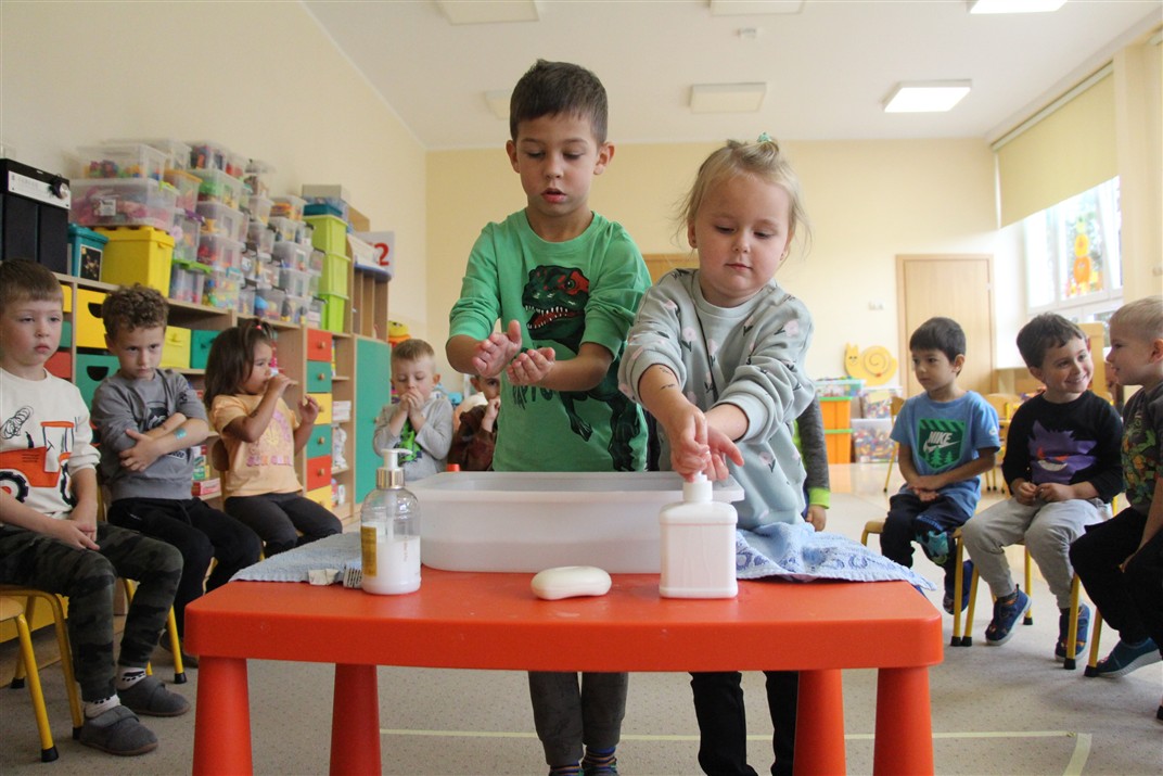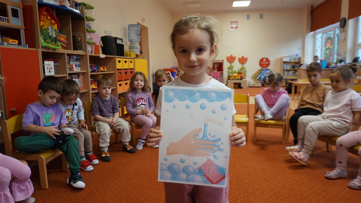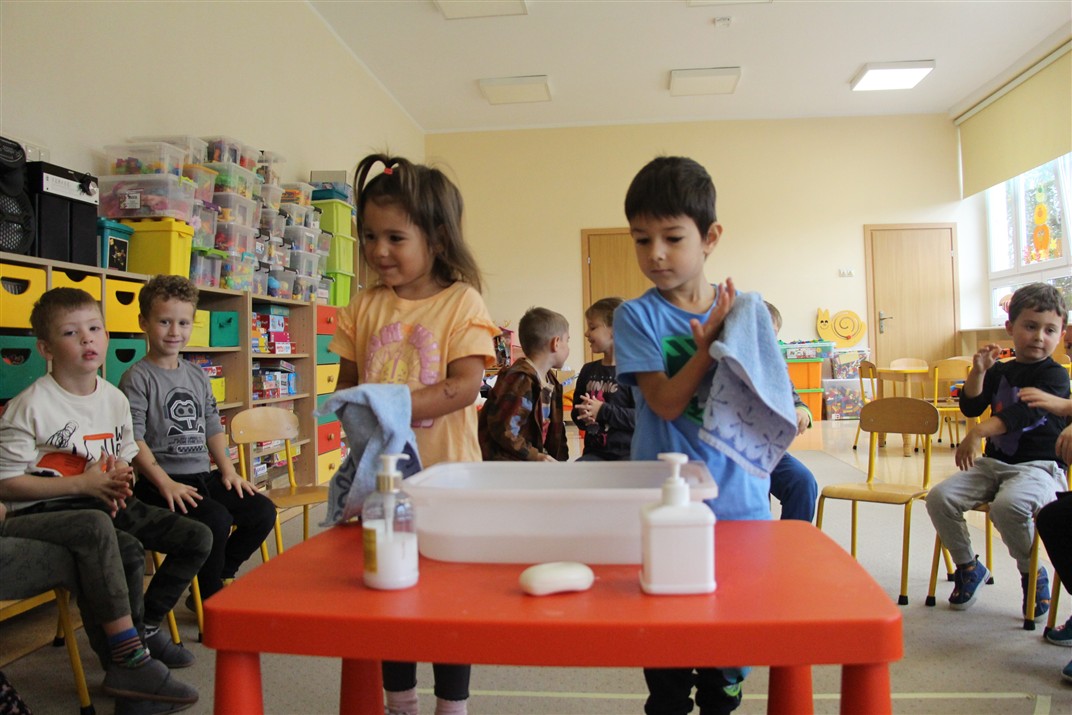 15 października przypada Światowy Dzień Mycia Rąk – święto ustanowione, by promować prawidłowe nawyki higieniczne, szczególnie wśród dzieci. W naszym przedszkolu również uczciliśmy ten dzień w wyjątkowy sposób, łącząc naukę z zabawą, aby uświadomić najmłodszym, jak ważne jest dbanie o czystość rąk. Dzieci podczas zajęć uczyły się prawidłowej techniki mycia rąk przy użyciu mydła i wody. Dowiedziały się również kiedy należy myć ręce. Eksperymentowały z „magicznym pieprzem” – prostym doświadczeniem, które pokazało, jak mydło „odstrasza” brud. Poznały różne rodzaje produktów przeznaczonych do mycia rąk oraz choroby wywołane nie myciem rąk. Dzieci nie tylko świetnie się bawiły, ale przede wszystkim wyniosły z tego dnia ważną lekcję – że mycie rąk to nie obowiązek, lecz codzienny nawyk, który może ochronić przed wieloma chorobami.