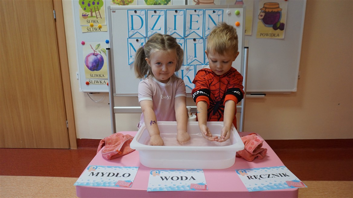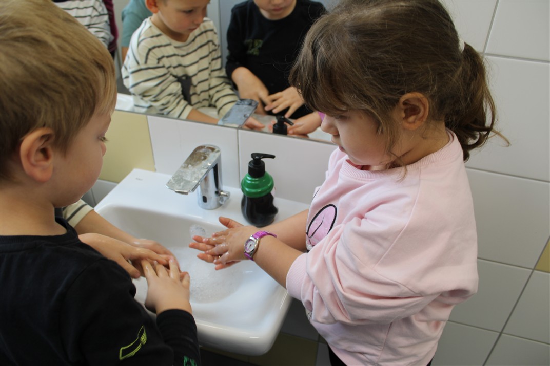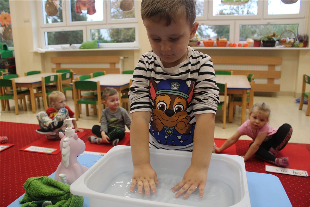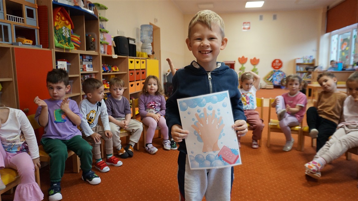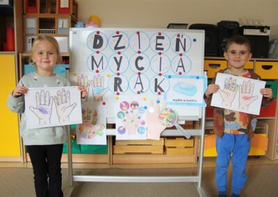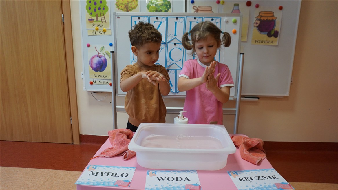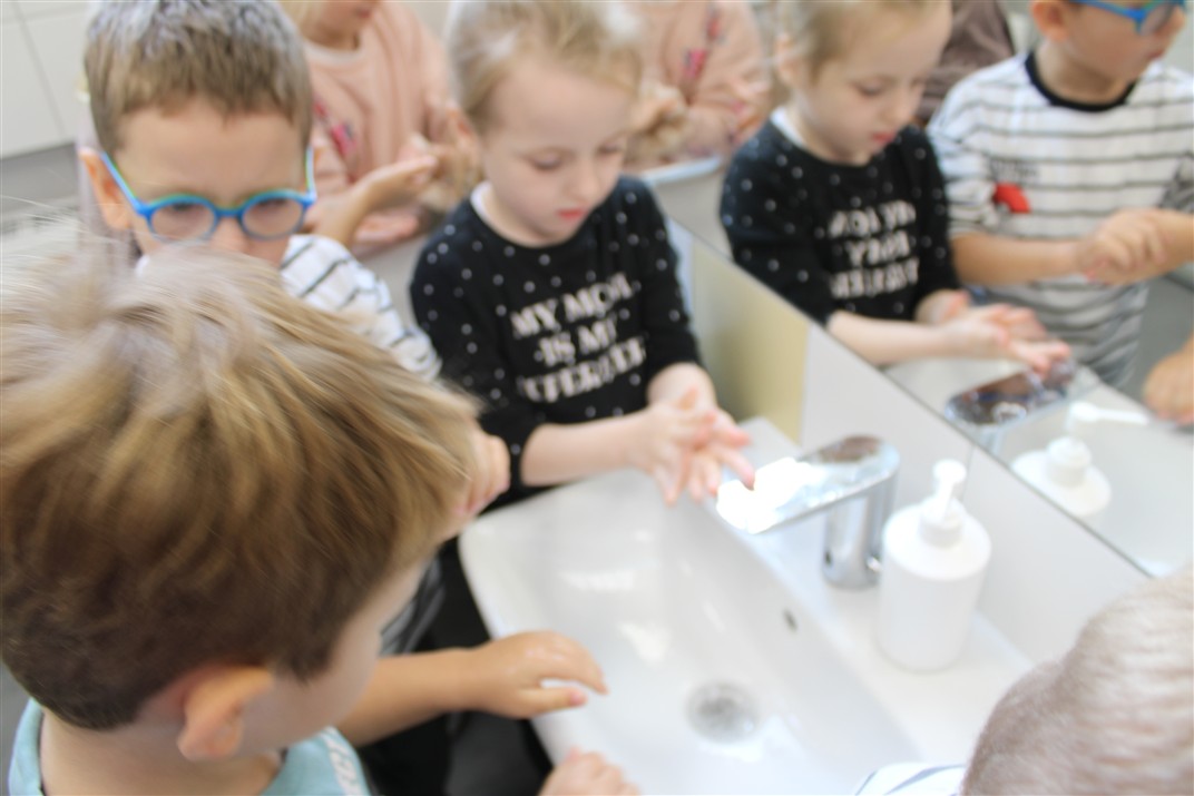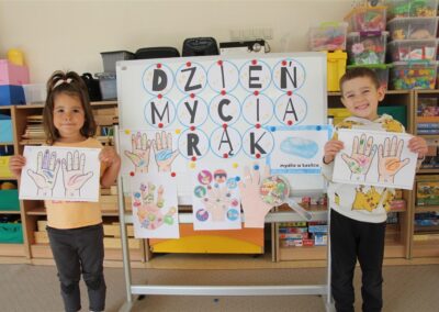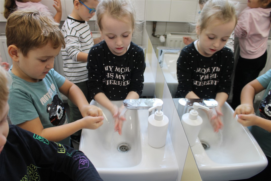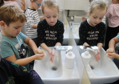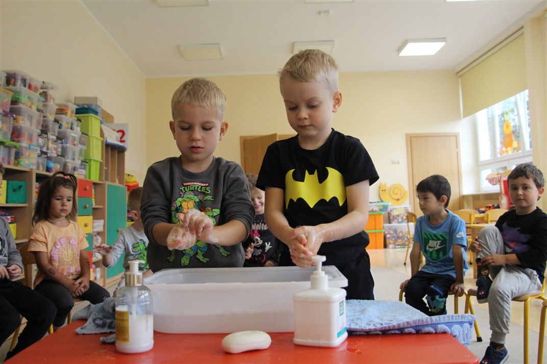 15 października przypada Światowy Dzień Mycia Rąk – święto ustanowione, by promować prawidłowe nawyki higieniczne, szczególnie wśród dzieci. W naszym przedszkolu również uczciliśmy ten dzień w wyjątkowy sposób, łącząc naukę z zabawą, aby uświadomić najmłodszym, jak ważne jest dbanie o czystość rąk. Dzieci podczas zajęć uczyły się prawidłowej techniki mycia rąk przy użyciu mydła i wody. Dowiedziały się również kiedy należy myć ręce. Eksperymentowały z „magicznym pieprzem” – prostym doświadczeniem, które pokazało, jak mydło „odstrasza” brud. Poznały różne rodzaje produktów przeznaczonych do mycia rąk oraz choroby wywołane nie myciem rąk. Dzieci nie tylko świetnie się bawiły, ale przede wszystkim wyniosły z tego dnia ważną lekcję – że mycie rąk to nie obowiązek, lecz codzienny nawyk, który może ochronić przed wieloma chorobami.