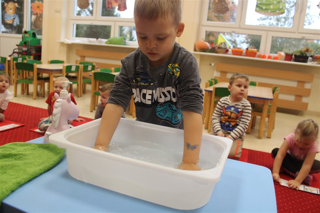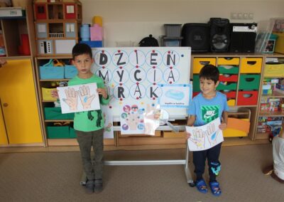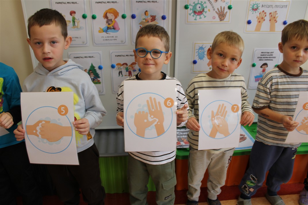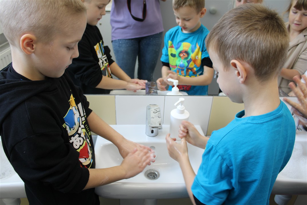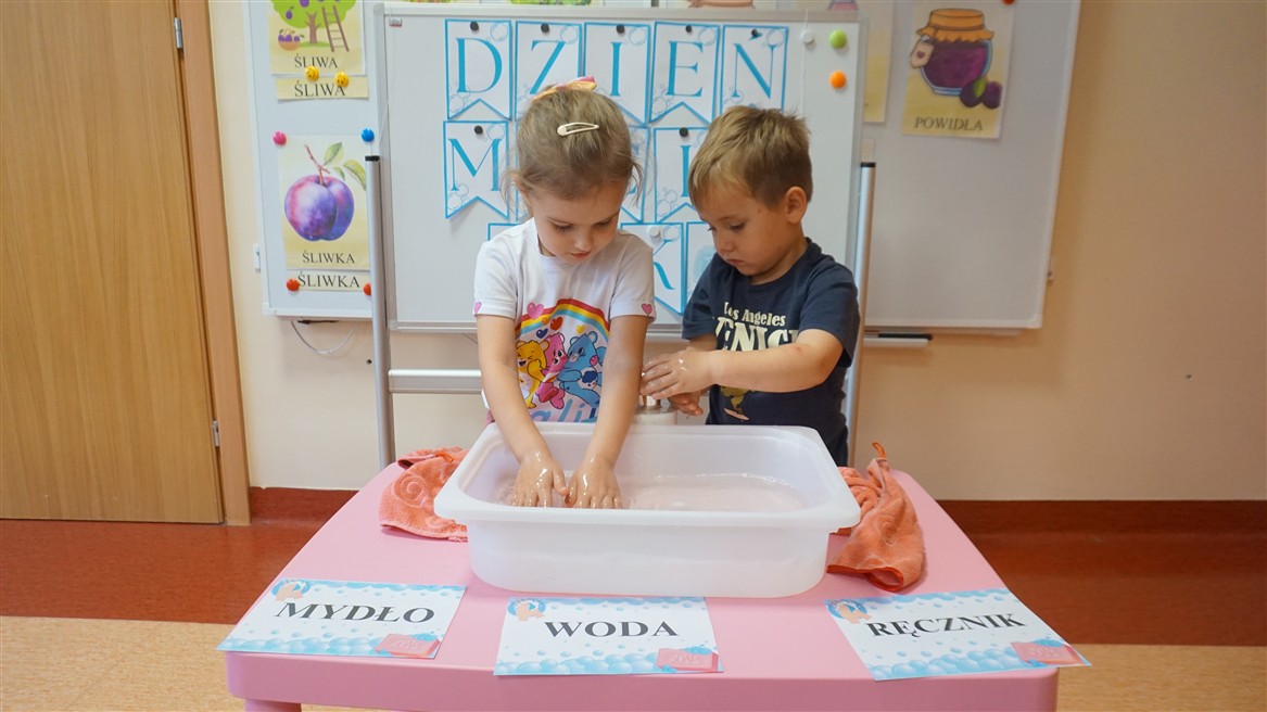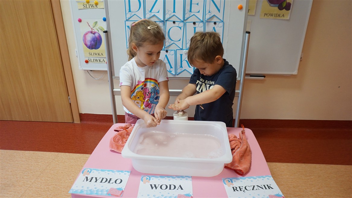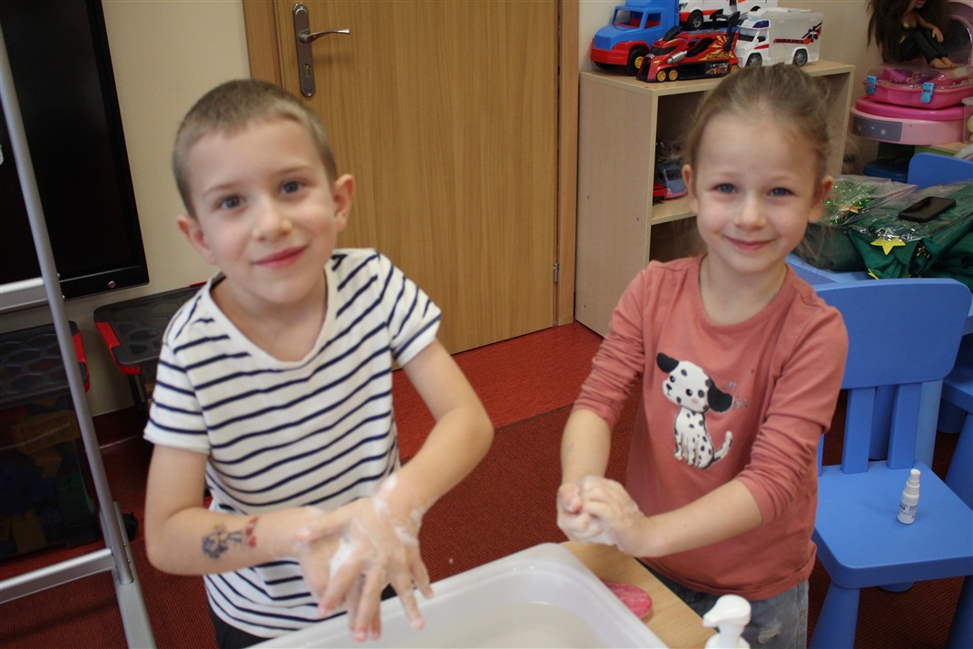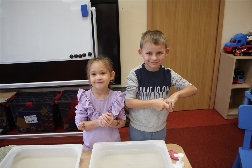 15 października przypada Światowy Dzień Mycia Rąk – święto ustanowione, by promować prawidłowe nawyki higieniczne, szczególnie wśród dzieci. W naszym przedszkolu również uczciliśmy ten dzień w wyjątkowy sposób, łącząc naukę z zabawą, aby uświadomić najmłodszym, jak ważne jest dbanie o czystość rąk. Dzieci podczas zajęć uczyły się prawidłowej techniki mycia rąk przy użyciu mydła i wody. Dowiedziały się również kiedy należy myć ręce. Eksperymentowały z „magicznym pieprzem” – prostym doświadczeniem, które pokazało, jak mydło „odstrasza” brud. Poznały różne rodzaje produktów przeznaczonych do mycia rąk oraz choroby wywołane nie myciem rąk. Dzieci nie tylko świetnie się bawiły, ale przede wszystkim wyniosły z tego dnia ważną lekcję – że mycie rąk to nie obowiązek, lecz codzienny nawyk, który może ochronić przed wieloma chorobami.