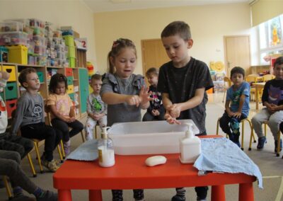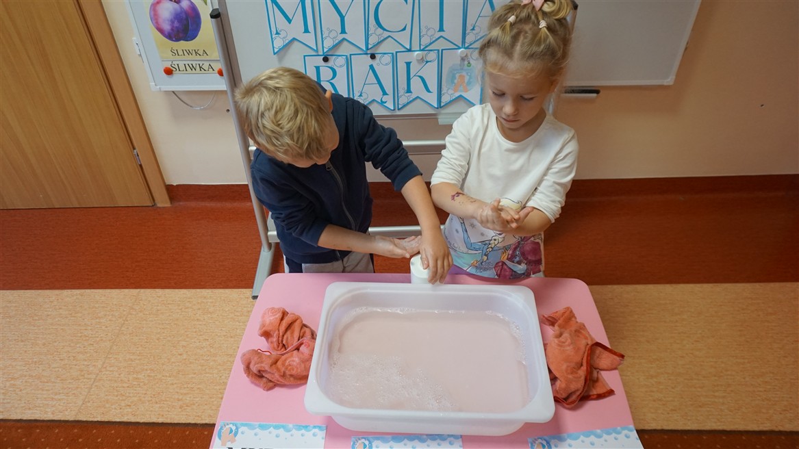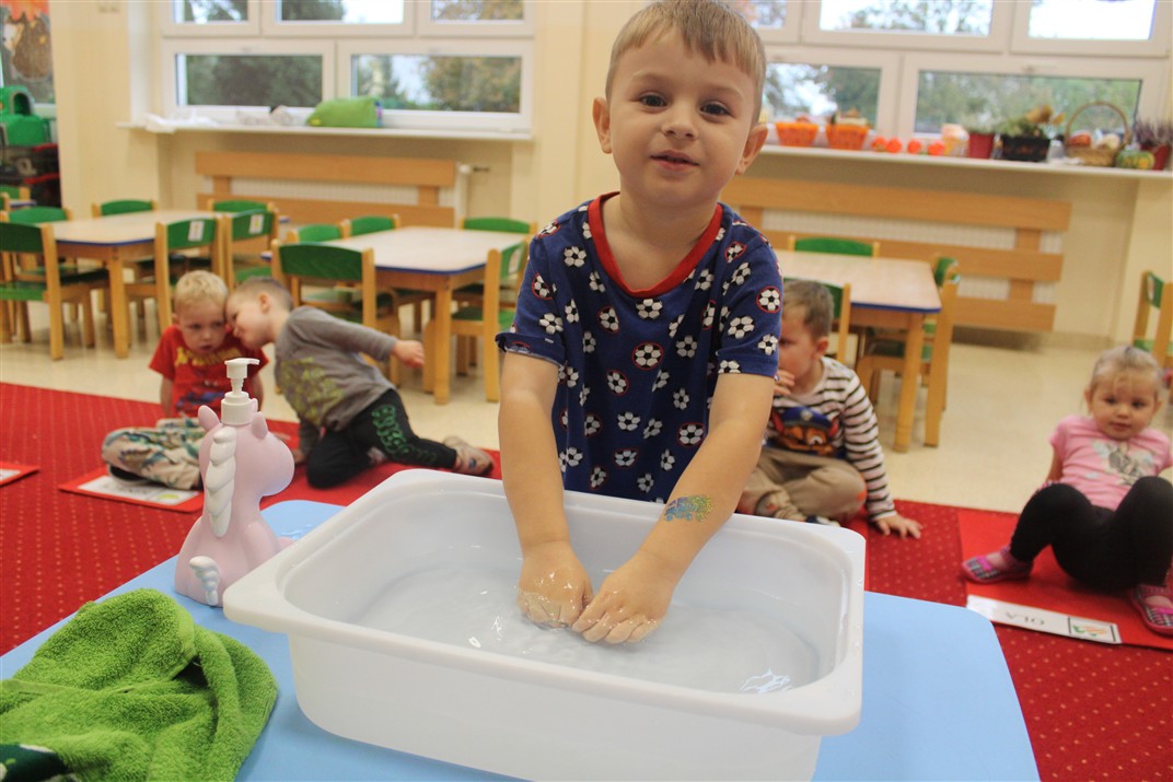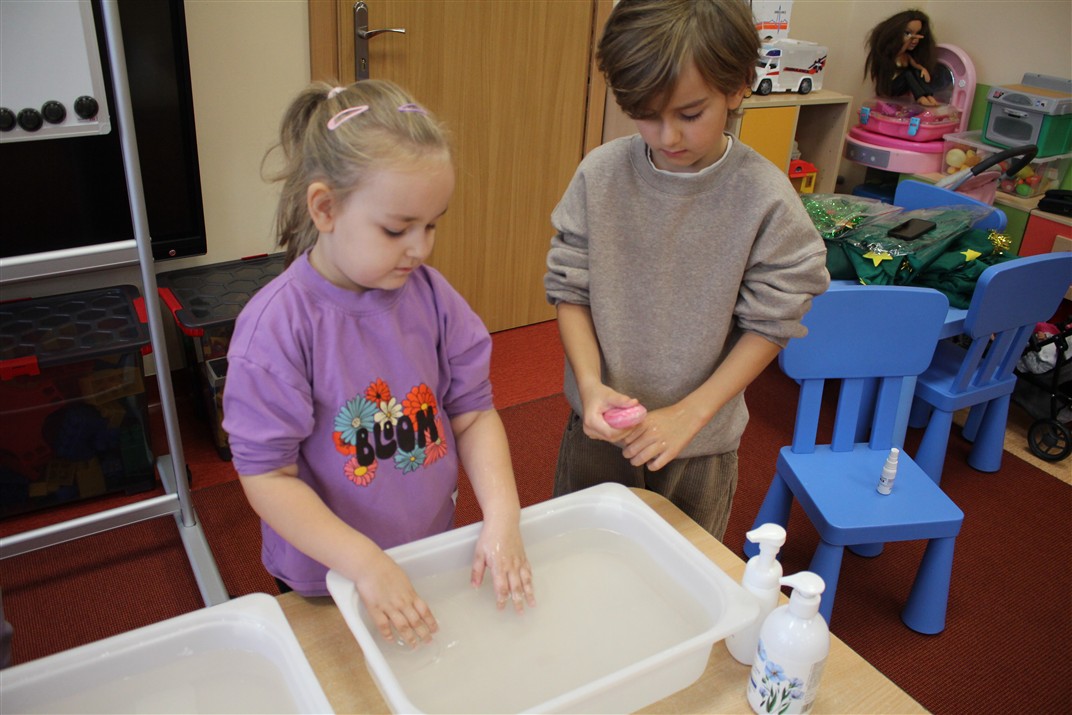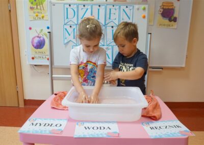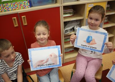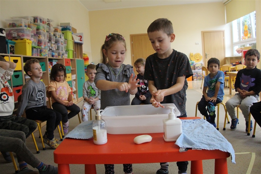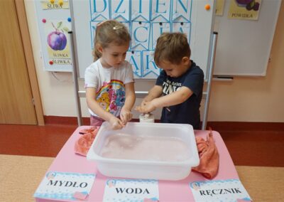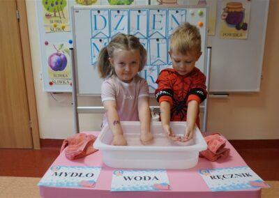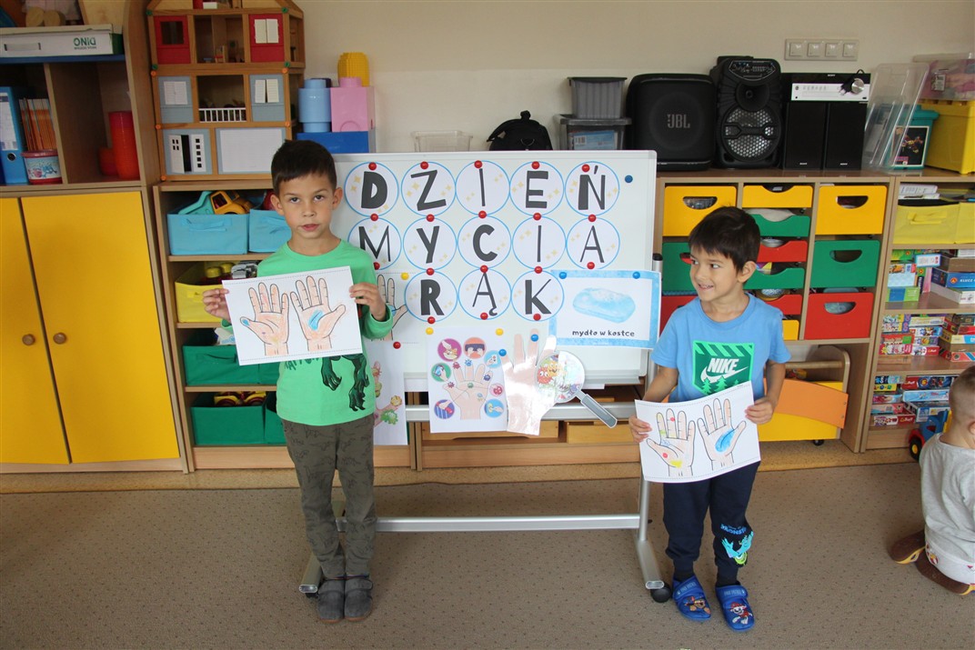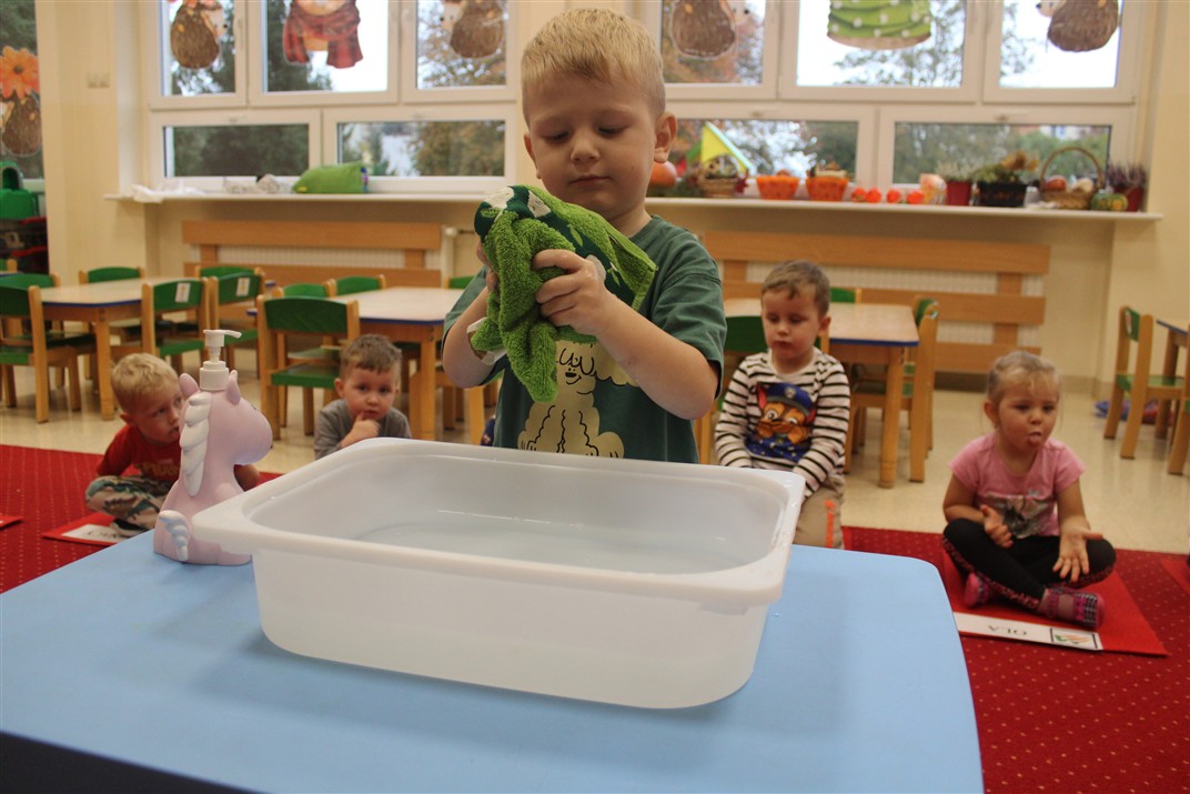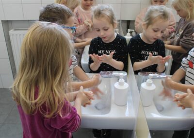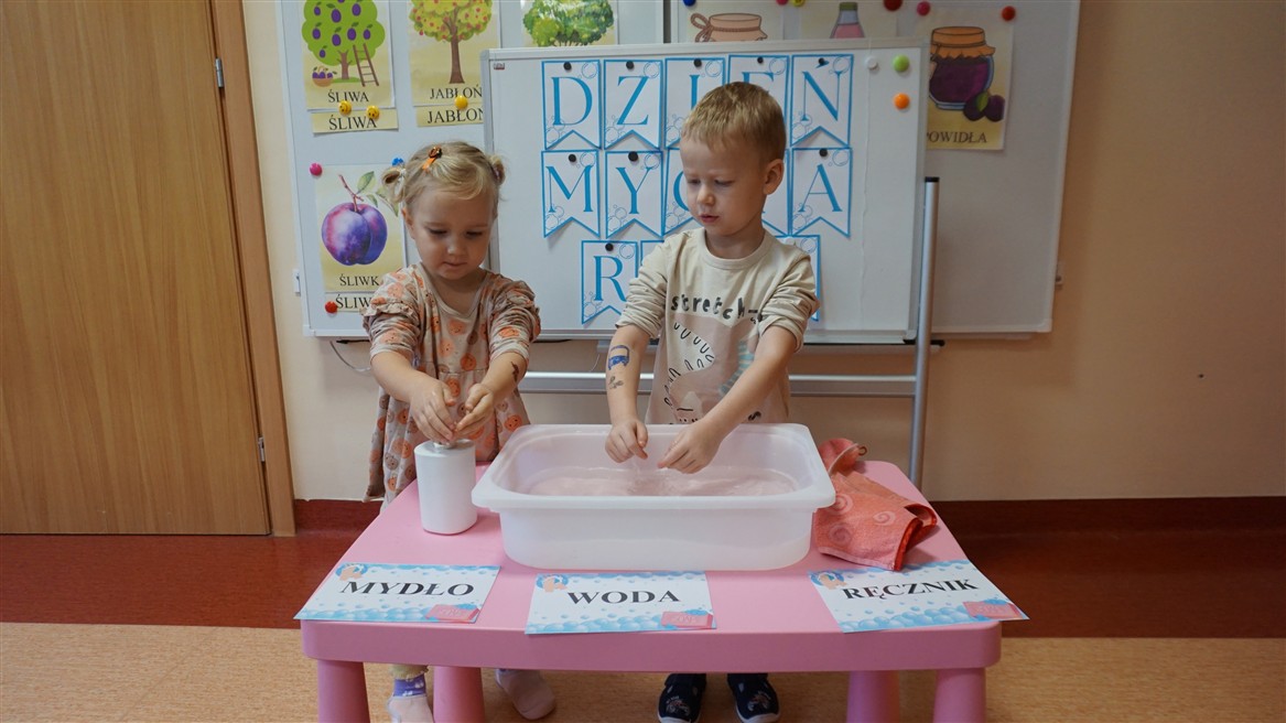 15 października przypada Światowy Dzień Mycia Rąk – święto ustanowione, by promować prawidłowe nawyki higieniczne, szczególnie wśród dzieci. W naszym przedszkolu również uczciliśmy ten dzień w wyjątkowy sposób, łącząc naukę z zabawą, aby uświadomić najmłodszym, jak ważne jest dbanie o czystość rąk. Dzieci podczas zajęć uczyły się prawidłowej techniki mycia rąk przy użyciu mydła i wody. Dowiedziały się również kiedy należy myć ręce. Eksperymentowały z „magicznym pieprzem” – prostym doświadczeniem, które pokazało, jak mydło „odstrasza” brud. Poznały różne rodzaje produktów przeznaczonych do mycia rąk oraz choroby wywołane nie myciem rąk. Dzieci nie tylko świetnie się bawiły, ale przede wszystkim wyniosły z tego dnia ważną lekcję – że mycie rąk to nie obowiązek, lecz codzienny nawyk, który może ochronić przed wieloma chorobami.