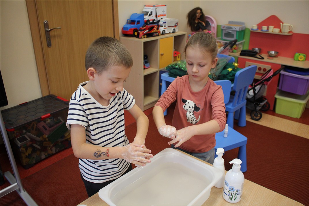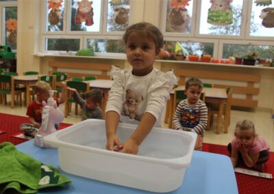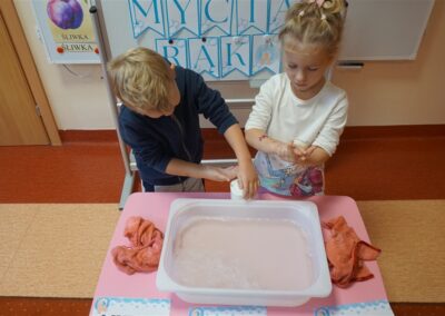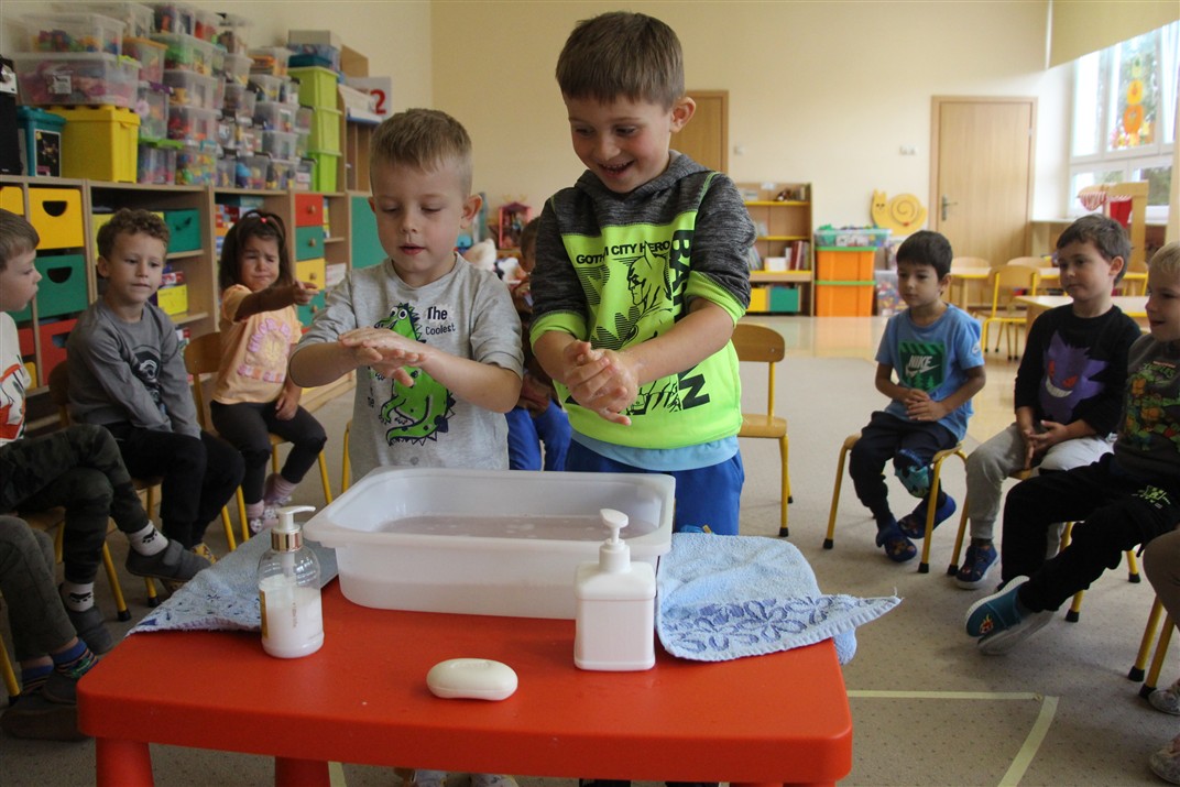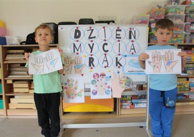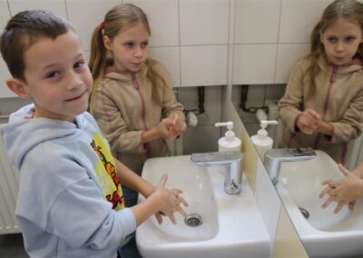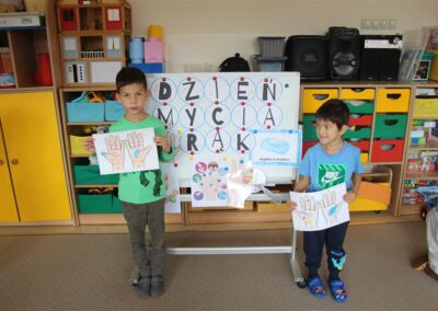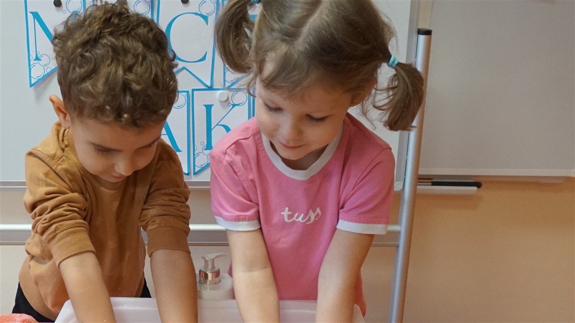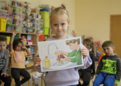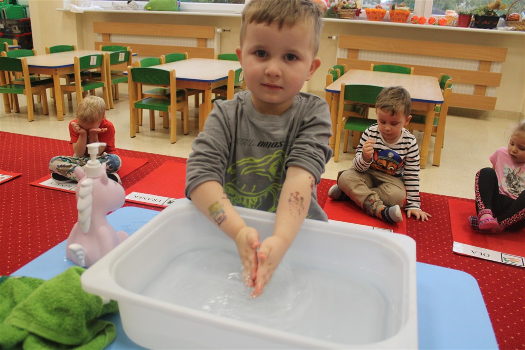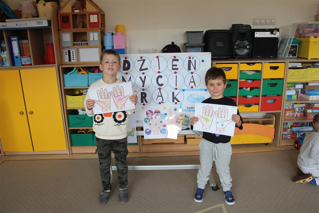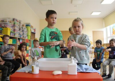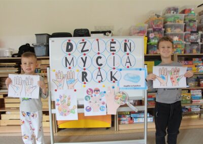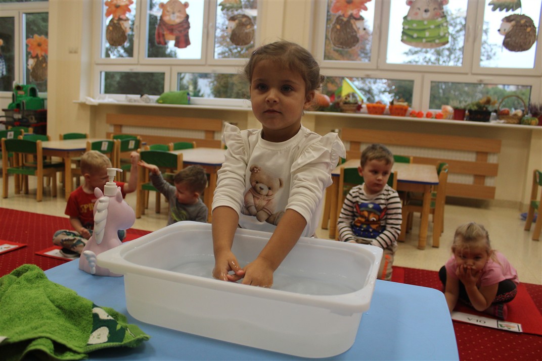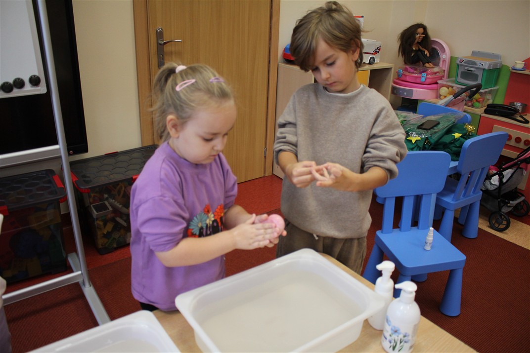 15 października przypada Światowy Dzień Mycia Rąk – święto ustanowione, by promować prawidłowe nawyki higieniczne, szczególnie wśród dzieci. W naszym przedszkolu również uczciliśmy ten dzień w wyjątkowy sposób, łącząc naukę z zabawą, aby uświadomić najmłodszym, jak ważne jest dbanie o czystość rąk. Dzieci podczas zajęć uczyły się prawidłowej techniki mycia rąk przy użyciu mydła i wody. Dowiedziały się również kiedy należy myć ręce. Eksperymentowały z „magicznym pieprzem” – prostym doświadczeniem, które pokazało, jak mydło „odstrasza” brud. Poznały różne rodzaje produktów przeznaczonych do mycia rąk oraz choroby wywołane nie myciem rąk. Dzieci nie tylko świetnie się bawiły, ale przede wszystkim wyniosły z tego dnia ważną lekcję – że mycie rąk to nie obowiązek, lecz codzienny nawyk, który może ochronić przed wieloma chorobami.