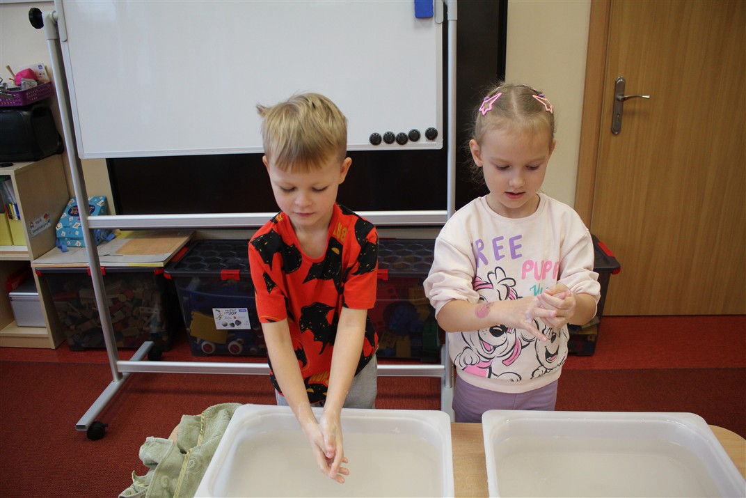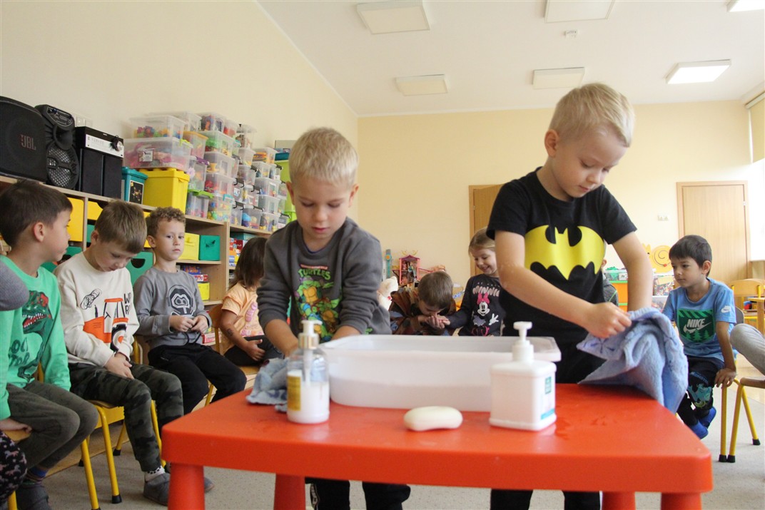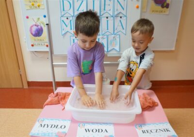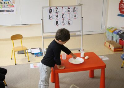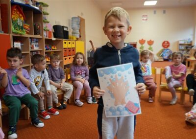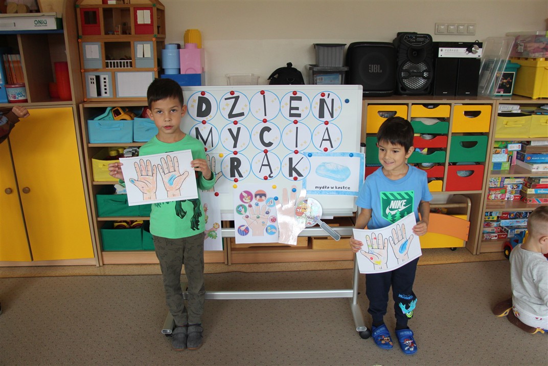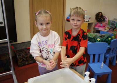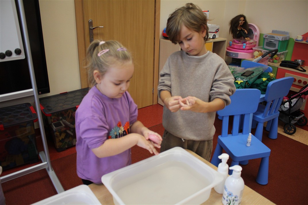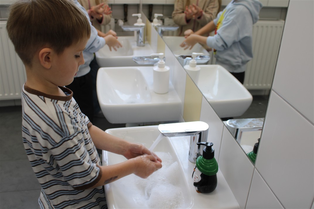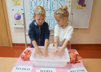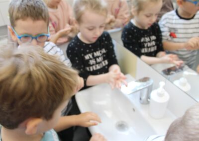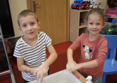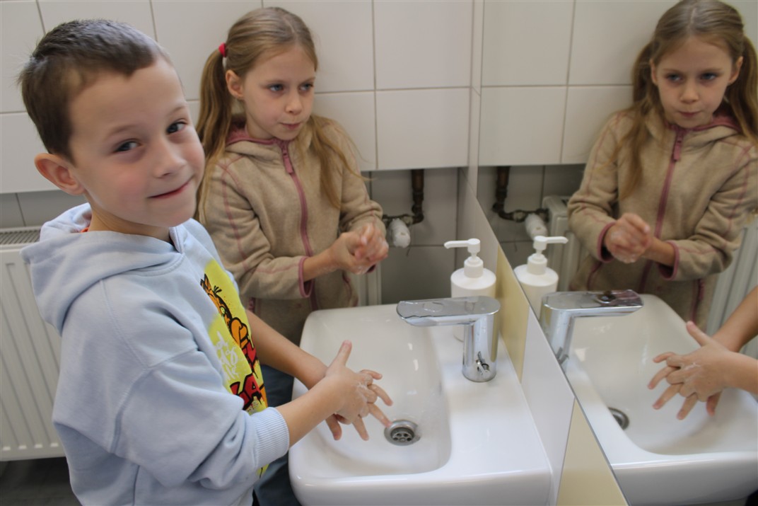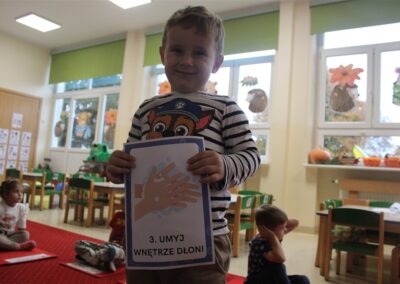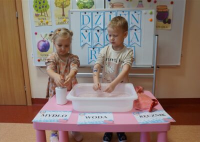 15 października przypada Światowy Dzień Mycia Rąk – święto ustanowione, by promować prawidłowe nawyki higieniczne, szczególnie wśród dzieci. W naszym przedszkolu również uczciliśmy ten dzień w wyjątkowy sposób, łącząc naukę z zabawą, aby uświadomić najmłodszym, jak ważne jest dbanie o czystość rąk. Dzieci podczas zajęć uczyły się prawidłowej techniki mycia rąk przy użyciu mydła i wody. Dowiedziały się również kiedy należy myć ręce. Eksperymentowały z „magicznym pieprzem” – prostym doświadczeniem, które pokazało, jak mydło „odstrasza” brud. Poznały różne rodzaje produktów przeznaczonych do mycia rąk oraz choroby wywołane nie myciem rąk. Dzieci nie tylko świetnie się bawiły, ale przede wszystkim wyniosły z tego dnia ważną lekcję – że mycie rąk to nie obowiązek, lecz codzienny nawyk, który może ochronić przed wieloma chorobami.