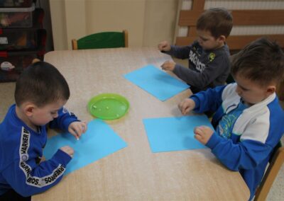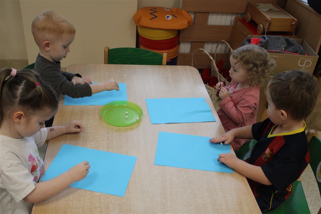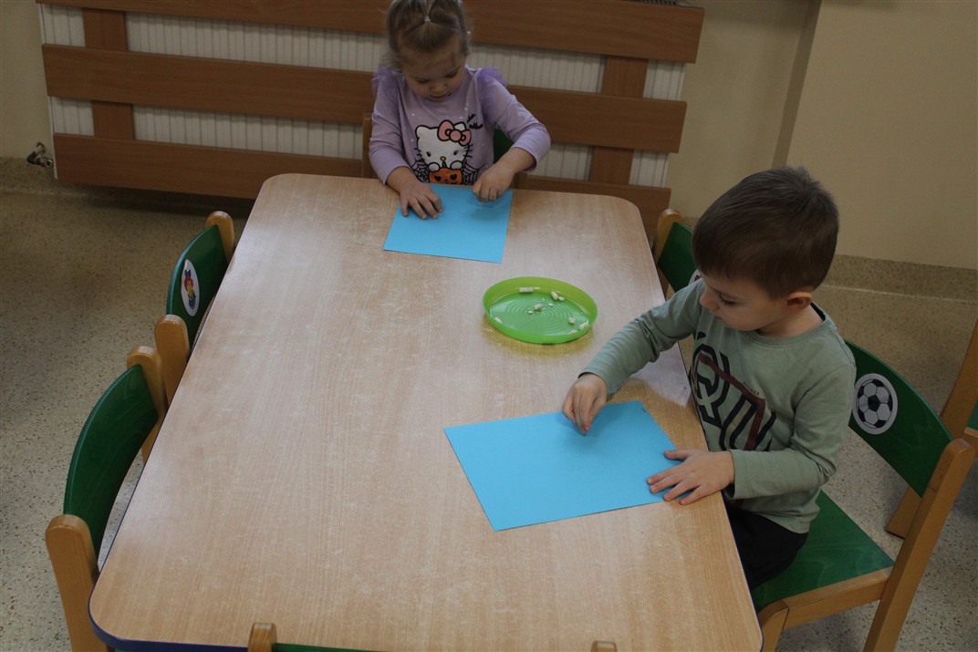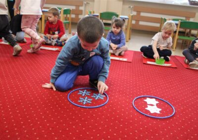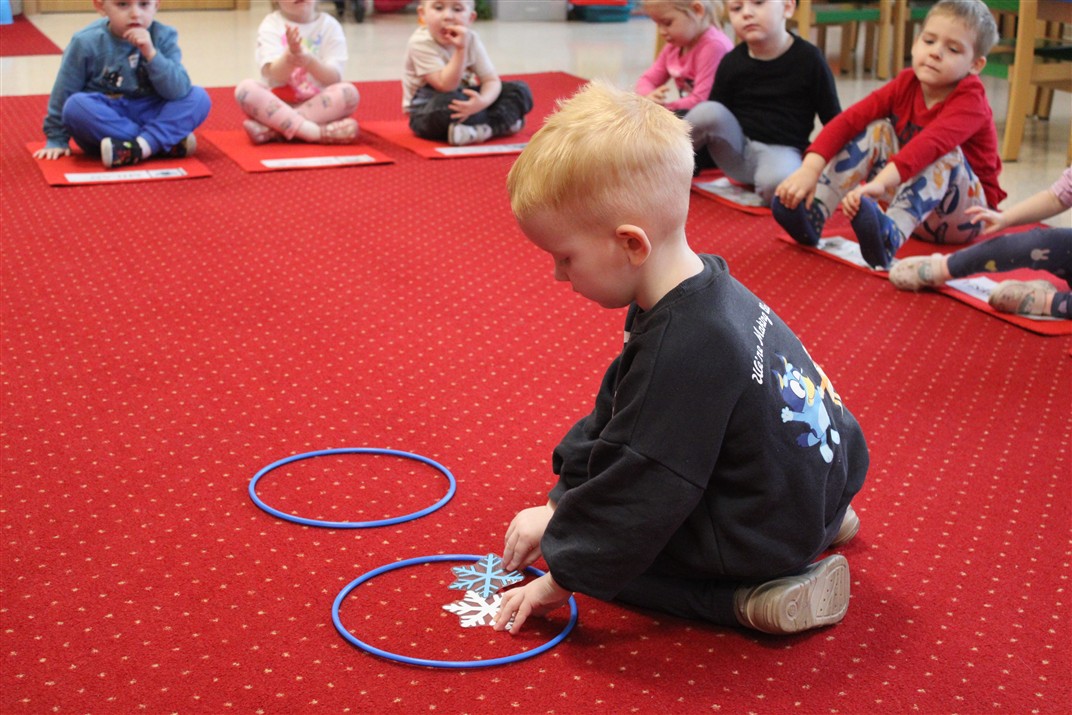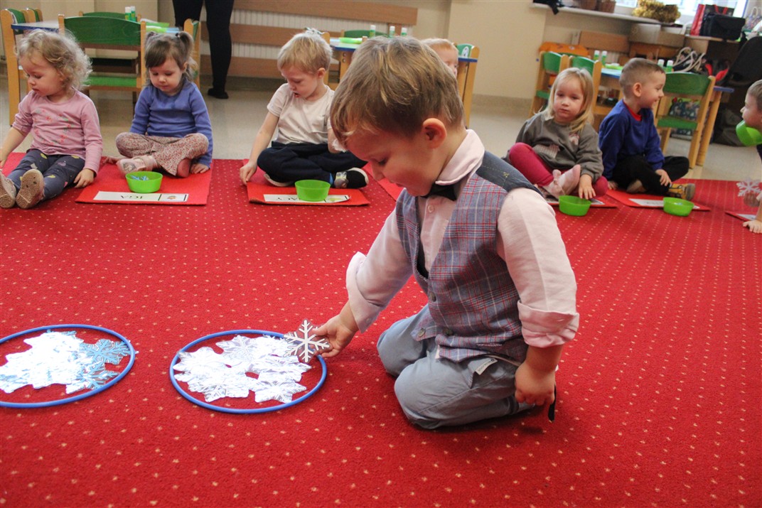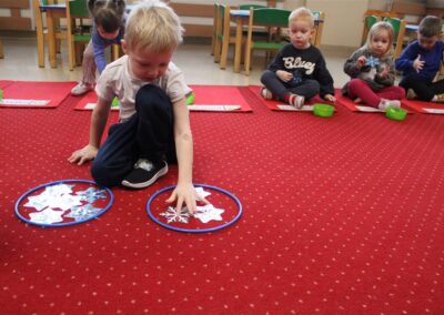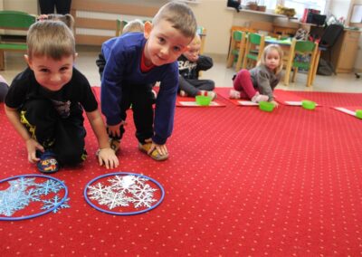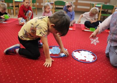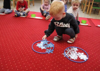 – ,,Śnieżynki z nieba’’ – segregowały śnieżynki ze względu na kolor, utrwalały kolor biały i niebieski