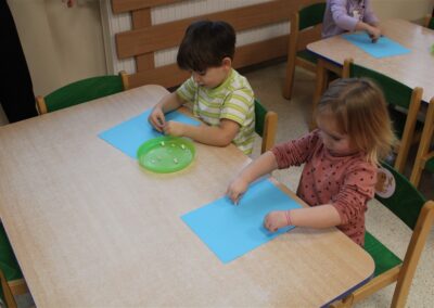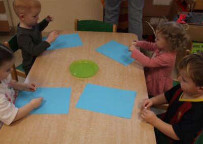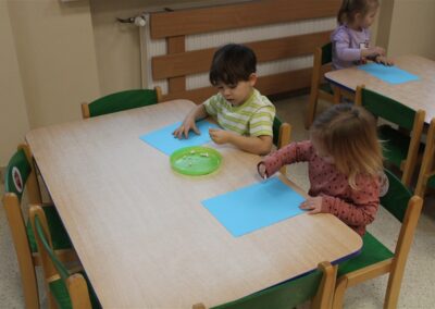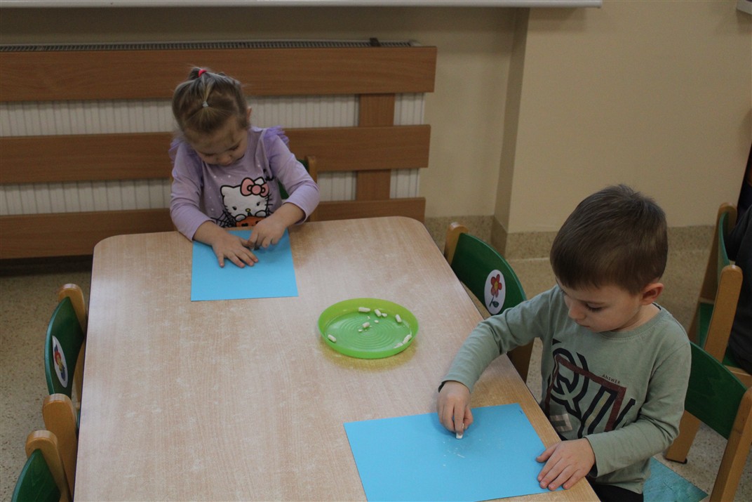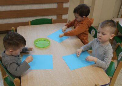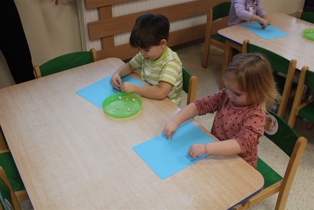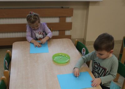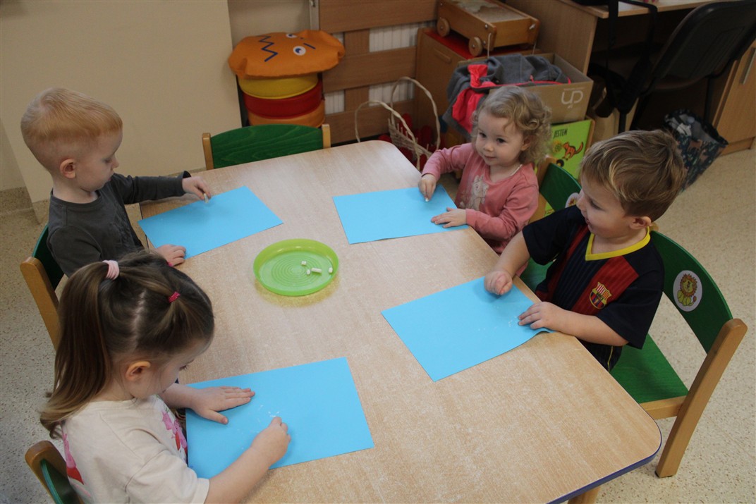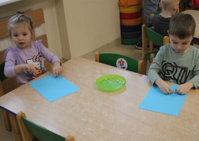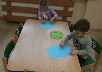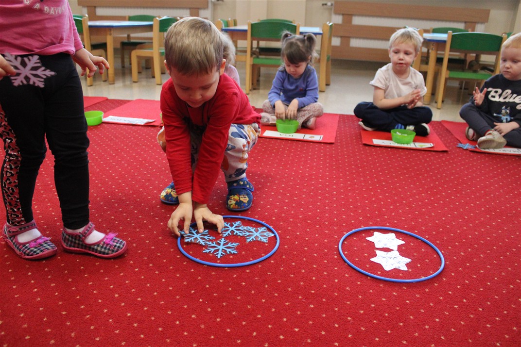 – ,,Śnieżynki z nieba’’ – segregowały śnieżynki ze względu na kolor, utrwalały kolor biały i niebieski
