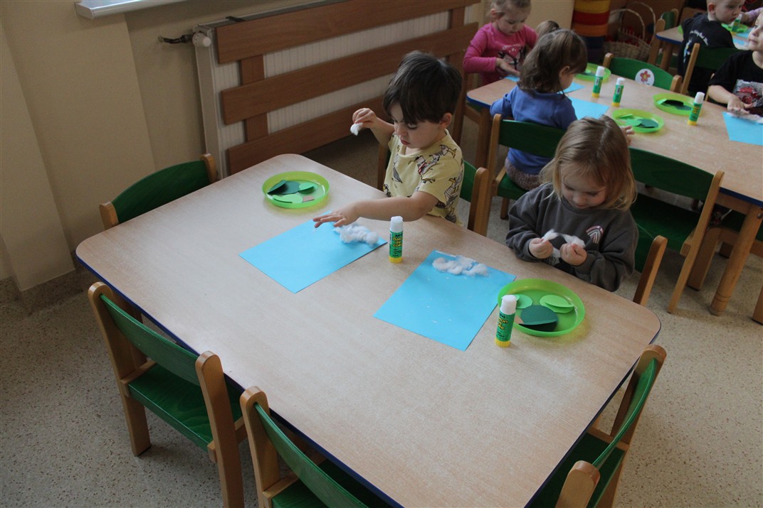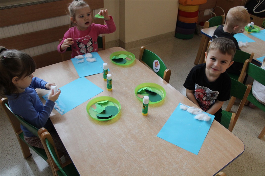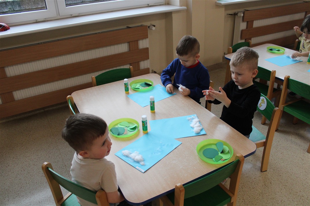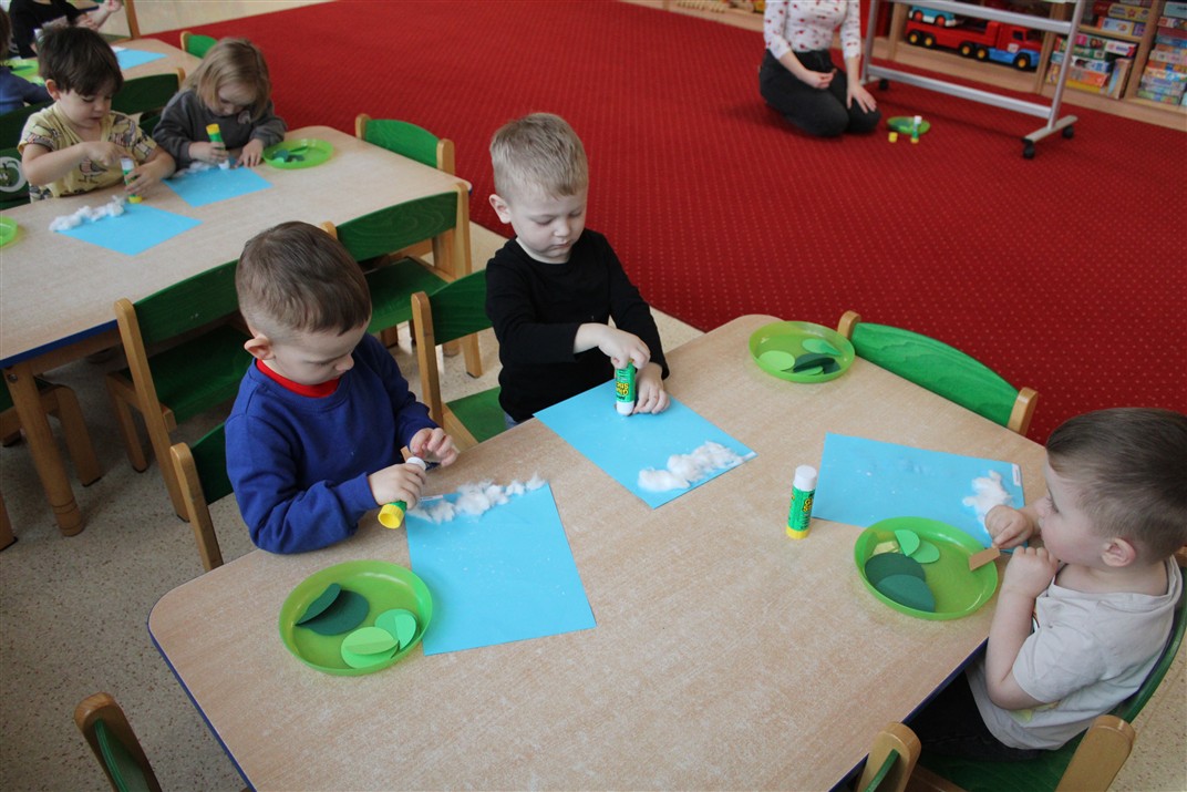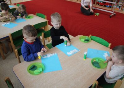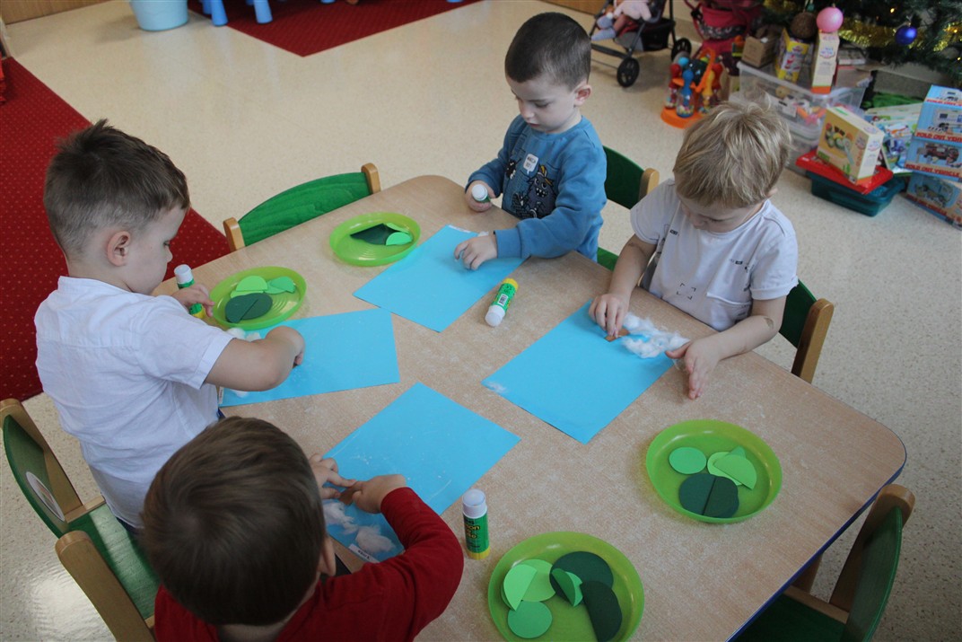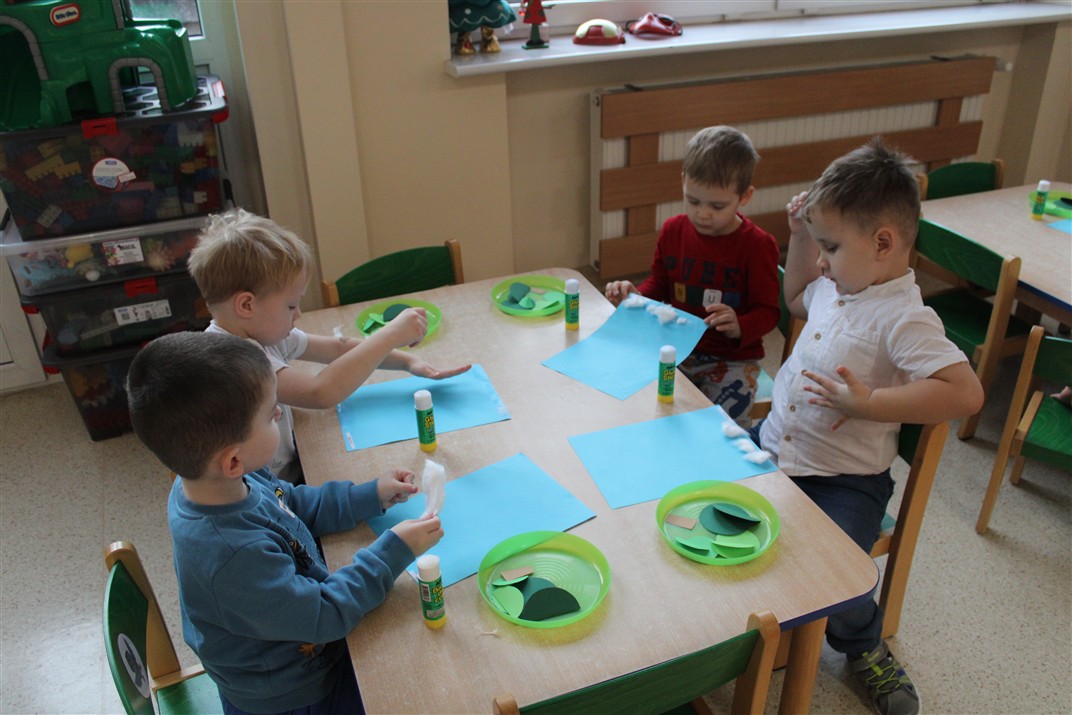 – tworzyły pracę plastyczną ,,Choinka’’ przyklejały watę, tworząc śnieg, przyklejały pień choinki i kółka różnej wielkości (małe, średnie i duże)