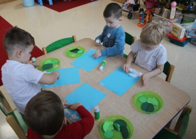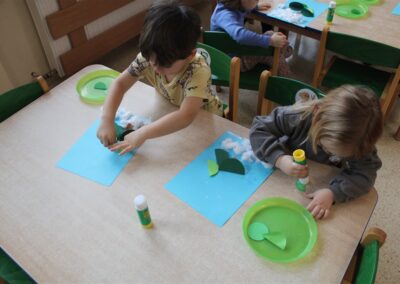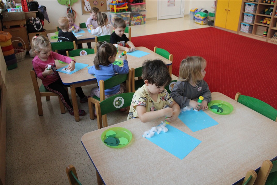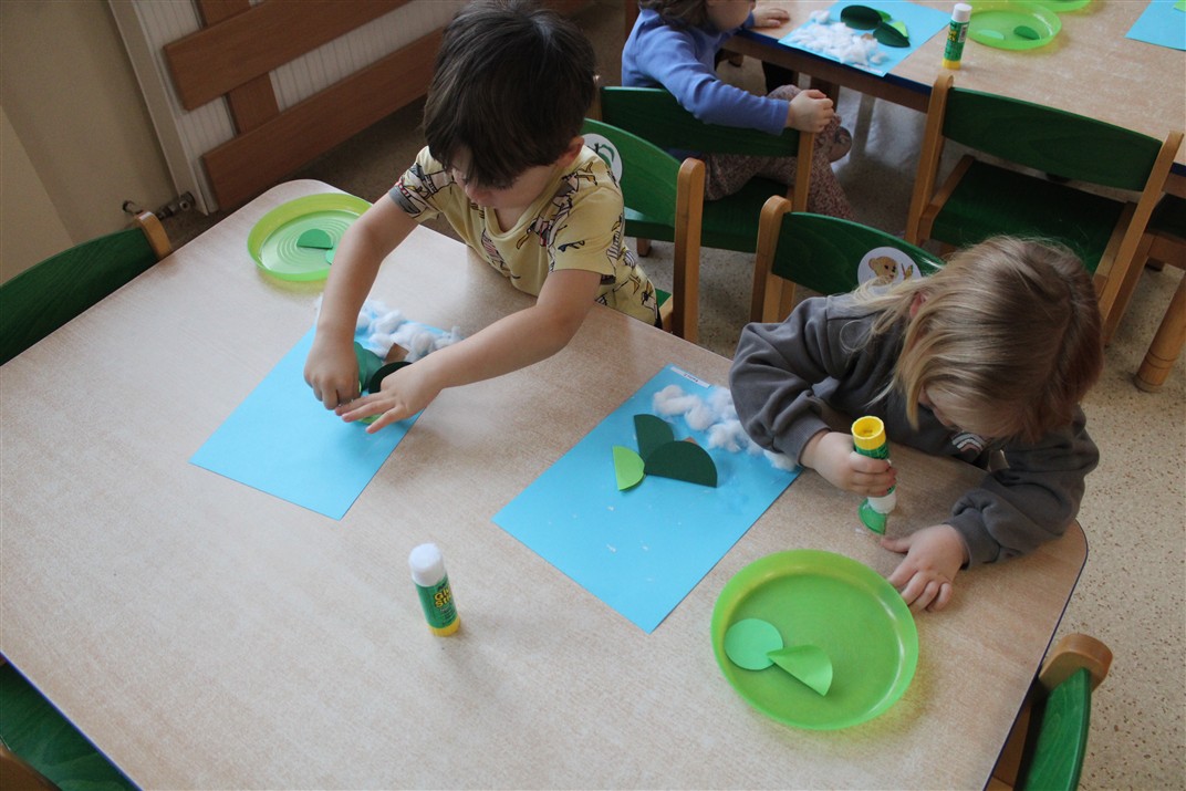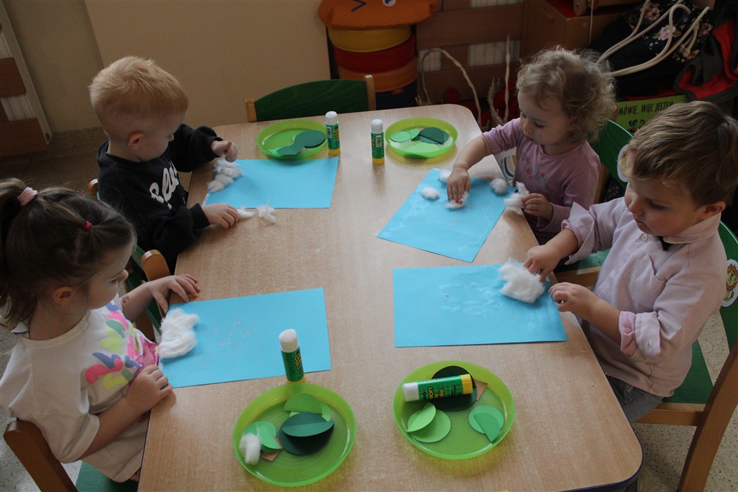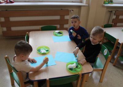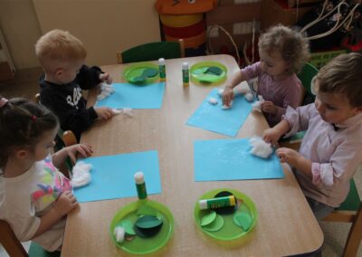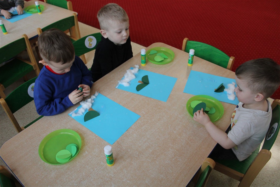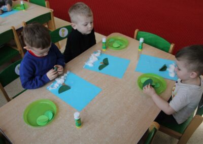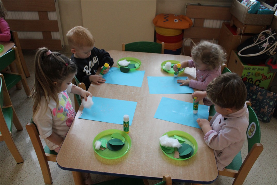 – tworzyły pracę plastyczną ,,Choinka’’ przyklejały watę, tworząc śnieg, przyklejały pień choinki i kółka różnej wielkości (małe, średnie i duże)
