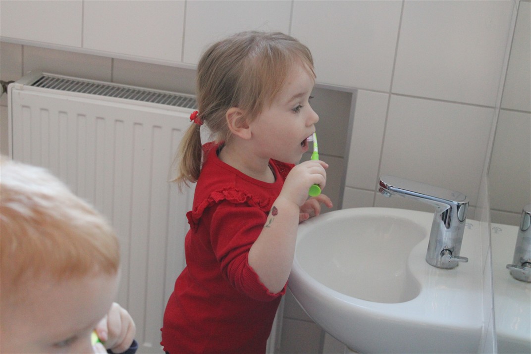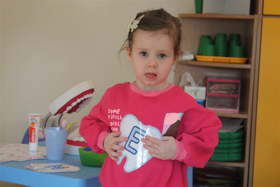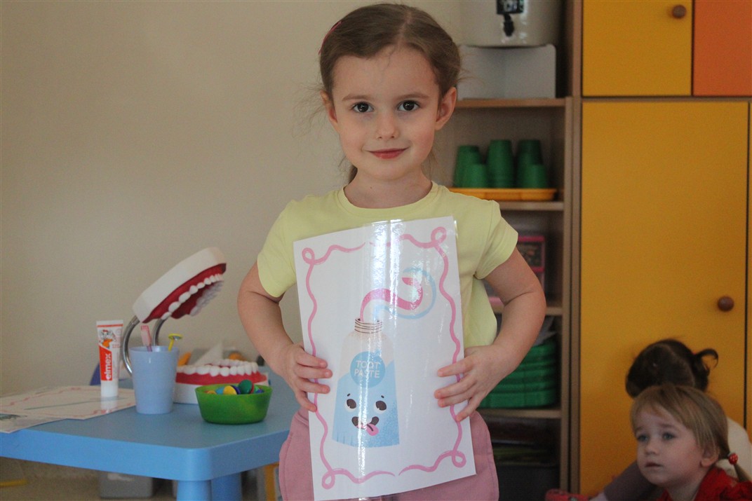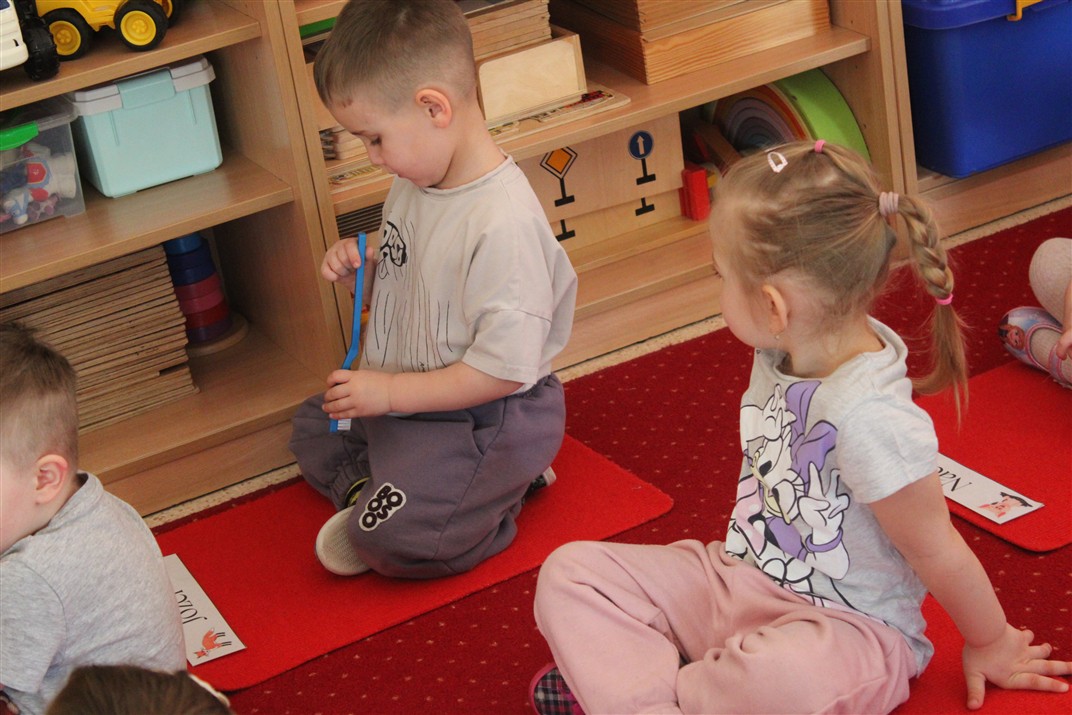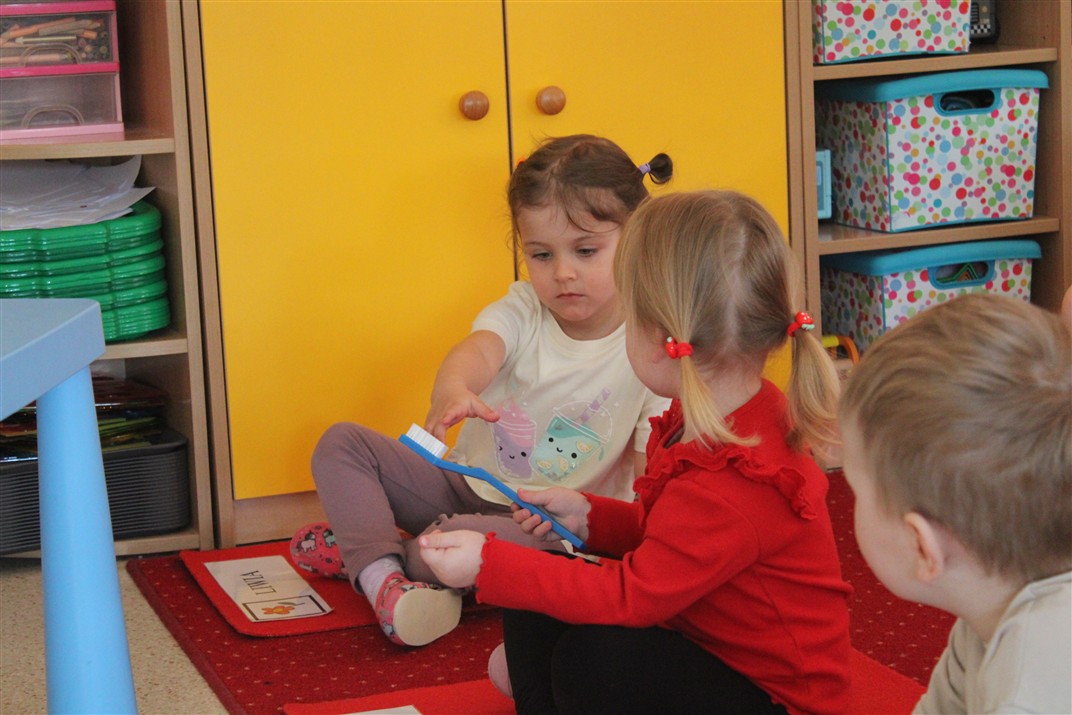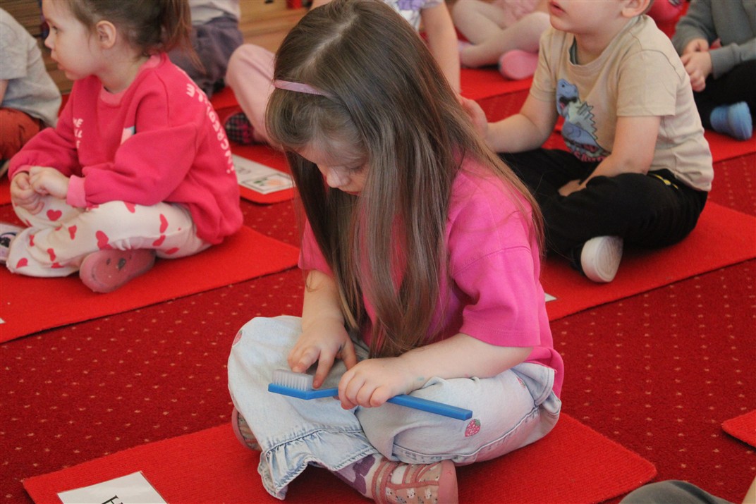 „Szczotka, pasta, kubek, woda -zdrowy uśmiech to nagroda” – Obchody Dnia Dentysty w grupie Żabek, Pszczółek i Motyli