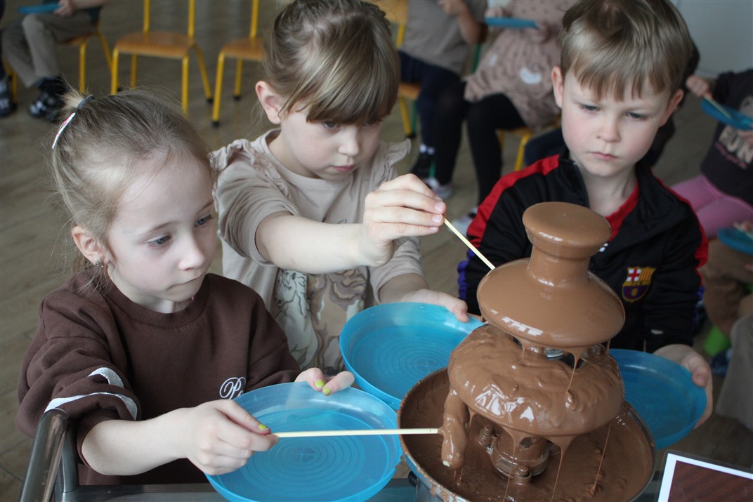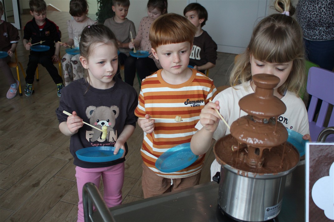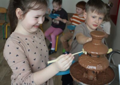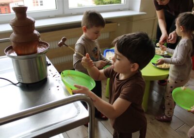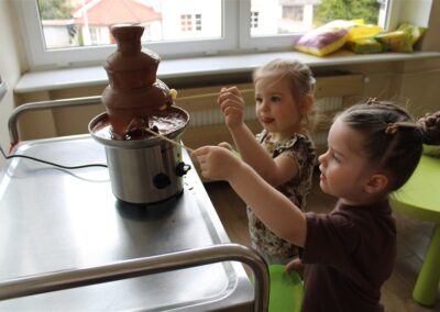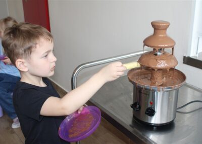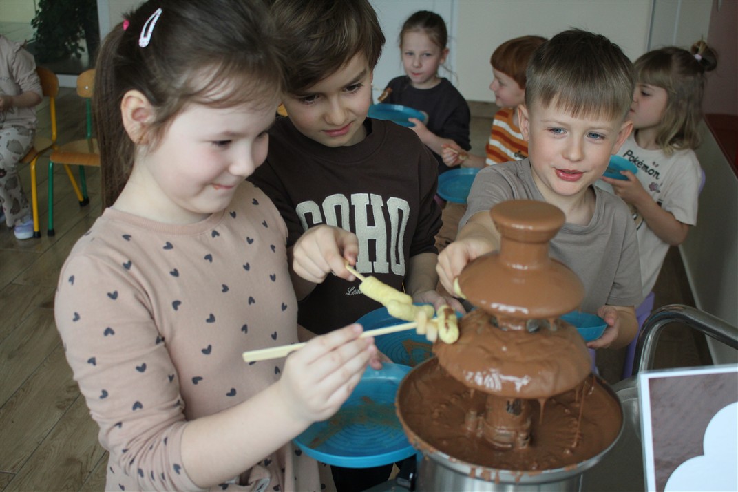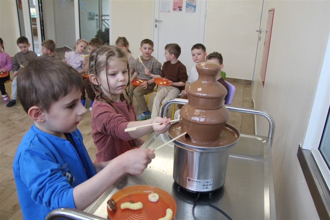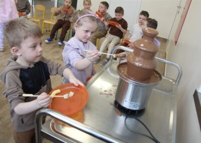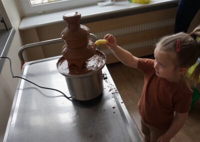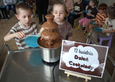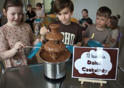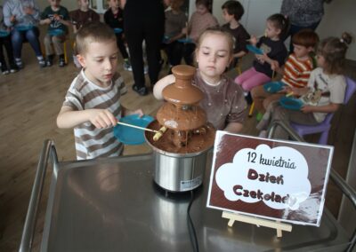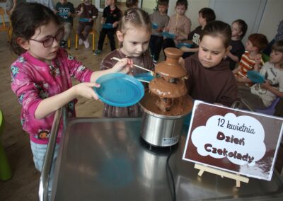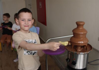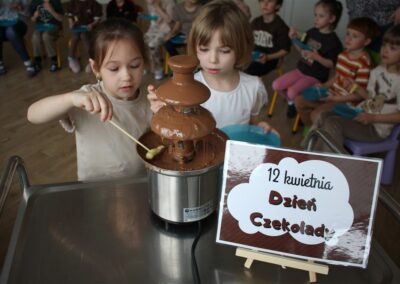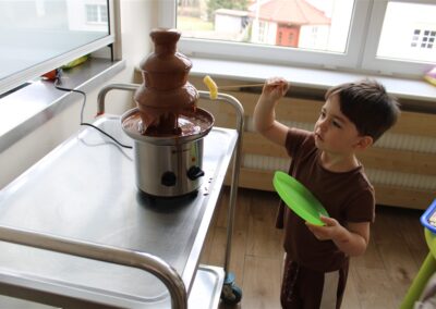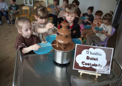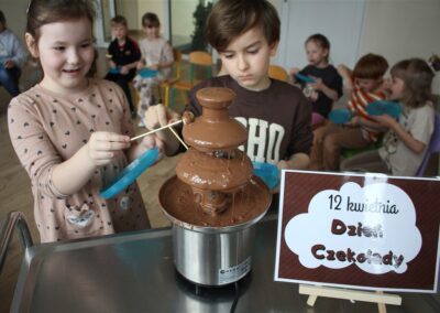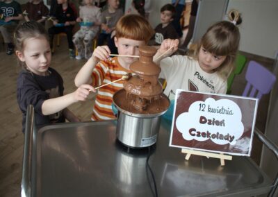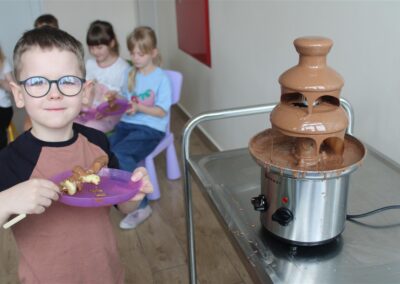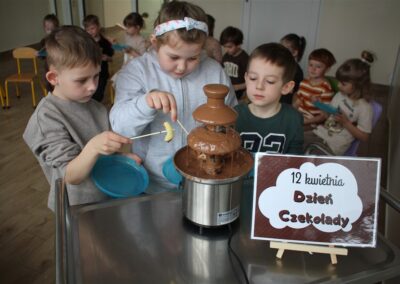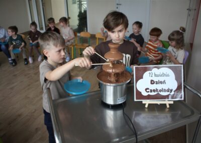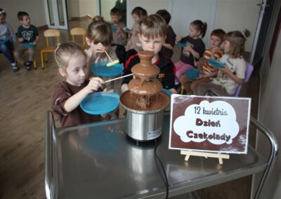 13 kwietnia w naszym przedszkolu obchodziliśmy wyjątkowy i bardzo słodki Dzień Czekolady. Tego dnia dzieci poznały skąd pochodzi czekolada i jak powstaje – od ziaren kakaowca aż po gotowy produkt. Przedszkolaki miały okazję poznać różne rodzaje czekolady – mleczną, białą i z dodatkami. Najbardziej jednak wyczekiwane było spróbowanie tych słodkości. Na dzieci czekała przygotowana fontanna czekolady z owocami. To był wyjątkowy dzień pełen radości oraz oczywiście królowej tego dnia – czekolady!