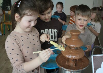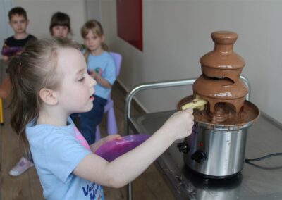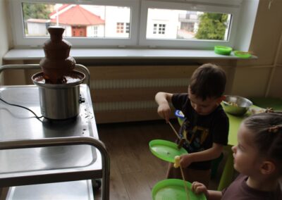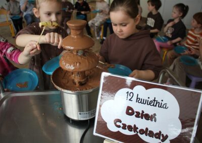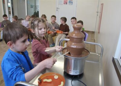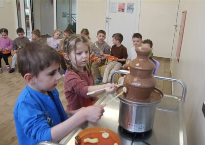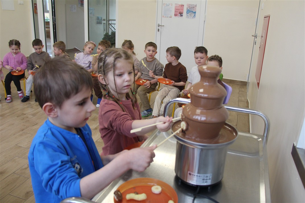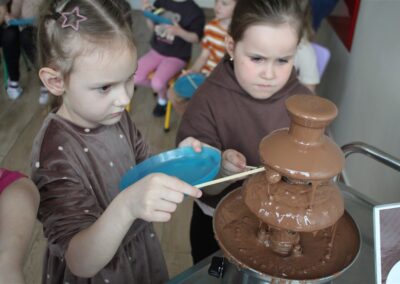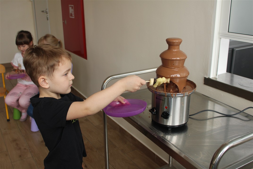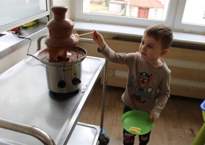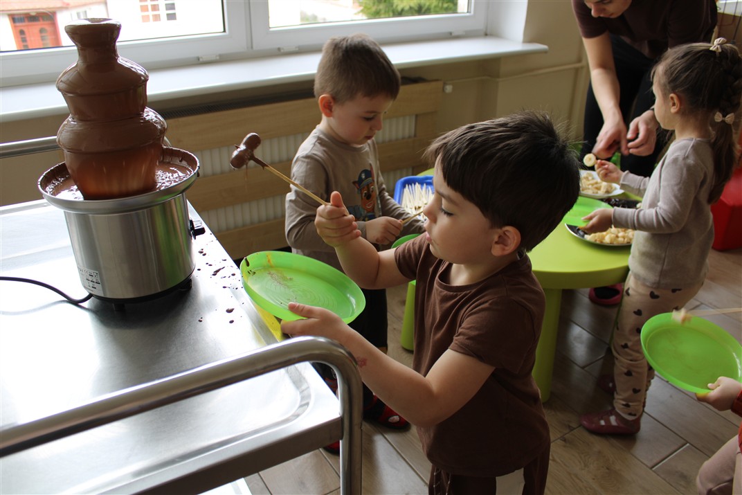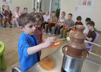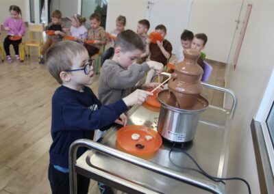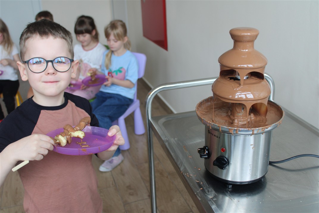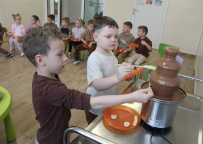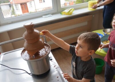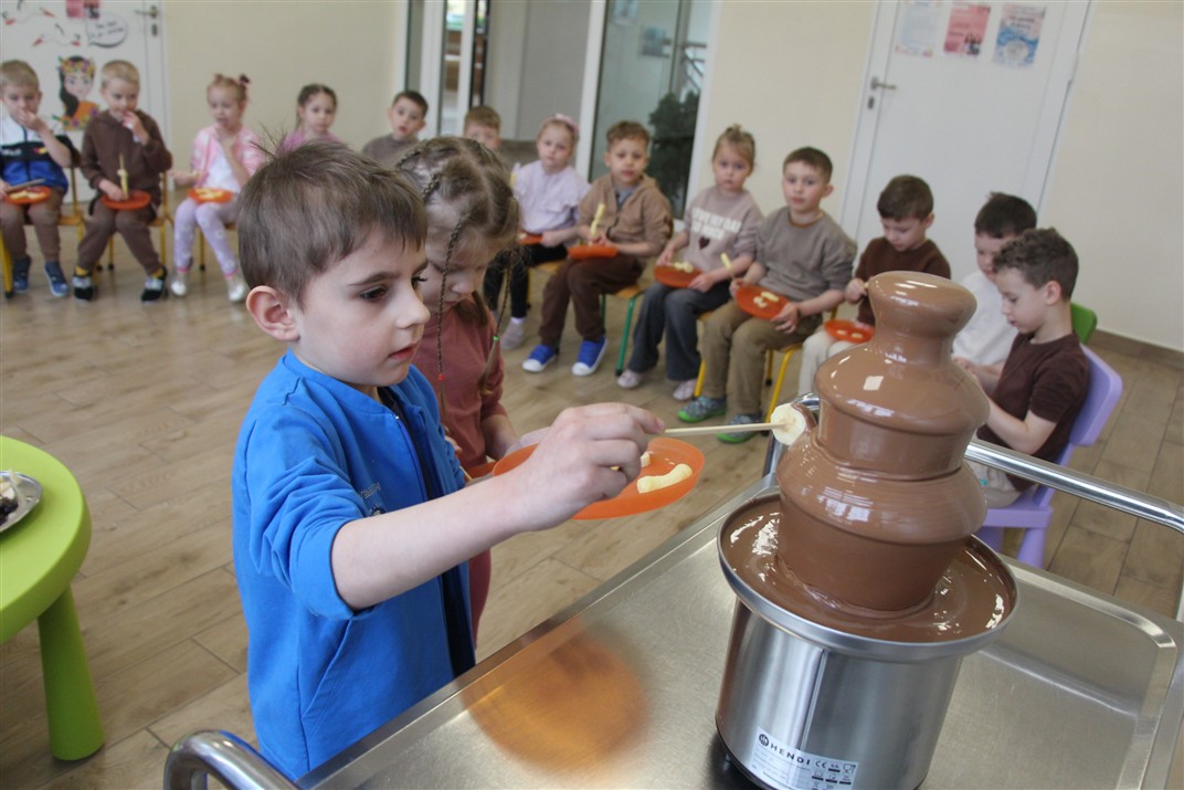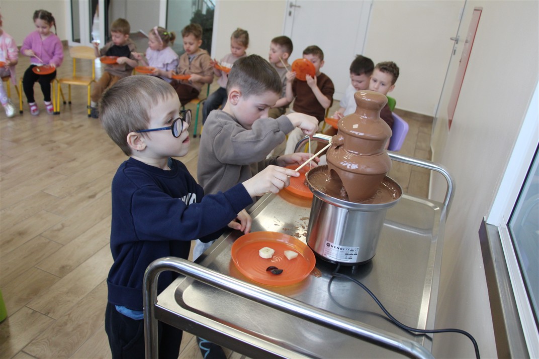 13 kwietnia w naszym przedszkolu obchodziliśmy wyjątkowy i bardzo słodki Dzień Czekolady. Tego dnia dzieci poznały skąd pochodzi czekolada i jak powstaje – od ziaren kakaowca aż po gotowy produkt. Przedszkolaki miały okazję poznać różne rodzaje czekolady – mleczną, białą i z dodatkami. Najbardziej jednak wyczekiwane było spróbowanie tych słodkości. Na dzieci czekała przygotowana fontanna czekolady z owocami. To był wyjątkowy dzień pełen radości oraz oczywiście królowej tego dnia – czekolady!