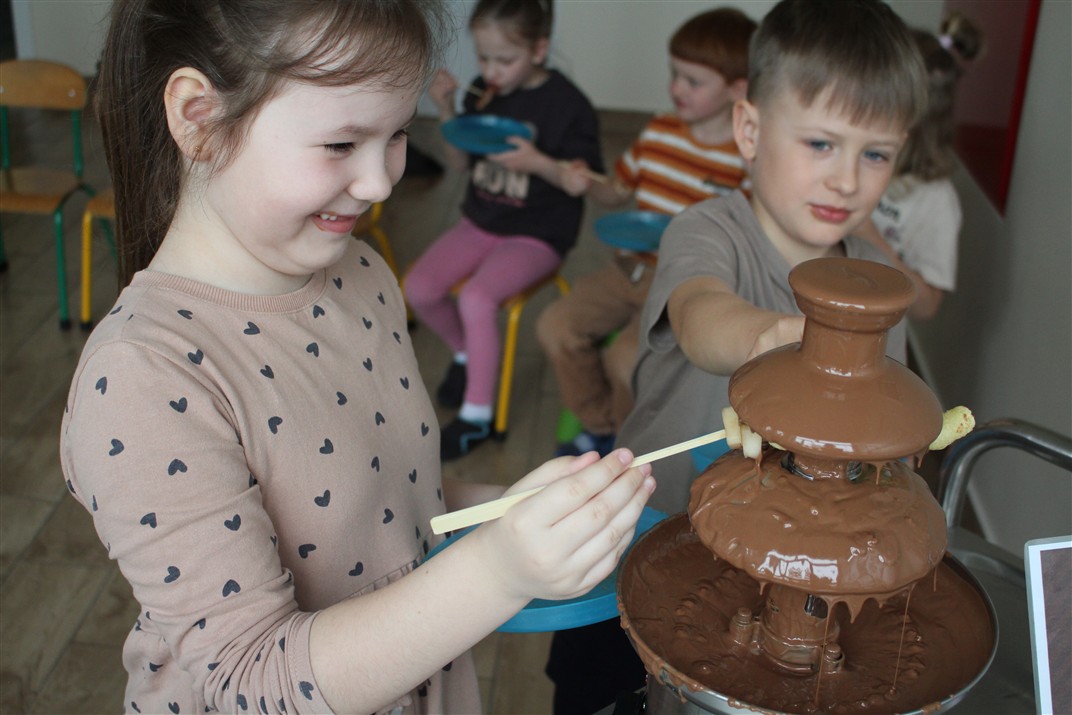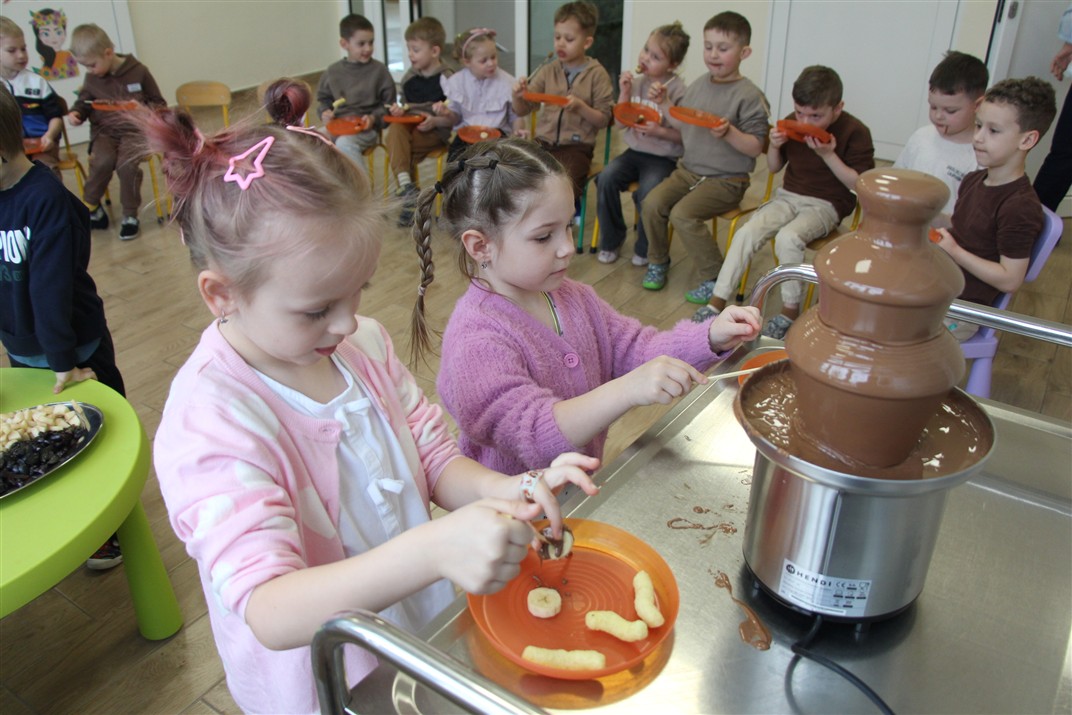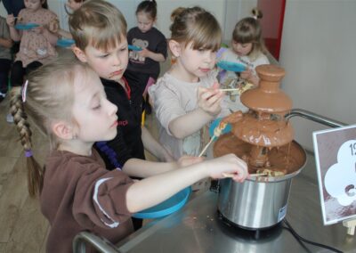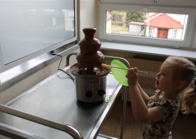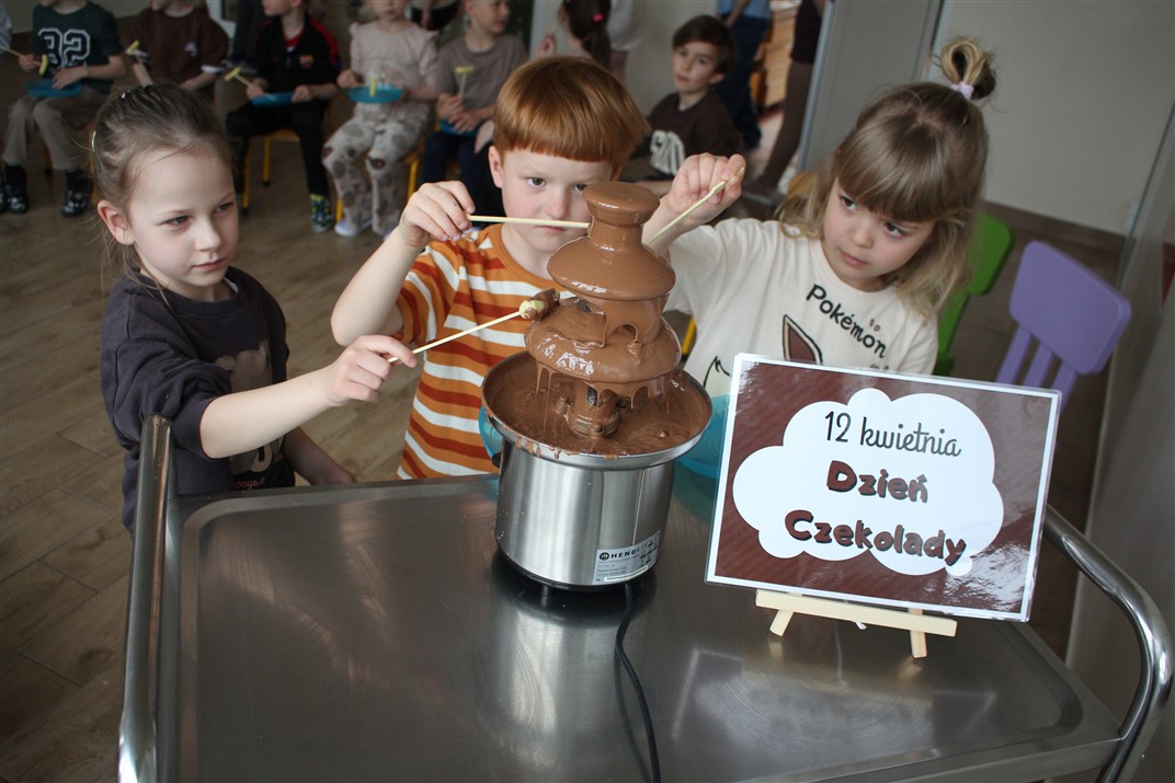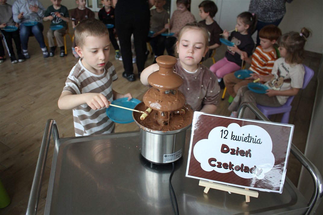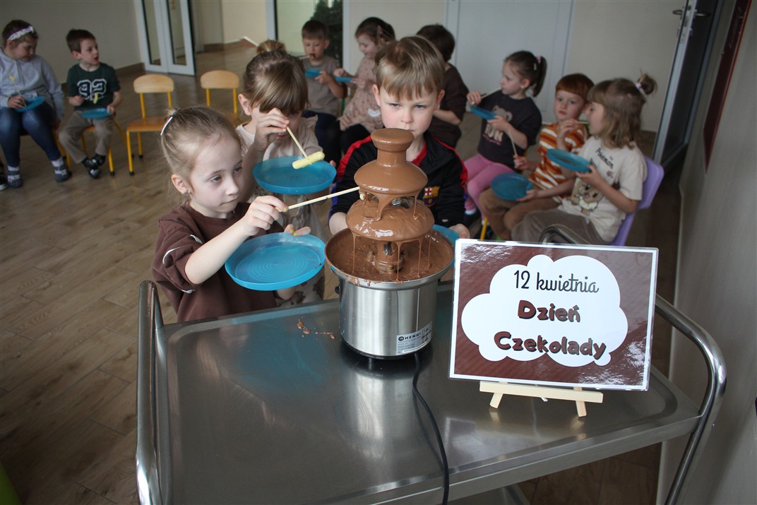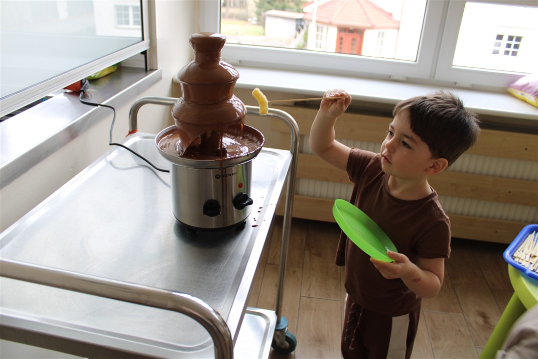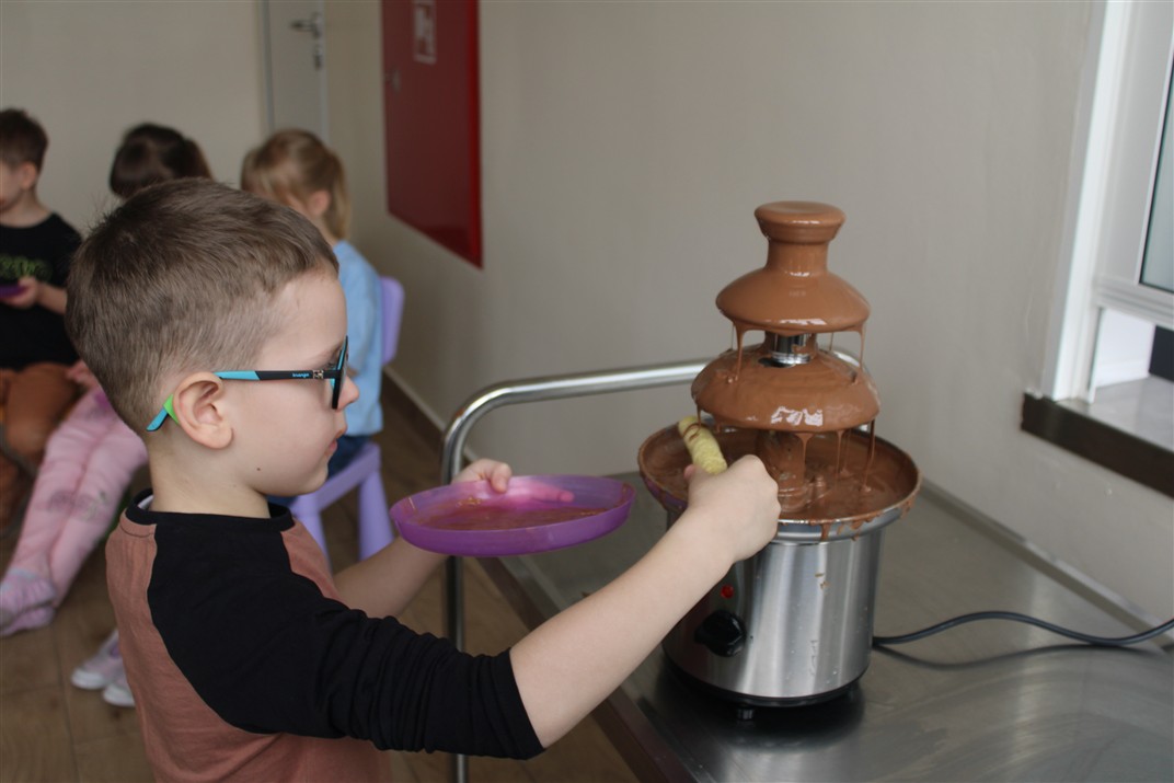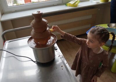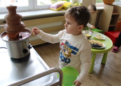 13 kwietnia w naszym przedszkolu obchodziliśmy wyjątkowy i bardzo słodki Dzień Czekolady. Tego dnia dzieci poznały skąd pochodzi czekolada i jak powstaje – od ziaren kakaowca aż po gotowy produkt. Przedszkolaki miały okazję poznać różne rodzaje czekolady – mleczną, białą i z dodatkami. Najbardziej jednak wyczekiwane było spróbowanie tych słodkości. Na dzieci czekała przygotowana fontanna czekolady z owocami. To był wyjątkowy dzień pełen radości oraz oczywiście królowej tego dnia – czekolady!