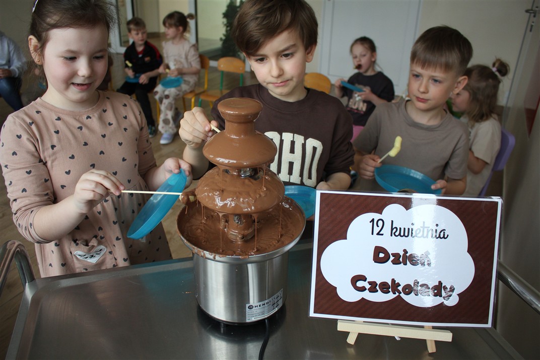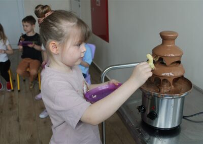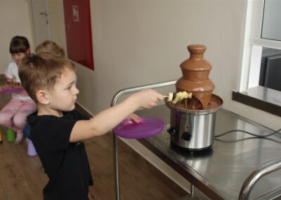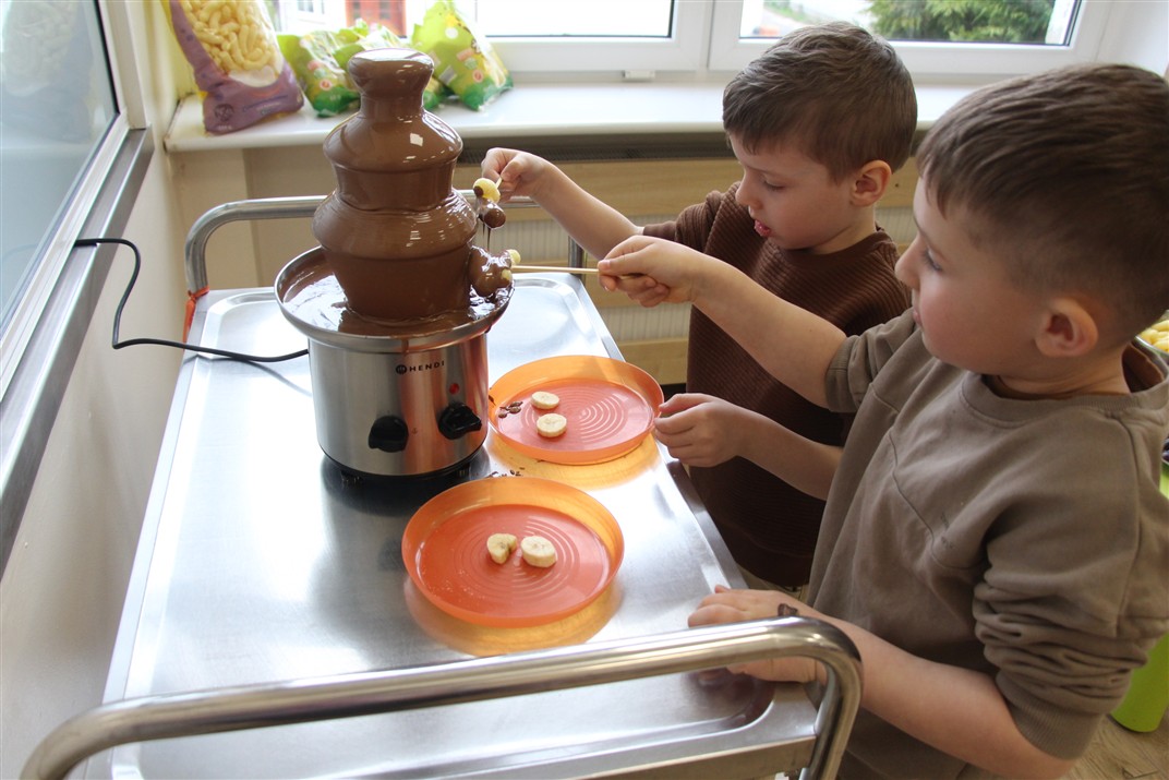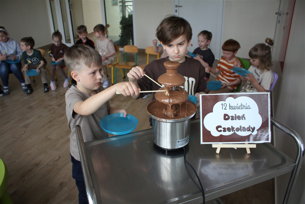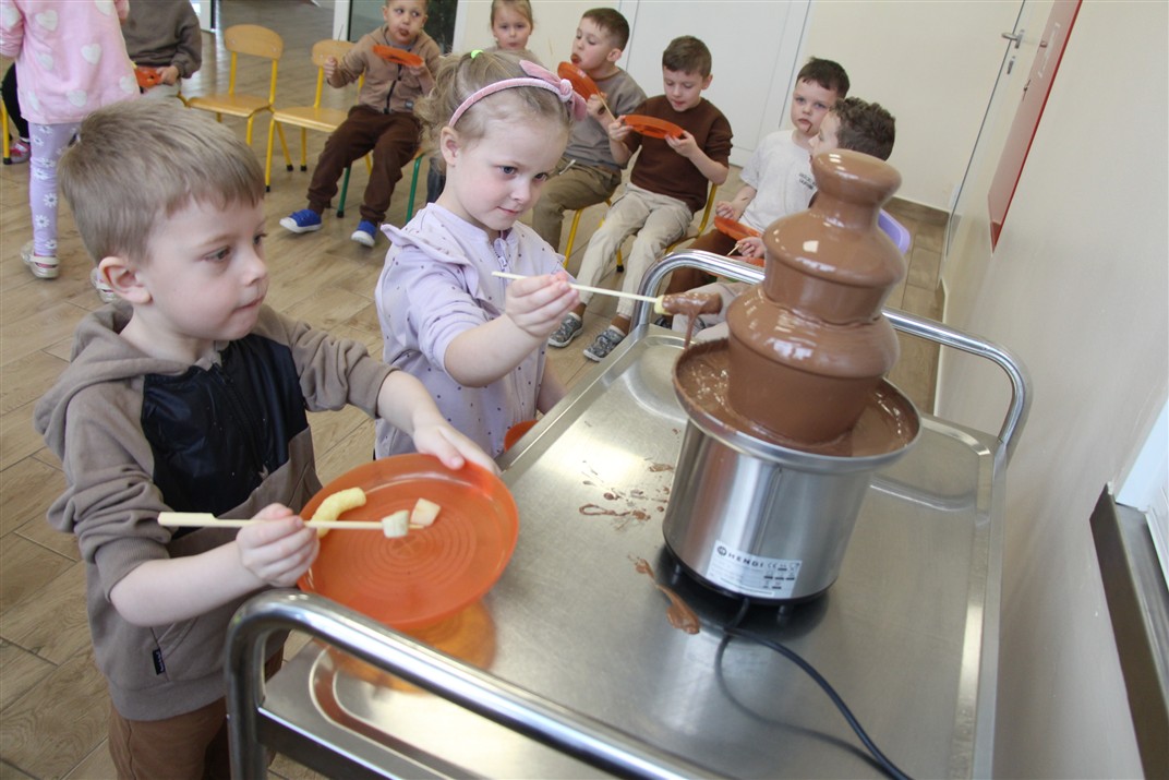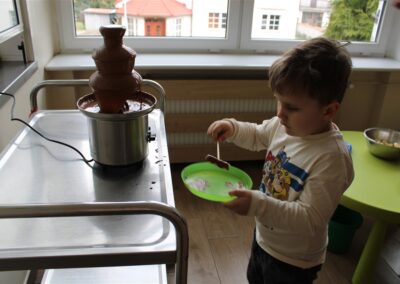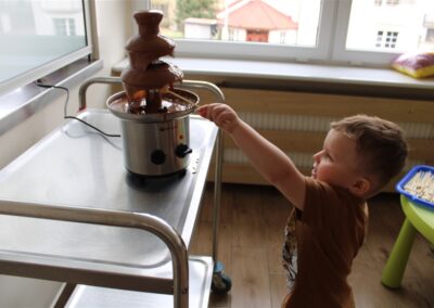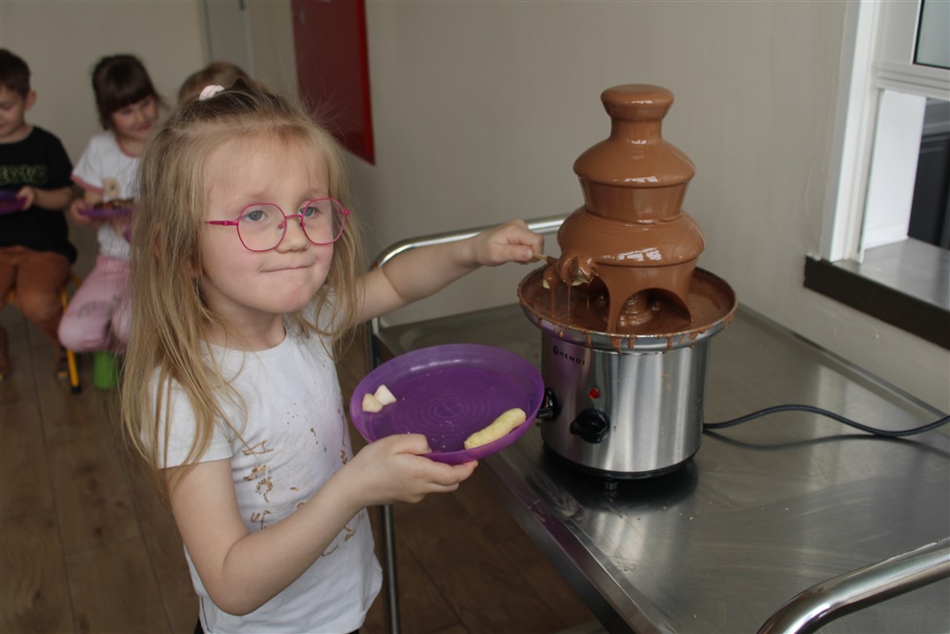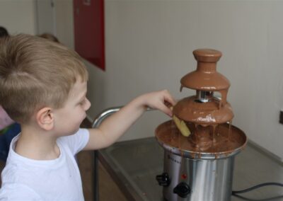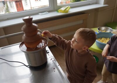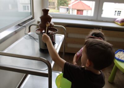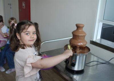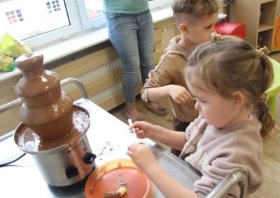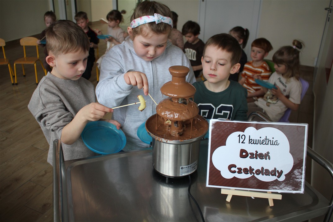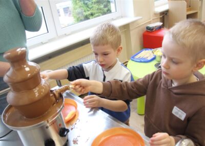 13 kwietnia w naszym przedszkolu obchodziliśmy wyjątkowy i bardzo słodki Dzień Czekolady. Tego dnia dzieci poznały skąd pochodzi czekolada i jak powstaje – od ziaren kakaowca aż po gotowy produkt. Przedszkolaki miały okazję poznać różne rodzaje czekolady – mleczną, białą i z dodatkami. Najbardziej jednak wyczekiwane było spróbowanie tych słodkości. Na dzieci czekała przygotowana fontanna czekolady z owocami. To był wyjątkowy dzień pełen radości oraz oczywiście królowej tego dnia – czekolady!