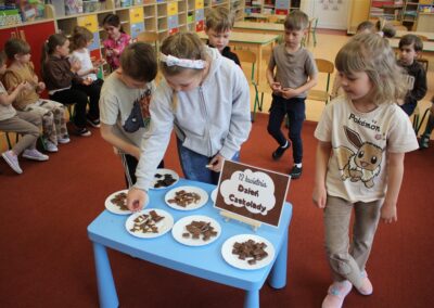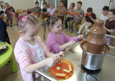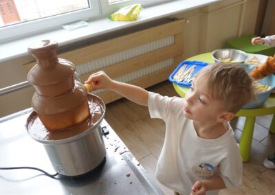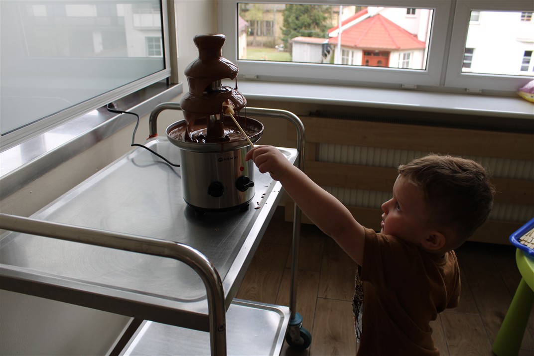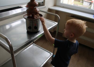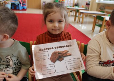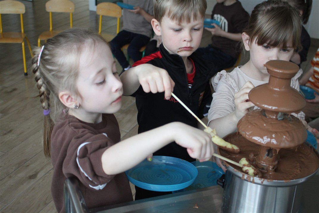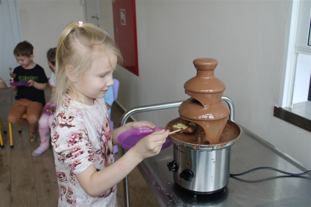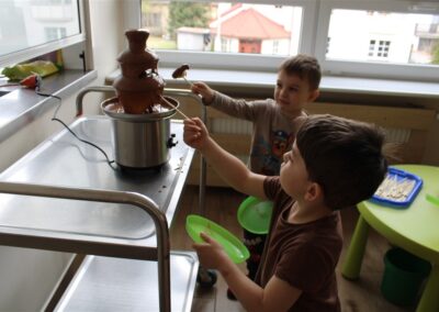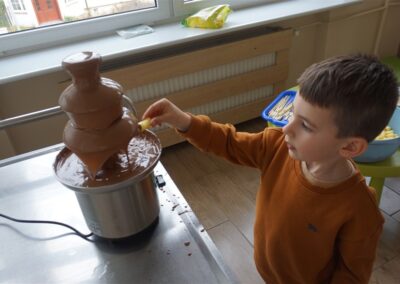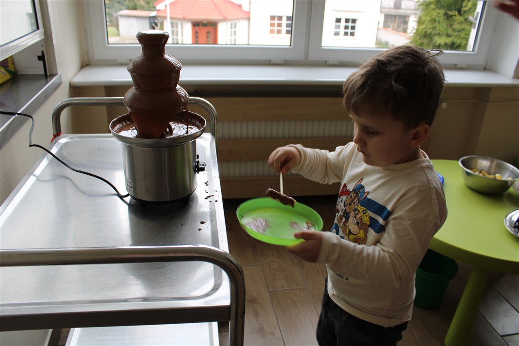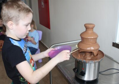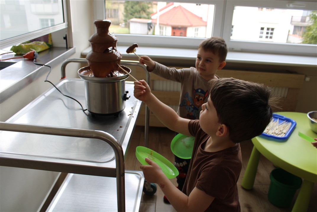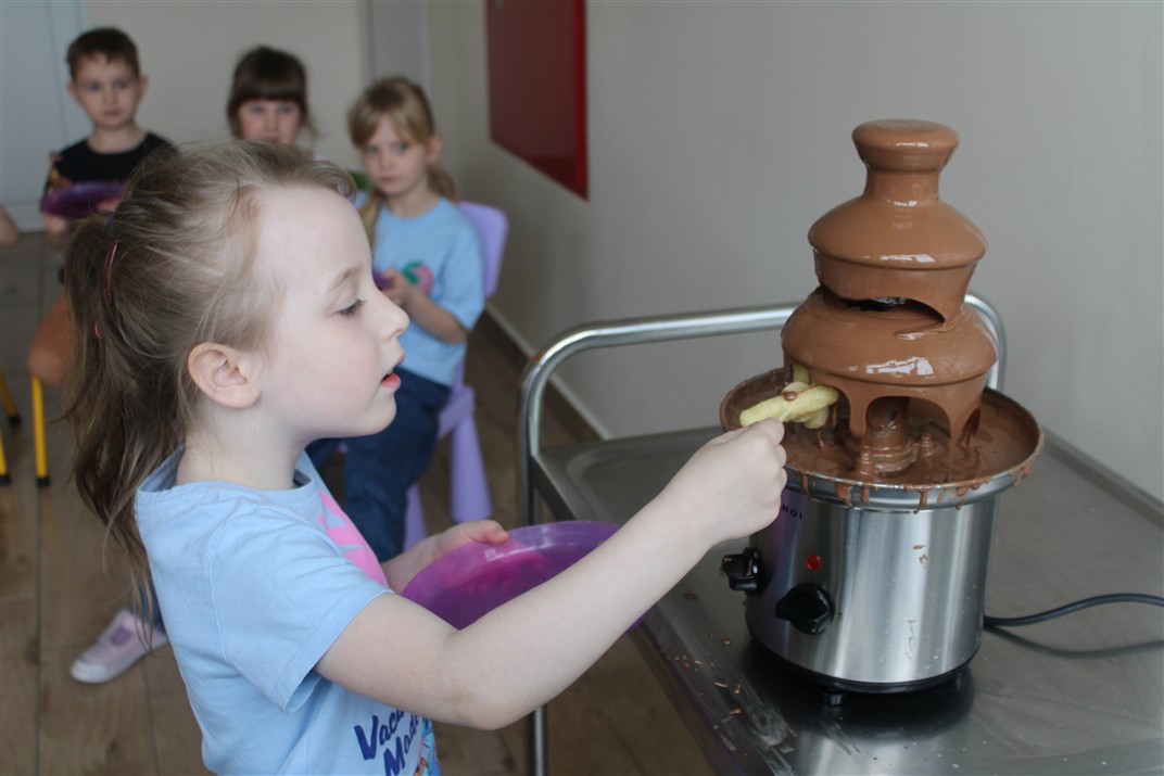 13 kwietnia w naszym przedszkolu obchodziliśmy wyjątkowy i bardzo słodki Dzień Czekolady. Tego dnia dzieci poznały skąd pochodzi czekolada i jak powstaje – od ziaren kakaowca aż po gotowy produkt. Przedszkolaki miały okazję poznać różne rodzaje czekolady – mleczną, białą i z dodatkami. Najbardziej jednak wyczekiwane było spróbowanie tych słodkości. Na dzieci czekała przygotowana fontanna czekolady z owocami. To był wyjątkowy dzień pełen radości oraz oczywiście królowej tego dnia – czekolady!