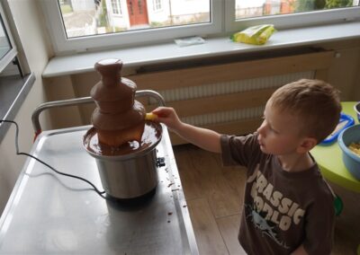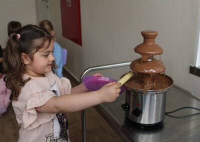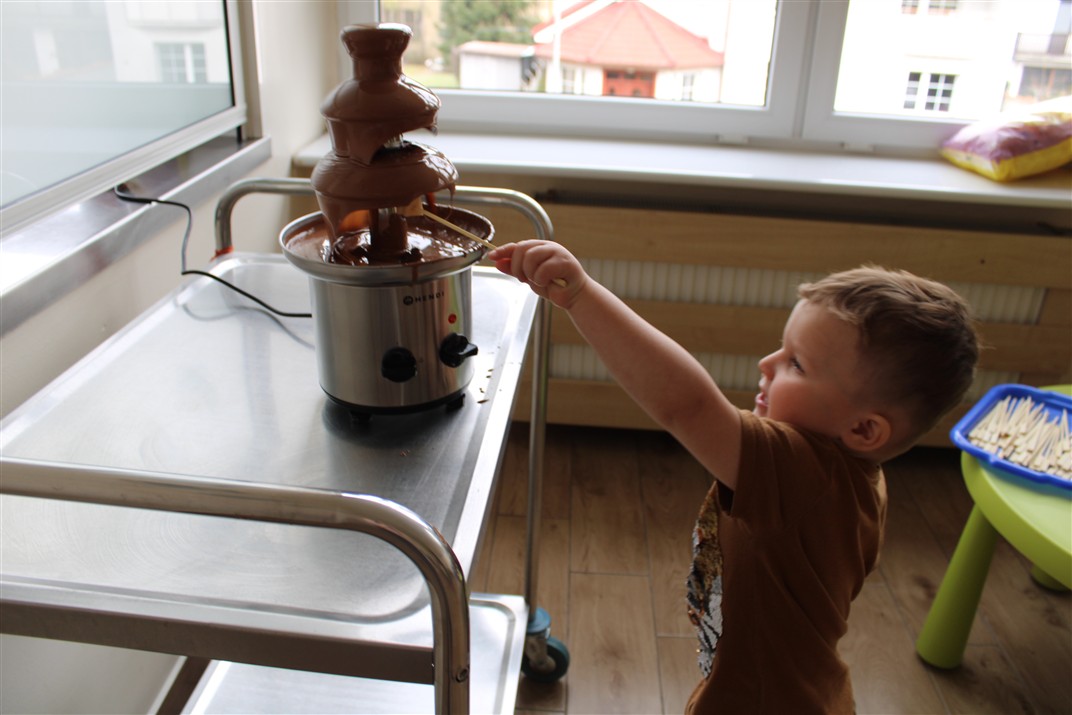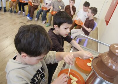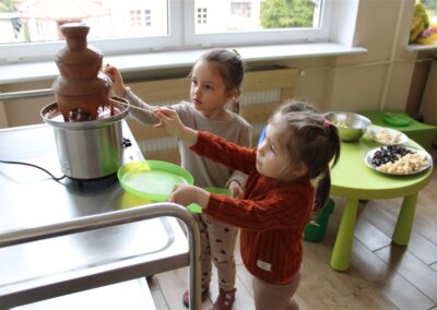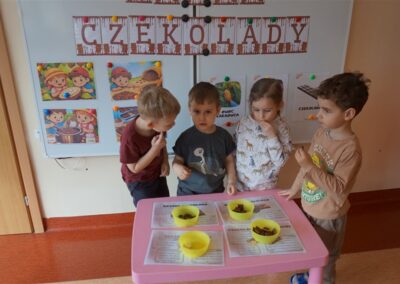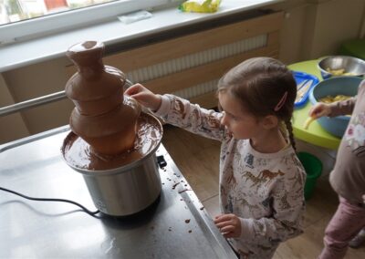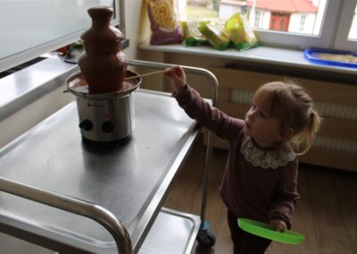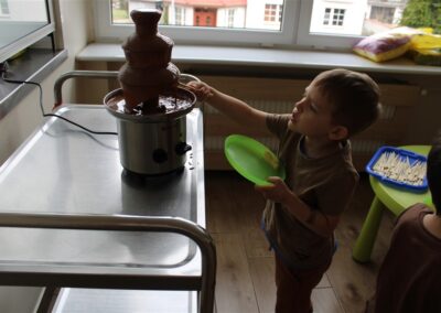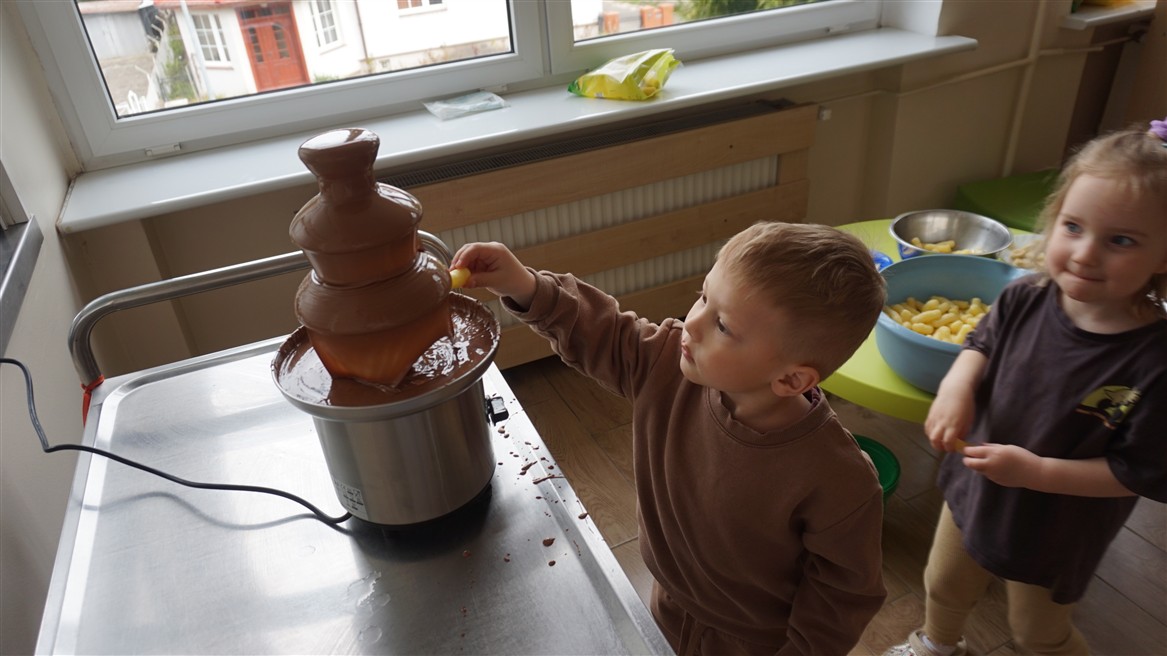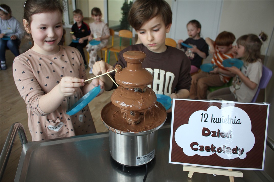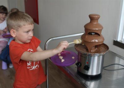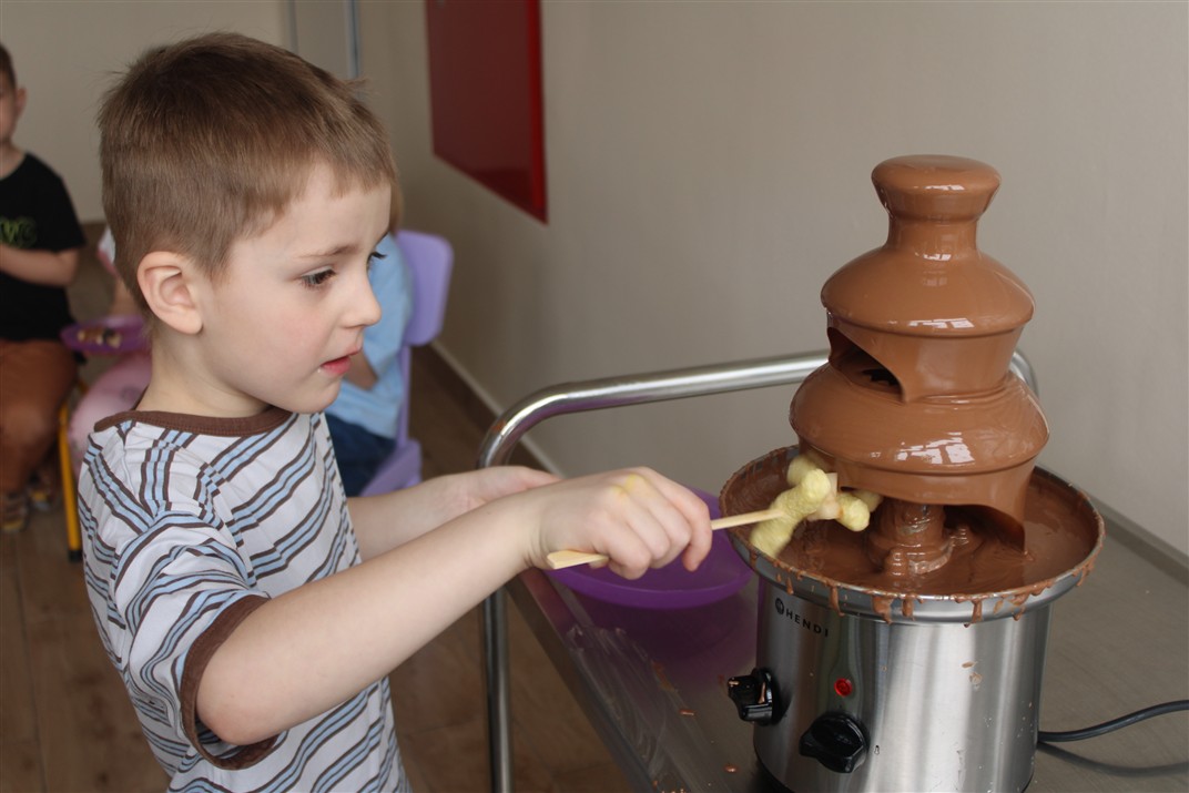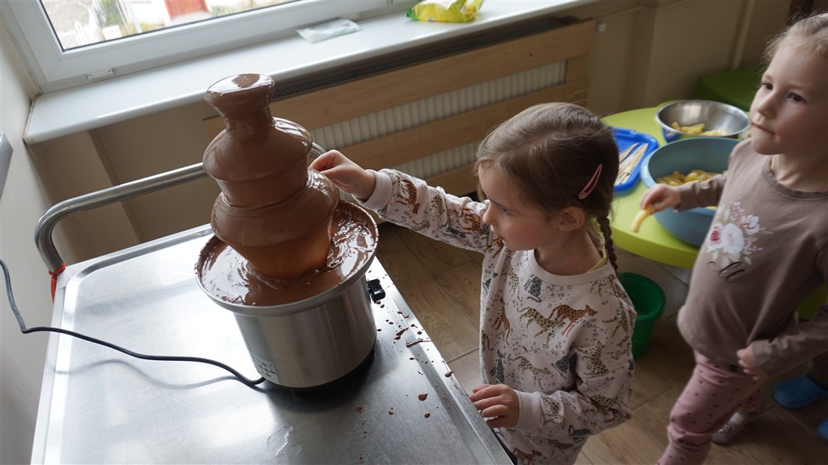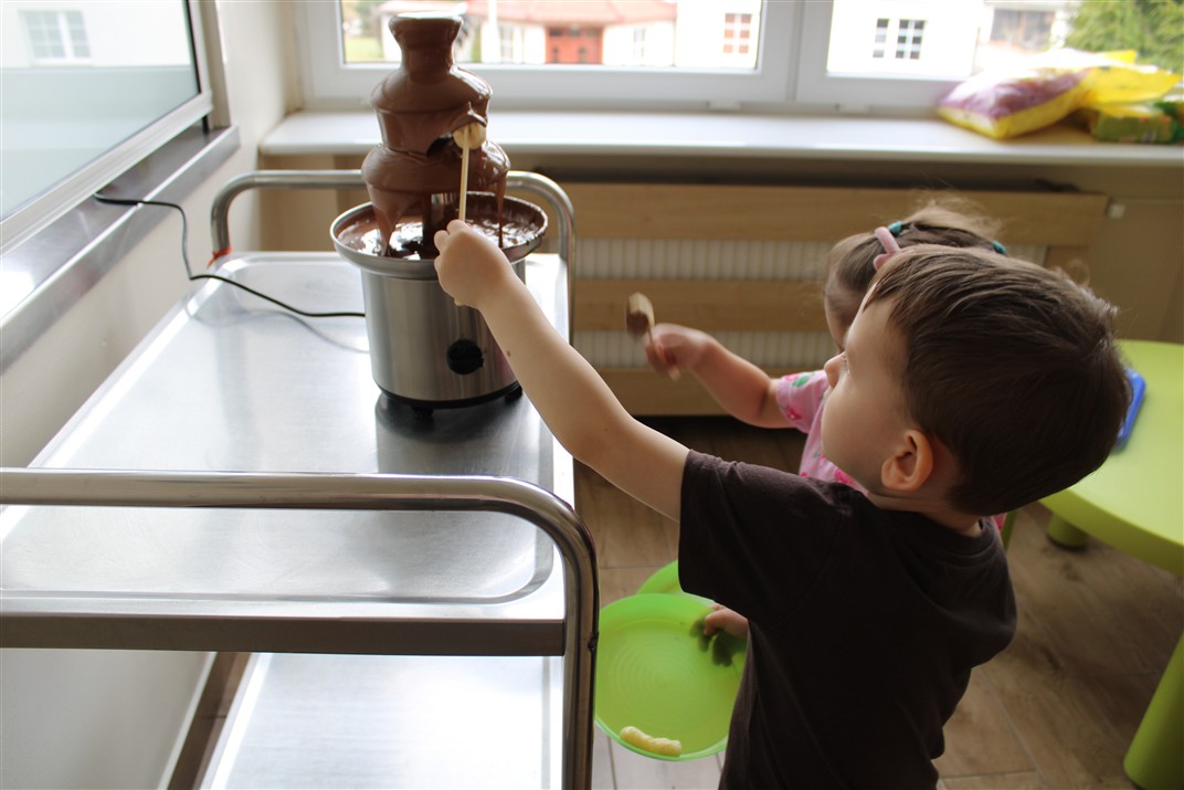 13 kwietnia w naszym przedszkolu obchodziliśmy wyjątkowy i bardzo słodki Dzień Czekolady. Tego dnia dzieci poznały skąd pochodzi czekolada i jak powstaje – od ziaren kakaowca aż po gotowy produkt. Przedszkolaki miały okazję poznać różne rodzaje czekolady – mleczną, białą i z dodatkami. Najbardziej jednak wyczekiwane było spróbowanie tych słodkości. Na dzieci czekała przygotowana fontanna czekolady z owocami. To był wyjątkowy dzień pełen radości oraz oczywiście królowej tego dnia – czekolady!