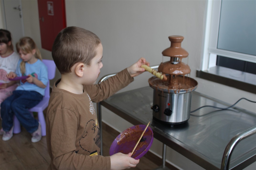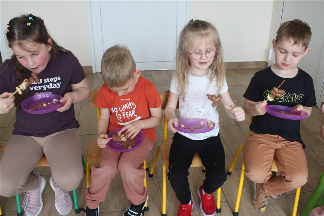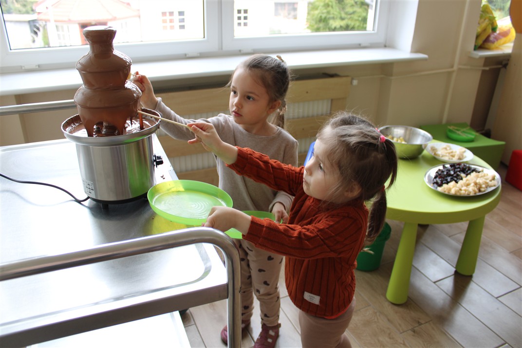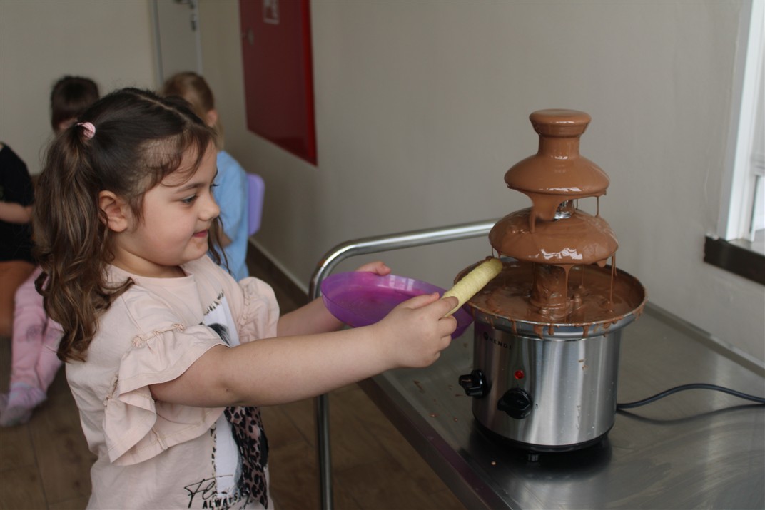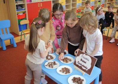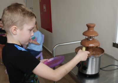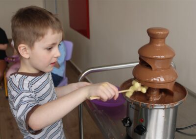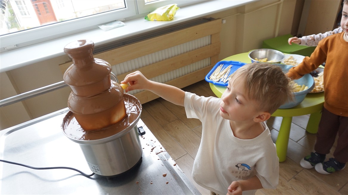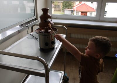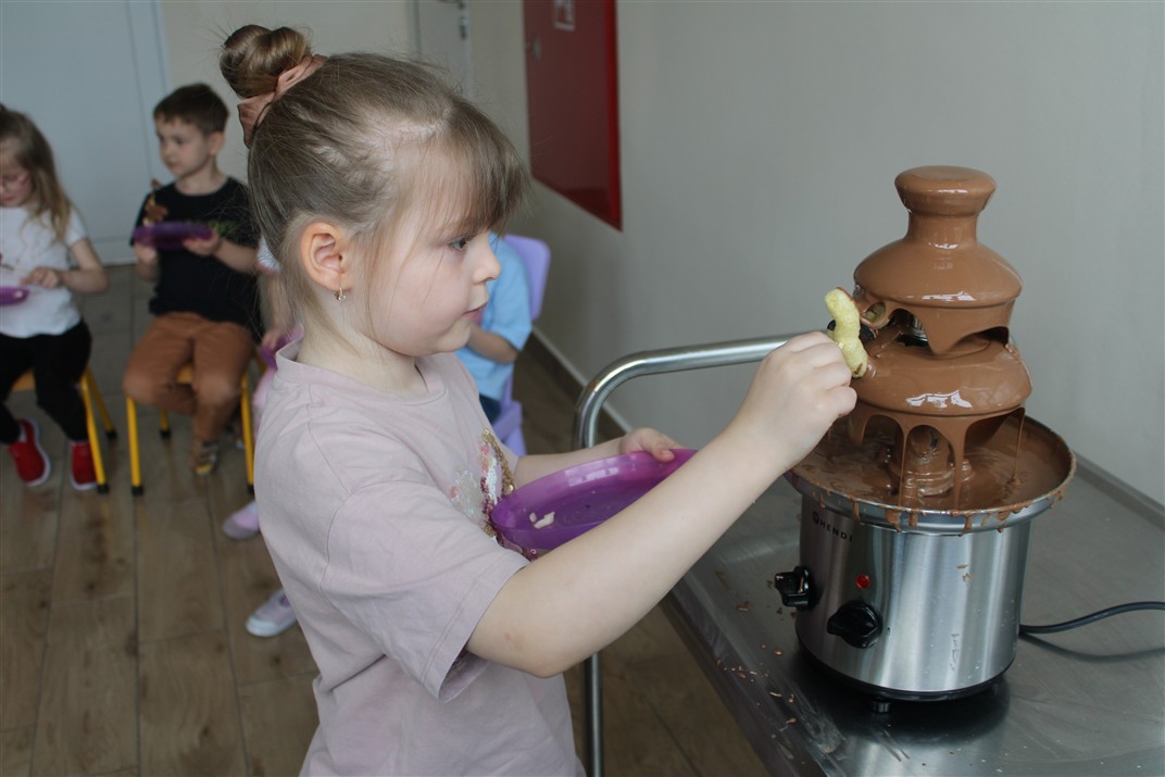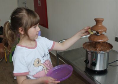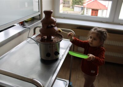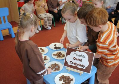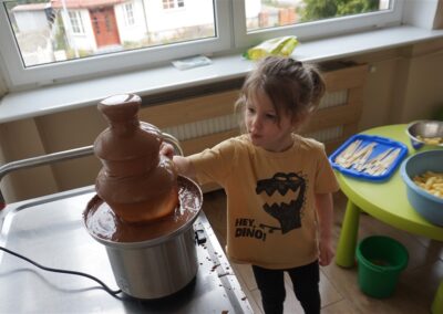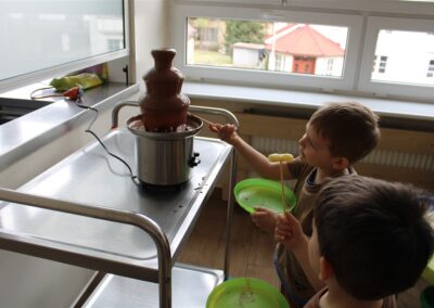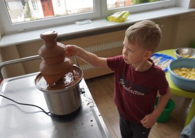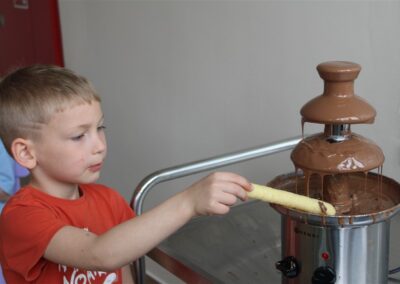 13 kwietnia w naszym przedszkolu obchodziliśmy wyjątkowy i bardzo słodki Dzień Czekolady. Tego dnia dzieci poznały skąd pochodzi czekolada i jak powstaje – od ziaren kakaowca aż po gotowy produkt. Przedszkolaki miały okazję poznać różne rodzaje czekolady – mleczną, białą i z dodatkami. Najbardziej jednak wyczekiwane było spróbowanie tych słodkości. Na dzieci czekała przygotowana fontanna czekolady z owocami. To był wyjątkowy dzień pełen radości oraz oczywiście królowej tego dnia – czekolady!