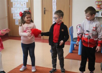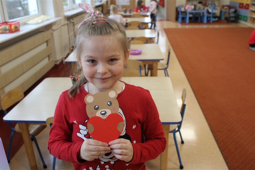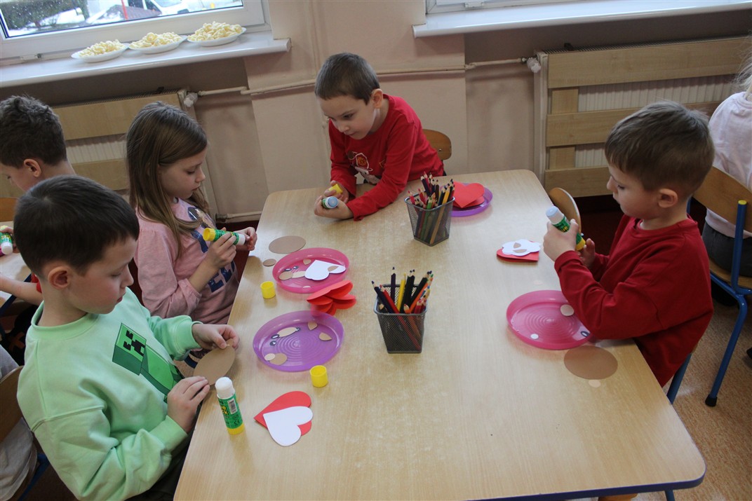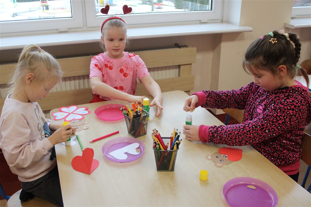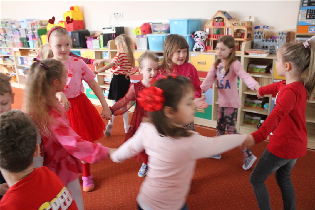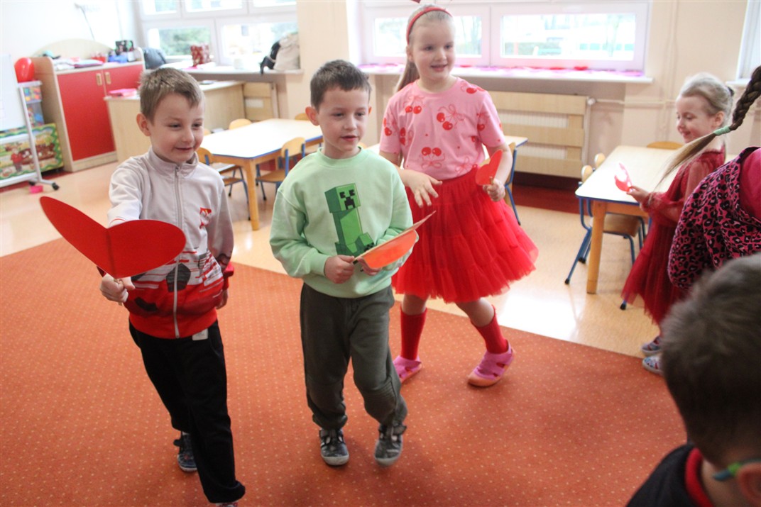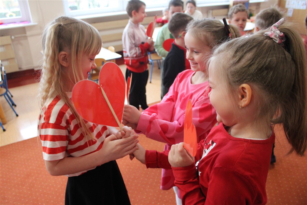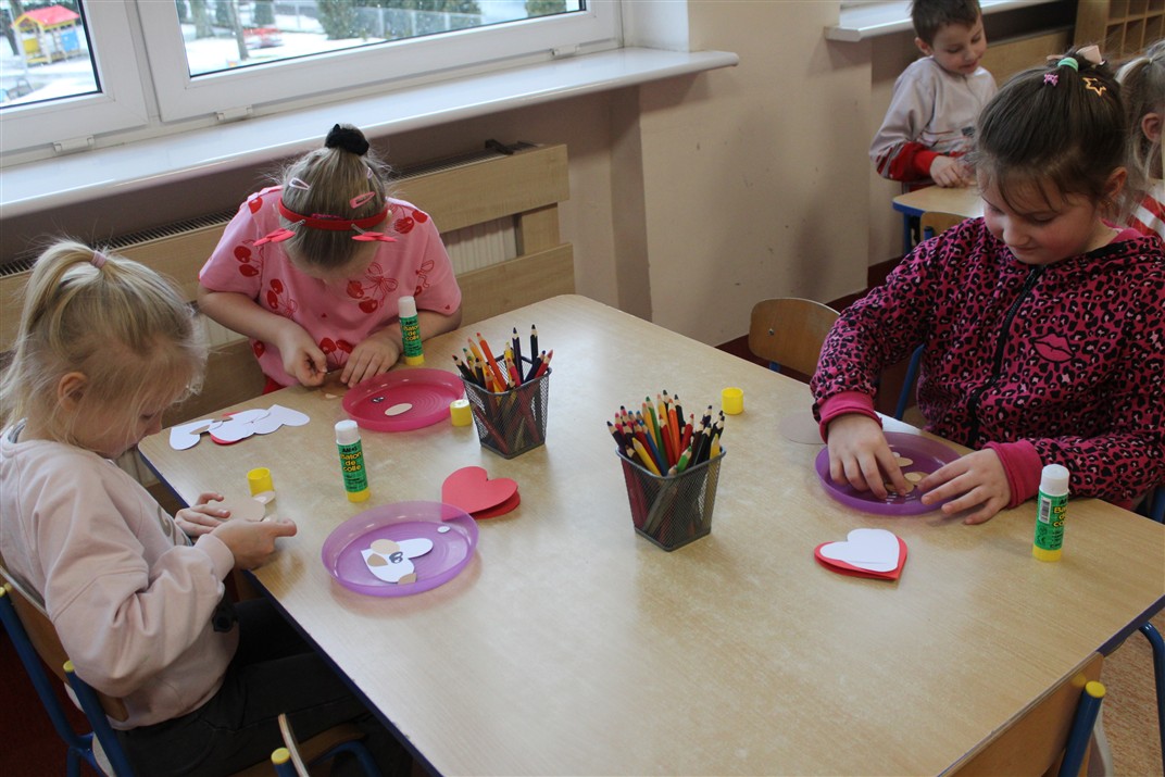 W dniu 13 lutego dzieci z grupy „Żabek” i „Biedronek” obchodziły Walentynki. Tego dnia wesoło bawiły się przy muzyce, układały memory, poznały bajkę dotyczącą Walentynek. Ponadto starszacy odkodowali obrazek przedstawiający serce, rozwiązali krzyżówkę o zakochanych bohaterach ulubionych bajek, której hasło brzmiało Walentynki. Natomiast podczas zabawy plastycznej wykonały walentynkę dla rodziców. Dzieci świetnie bawiły się i jednocześnie uczyły się okazywać uczucia innym osobom – kolegom, koleżankom, rodzicom… Był to dzień, który sprawił im wiele radości i niespodzianek.