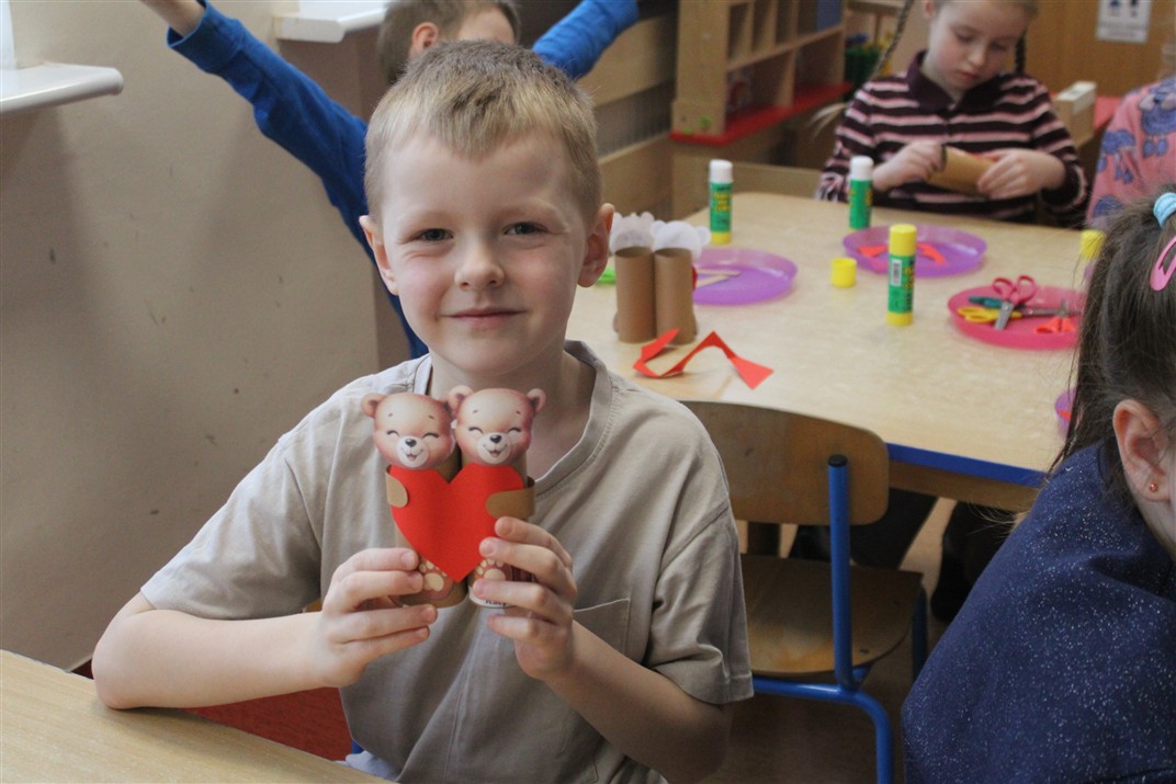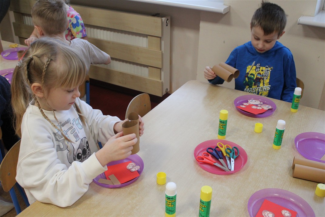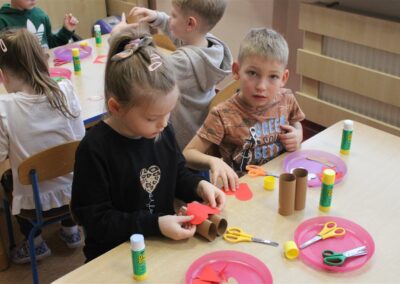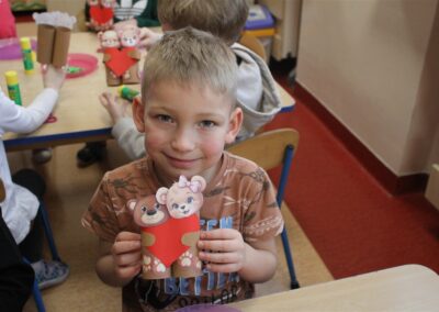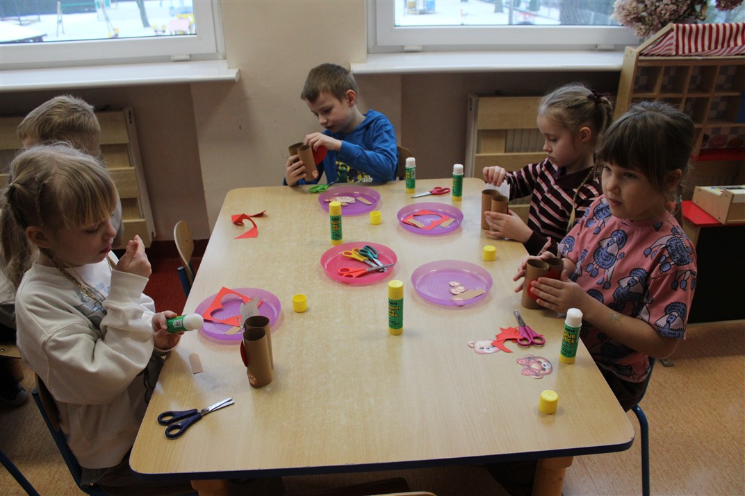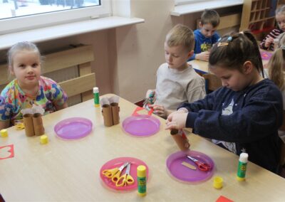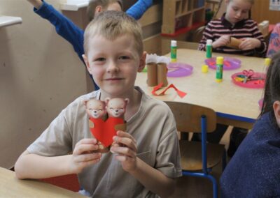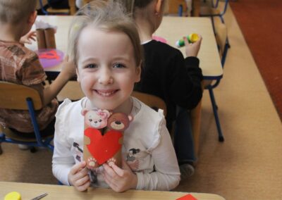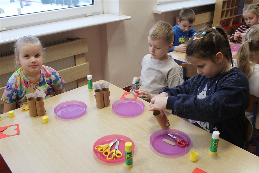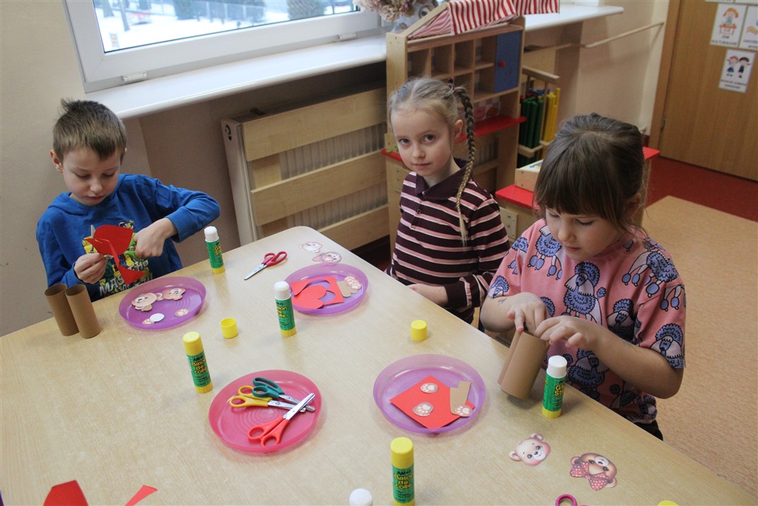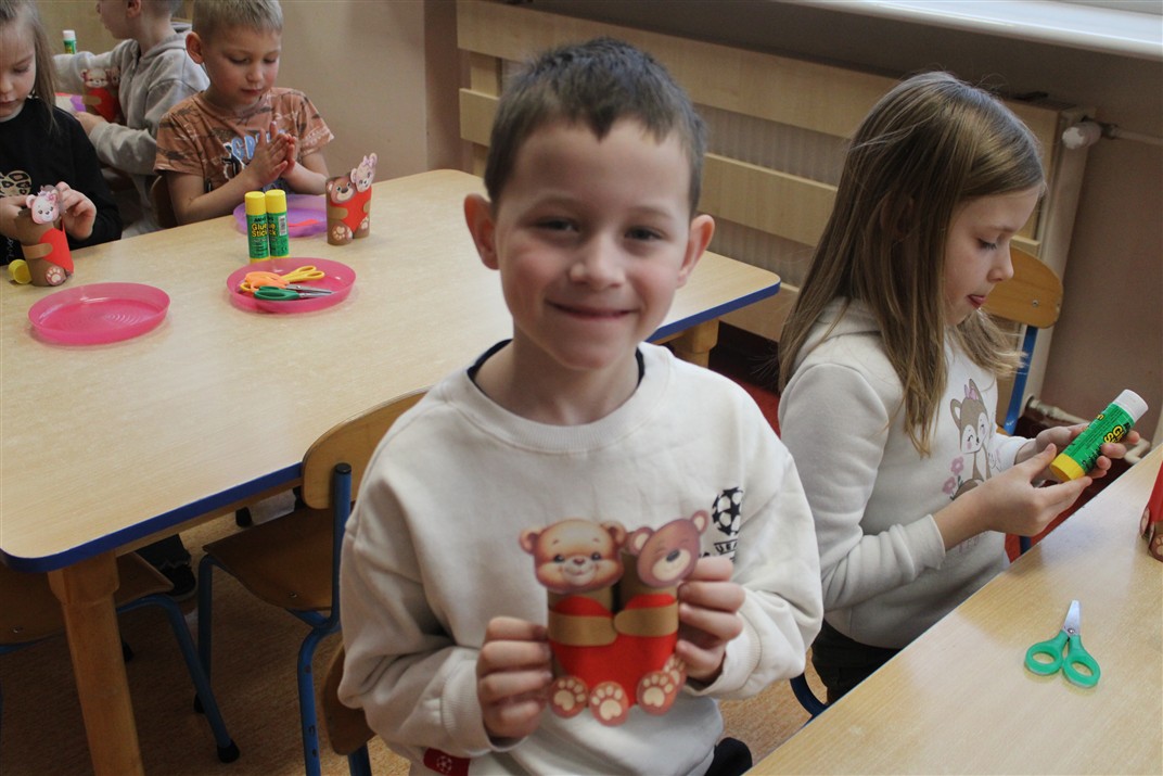 Podczas plastycznego kółka zainteresowań dzieci wykonały pracę przestrzenną – przytulające się misie z serduszkiem. Pracowały według pokazu nauczyciela. Na początku skleiły papierowe rolki, następnie wycięły serce z czerwonej kartki papieru. Dokleiły do rolek elementy sylwet misiów i wycięte serce. Bawiły się świetnie, a przy tym rozwijały wiarę we własne możliwości, kreatywność oraz sprawność dłoni. Prace zdobią hol przedszkola i zachęcają do okazywania uczuć.