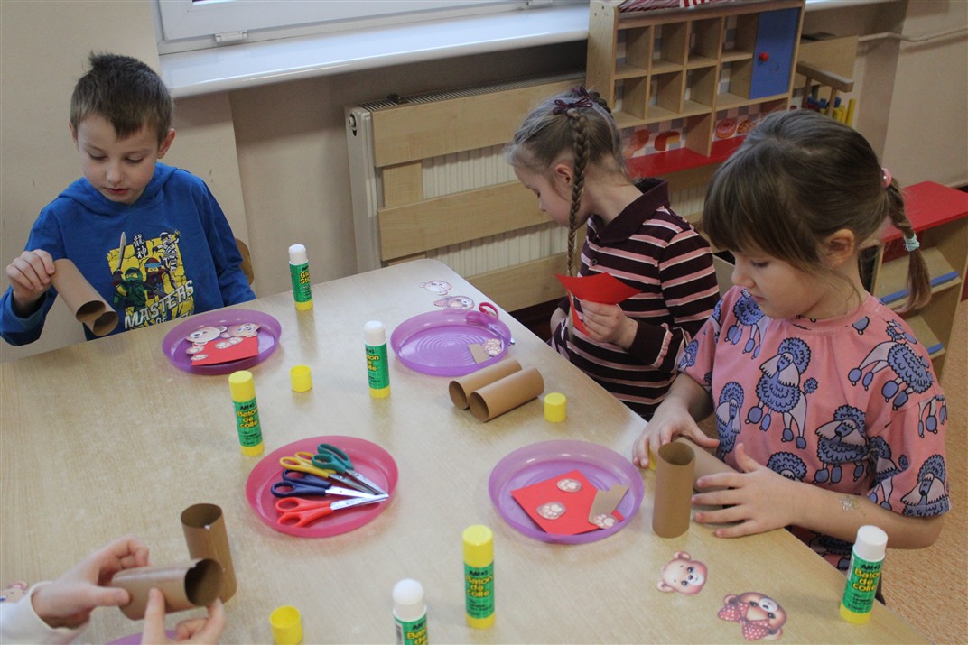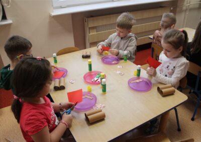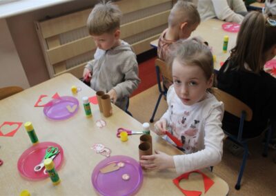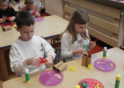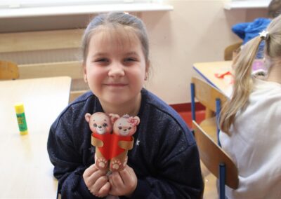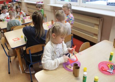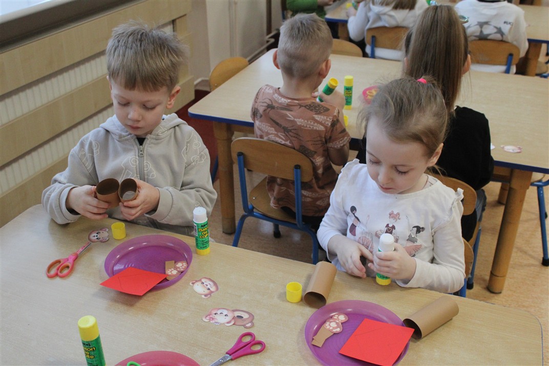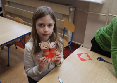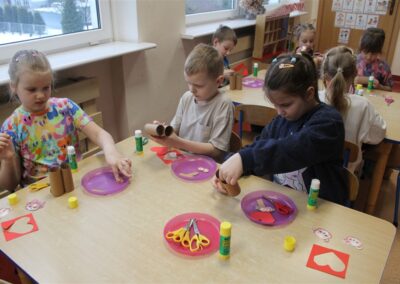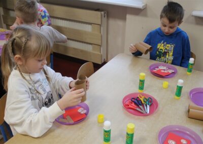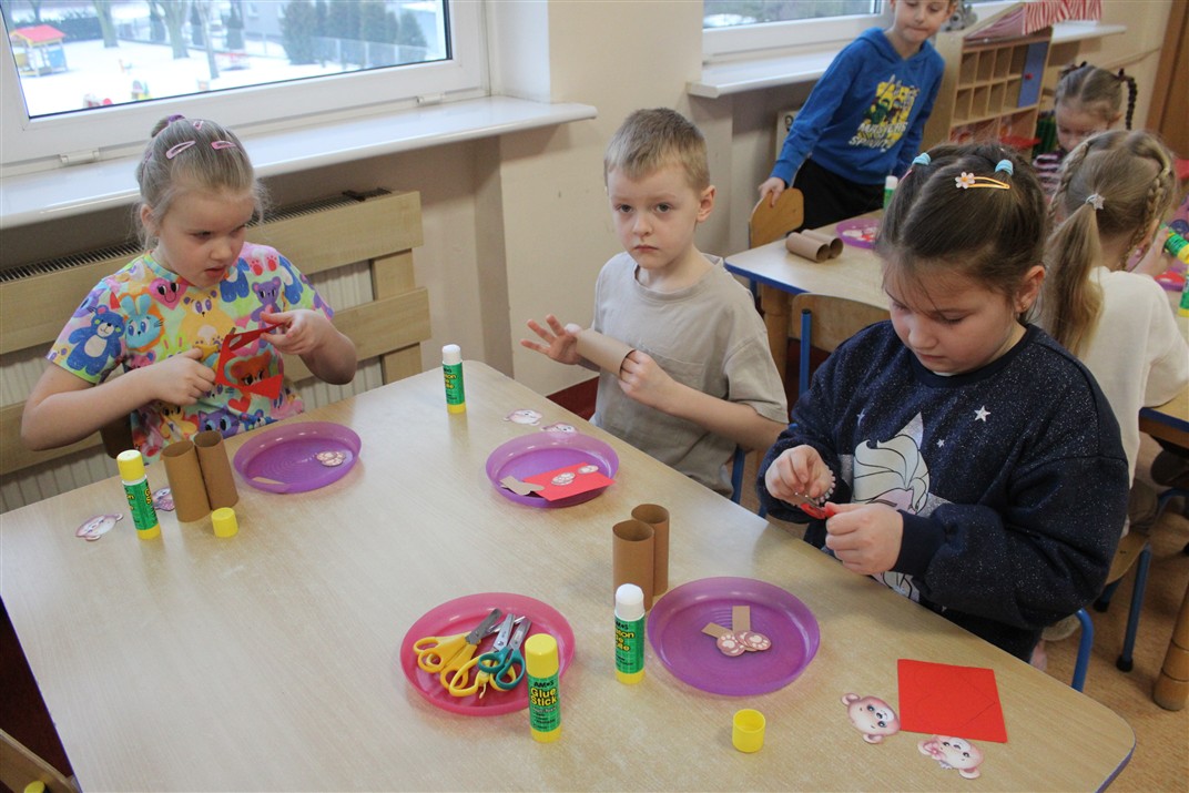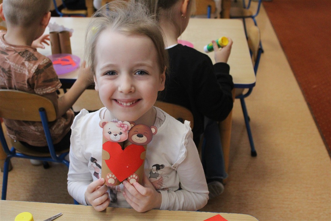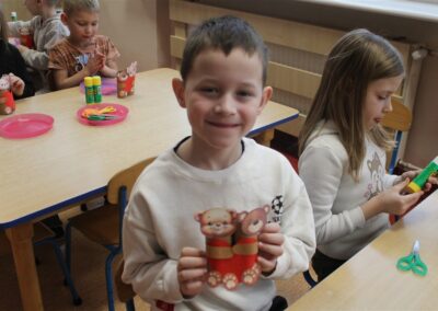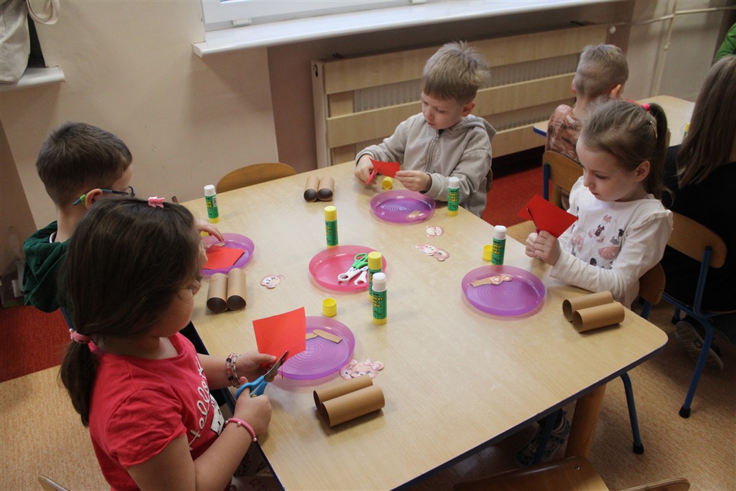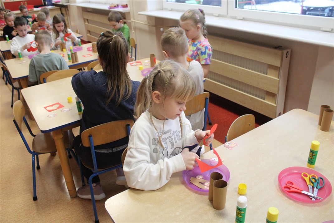 Podczas plastycznego kółka zainteresowań dzieci wykonały pracę przestrzenną – przytulające się misie z serduszkiem. Pracowały według pokazu nauczyciela. Na początku skleiły papierowe rolki, następnie wycięły serce z czerwonej kartki papieru. Dokleiły do rolek elementy sylwet misiów i wycięte serce. Bawiły się świetnie, a przy tym rozwijały wiarę we własne możliwości, kreatywność oraz sprawność dłoni. Prace zdobią hol przedszkola i zachęcają do okazywania uczuć.