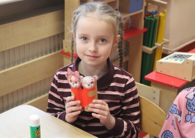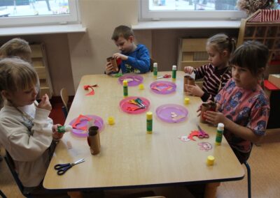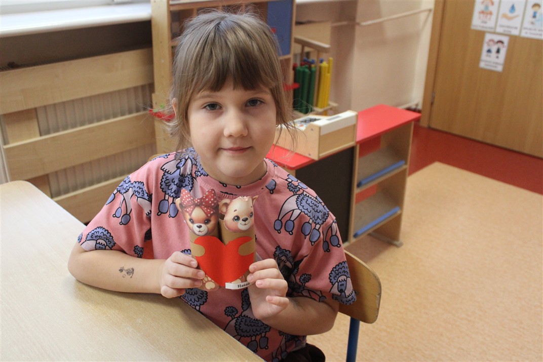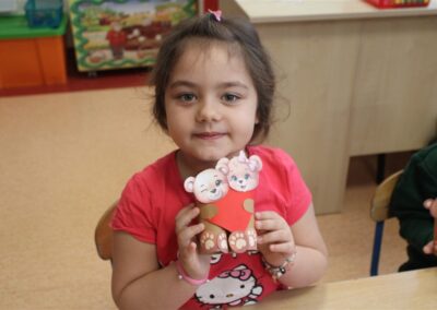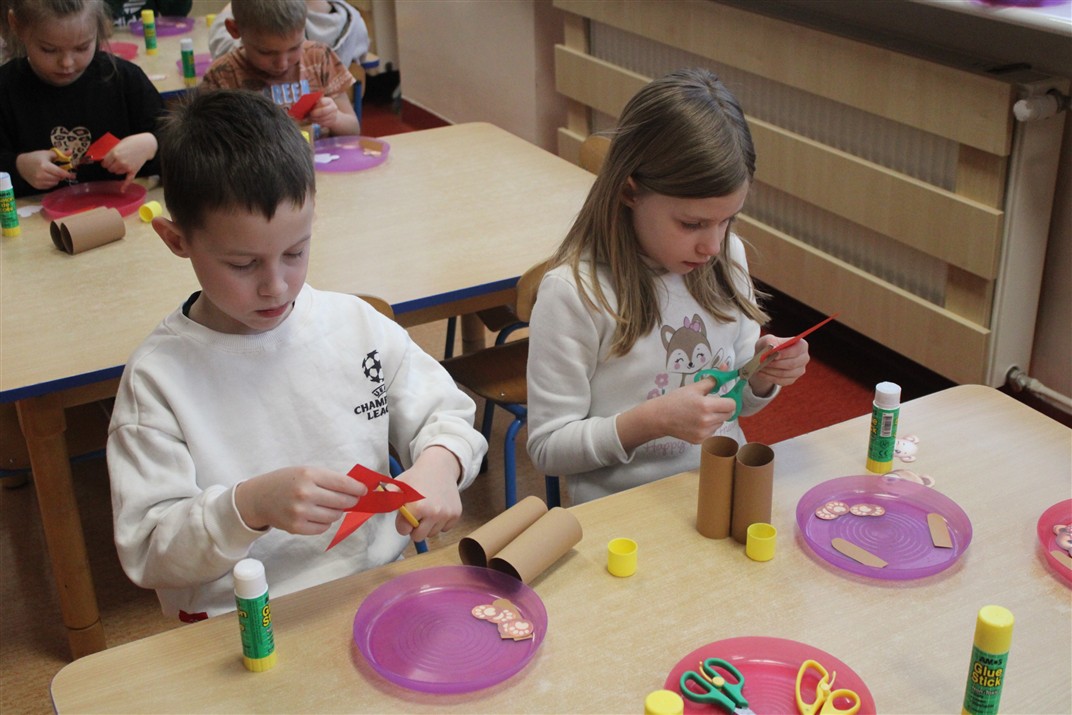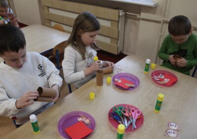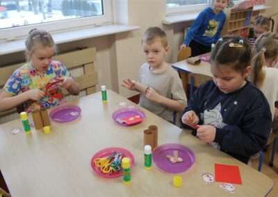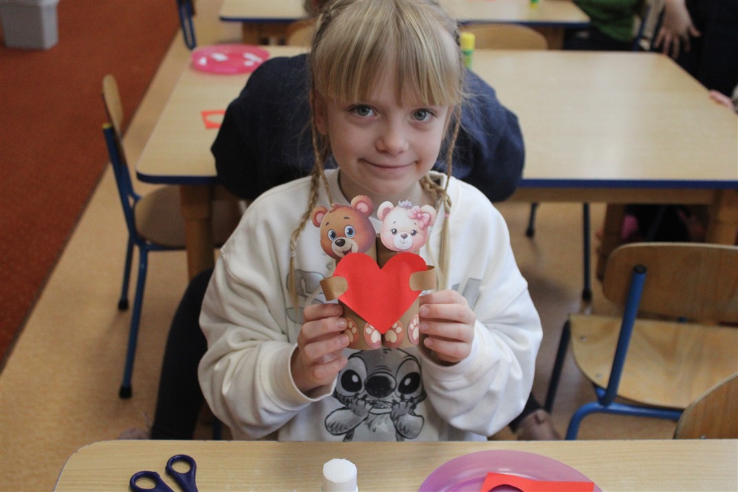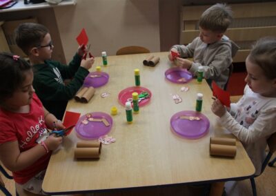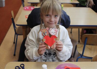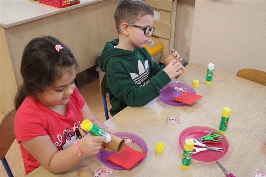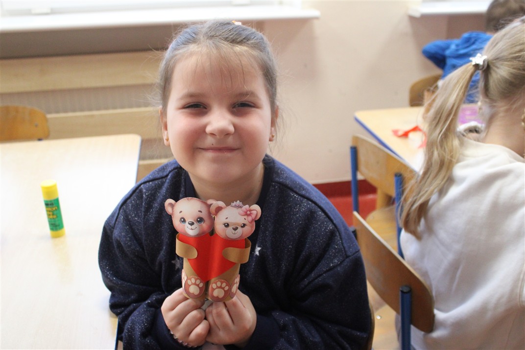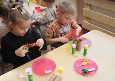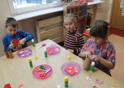 Podczas plastycznego kółka zainteresowań dzieci wykonały pracę przestrzenną – przytulające się misie z serduszkiem. Pracowały według pokazu nauczyciela. Na początku skleiły papierowe rolki, następnie wycięły serce z czerwonej kartki papieru. Dokleiły do rolek elementy sylwet misiów i wycięte serce. Bawiły się świetnie, a przy tym rozwijały wiarę we własne możliwości, kreatywność oraz sprawność dłoni. Prace zdobią hol przedszkola i zachęcają do okazywania uczuć.