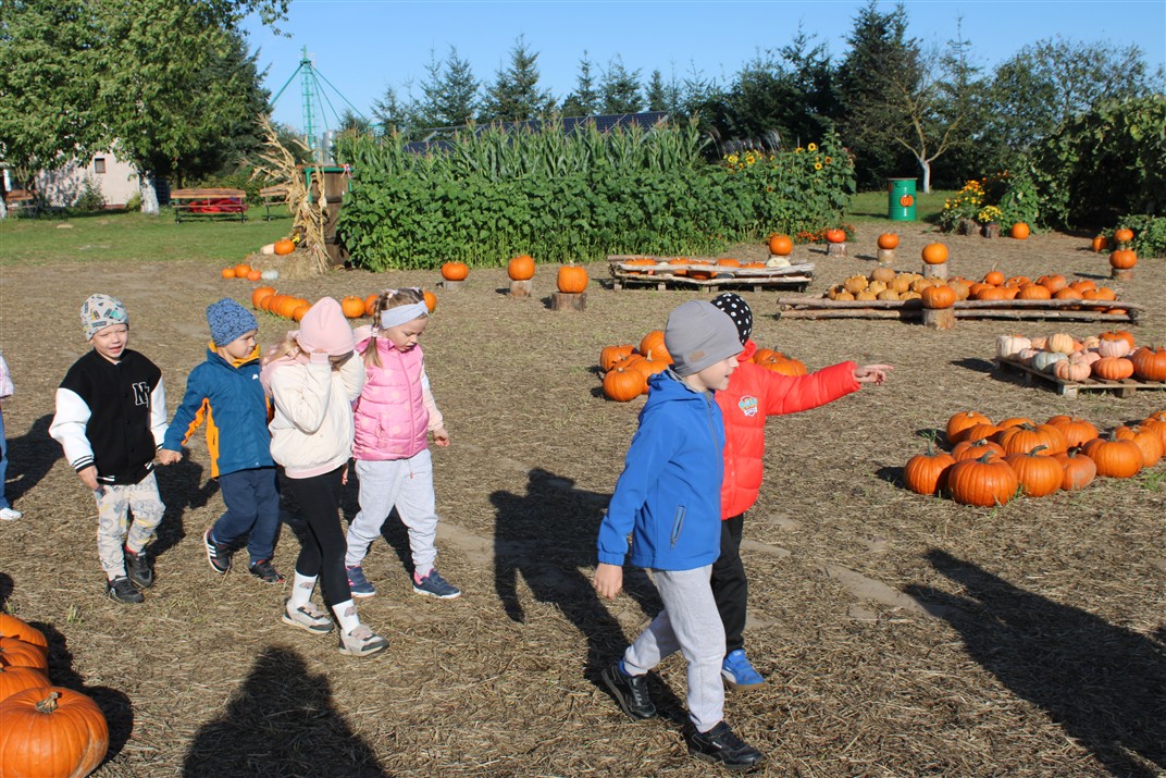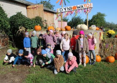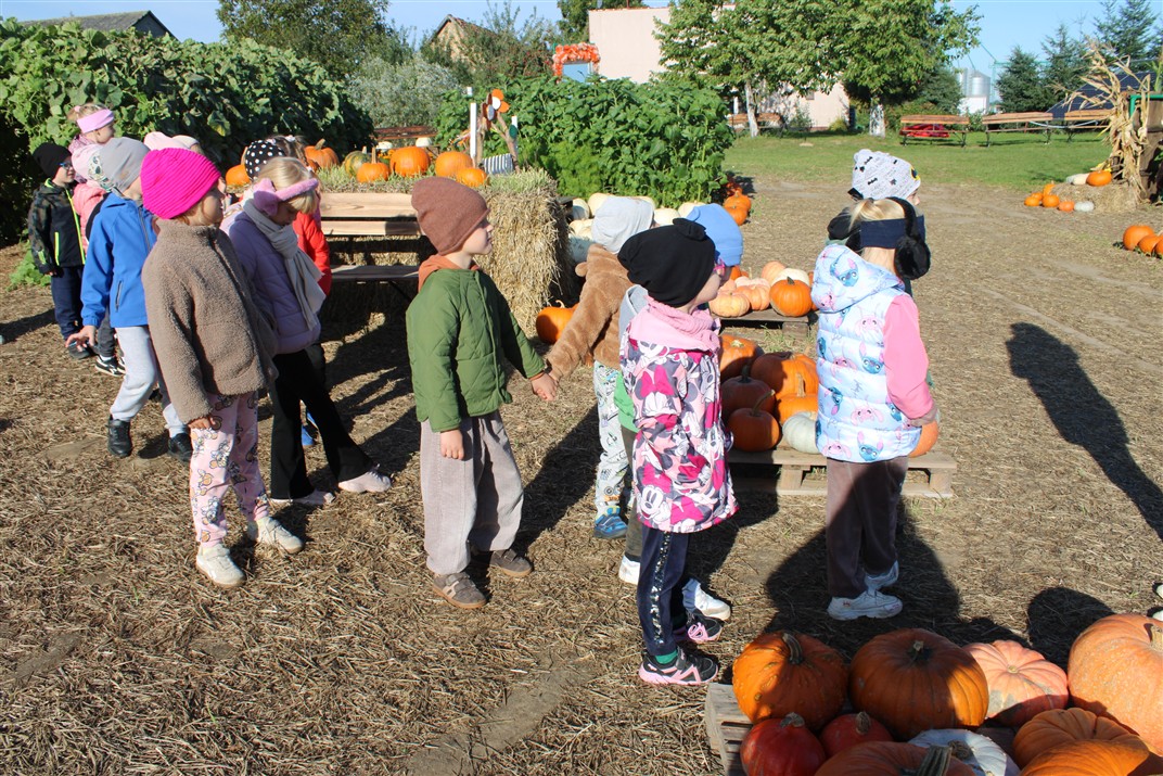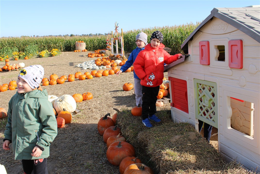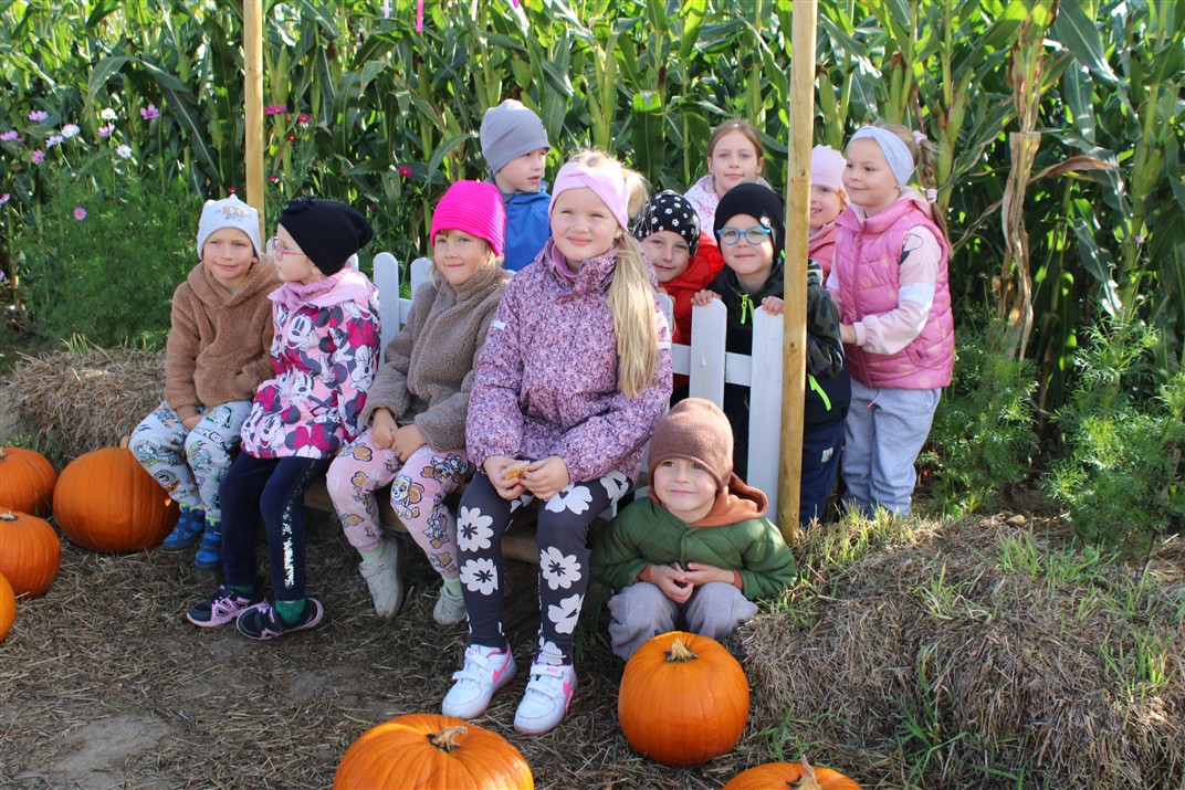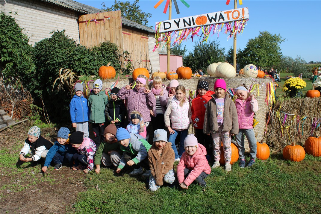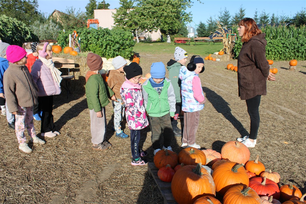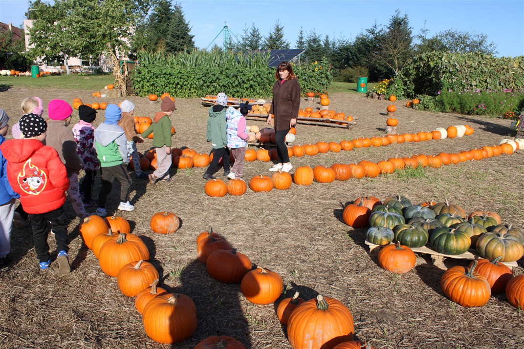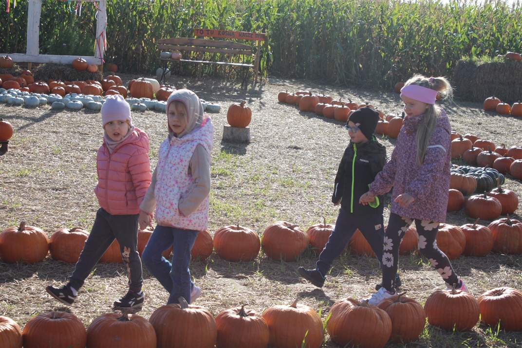W dniu 26 września dzieci z grupy „Biedronek” wyjechały na wycieczkę do Kopaszyna, na farmę dyń „Dyniowato”. Na początku spotkania dowiedziały się, jak wiele gatunków dyń zgromadzonych jest na farmie, jak one wyglądają i które z nich są przeznaczone do jedzenia, a które nie. Obejrzały pole, na którym urosły dynie i poznały wiadomości na temat warunków potrzebnych dyniom do wzrostu. Podczas warsztatów miały okazję obejrzeć ogromne dynie także od środka i wybrać z nich pestki, które zabrały do domu. Najatrakcyjniejsze jednak okazały się zabawy ruchowe wśród setek dyń, w tym wędrowanie labiryntem wśród kukurydzy i wielu dyń, czy też zabawy na dyniowym placu zabaw.