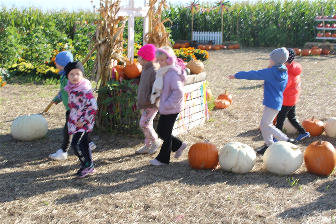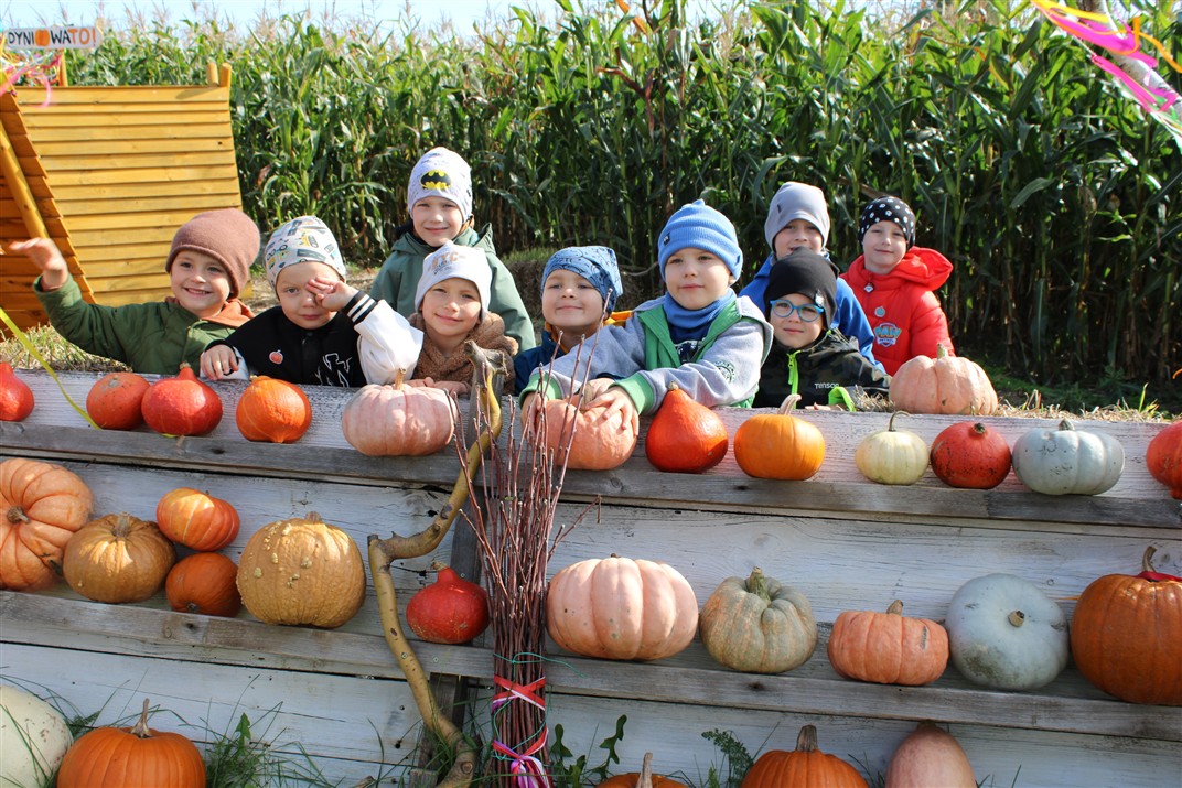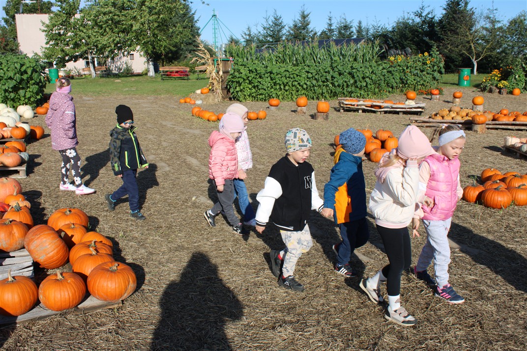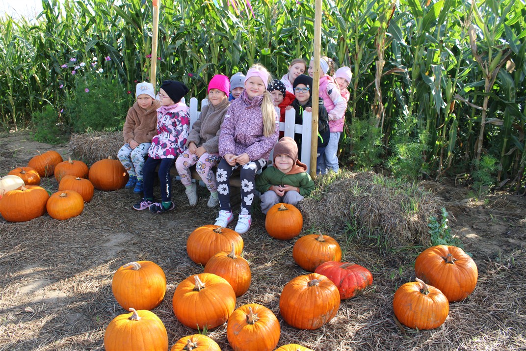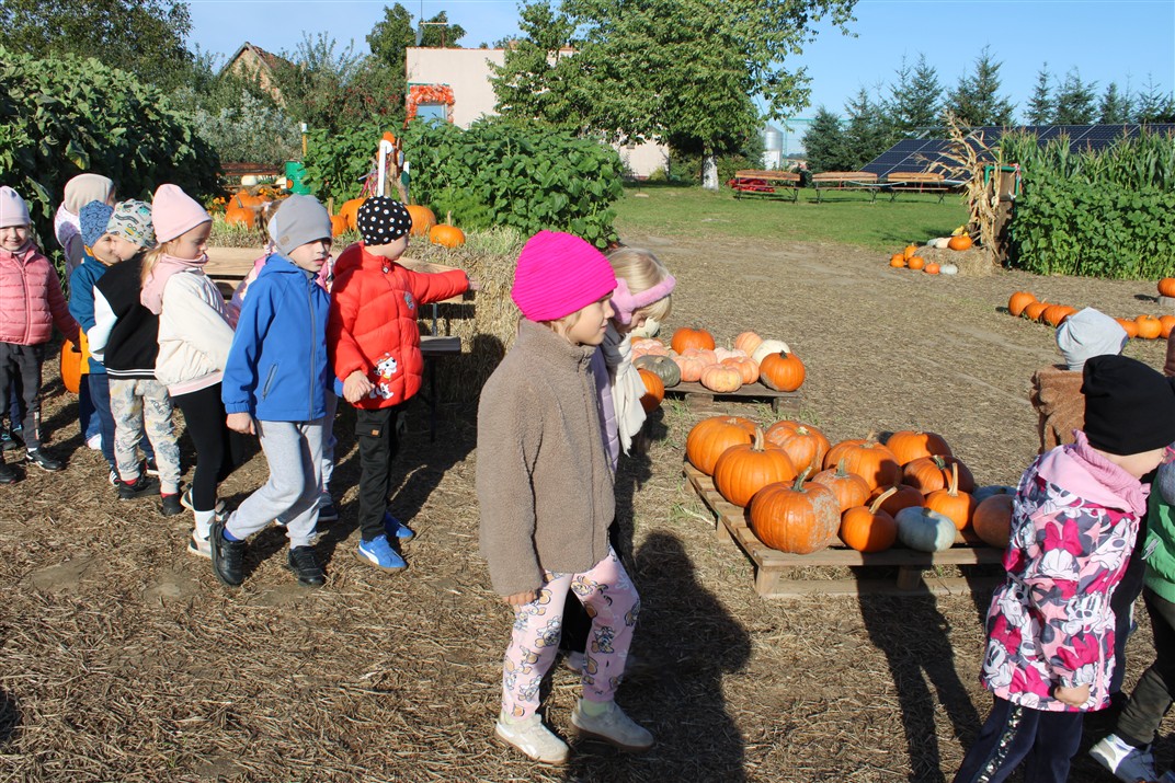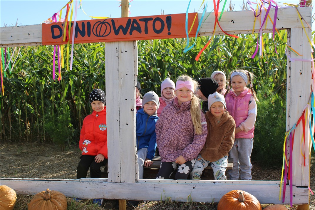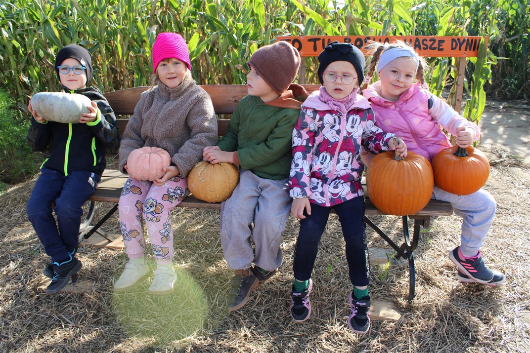W dniu 26 września dzieci z grupy „Biedronek” wyjechały na wycieczkę do Kopaszyna, na farmę dyń „Dyniowato”. Na początku spotkania dowiedziały się, jak wiele gatunków dyń zgromadzonych jest na farmie, jak one wyglądają i które z nich są przeznaczone do jedzenia, a które nie. Obejrzały pole, na którym urosły dynie i poznały wiadomości na temat warunków potrzebnych dyniom do wzrostu. Podczas warsztatów miały okazję obejrzeć ogromne dynie także od środka i wybrać z nich pestki, które zabrały do domu. Najatrakcyjniejsze jednak okazały się zabawy ruchowe wśród setek dyń, w tym wędrowanie labiryntem wśród kukurydzy i wielu dyń, czy też zabawy na dyniowym placu zabaw.
