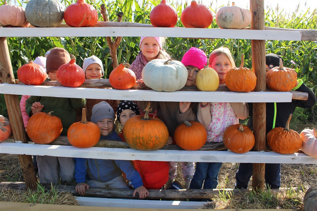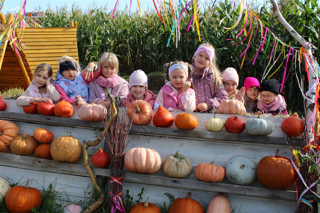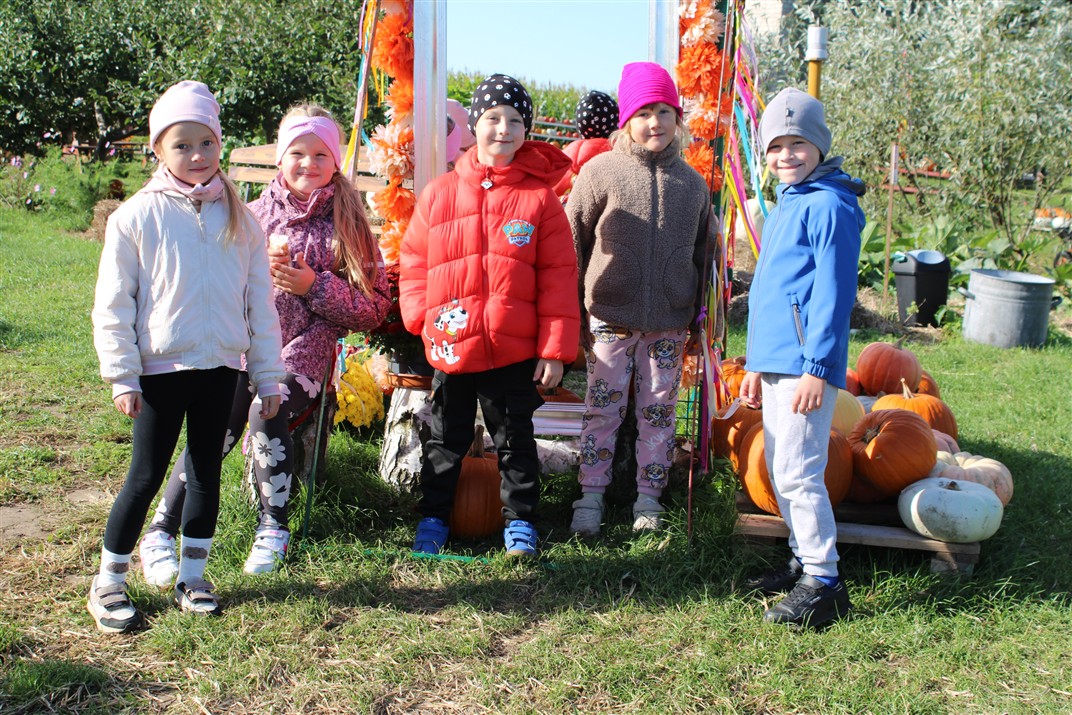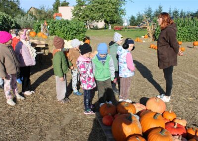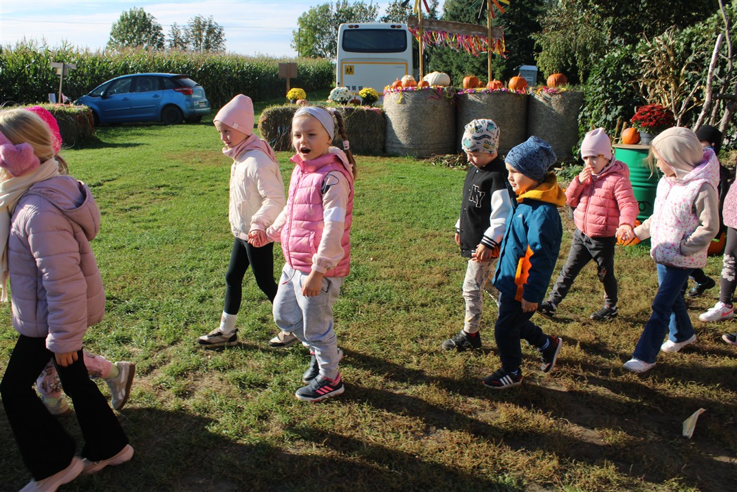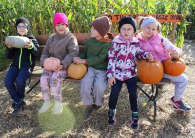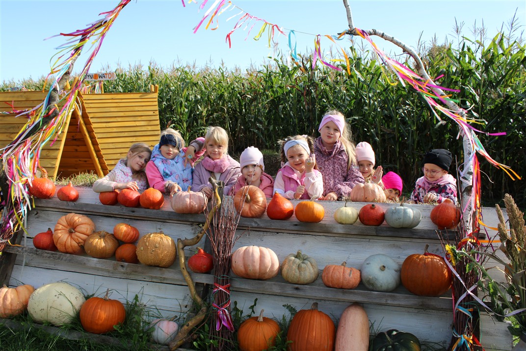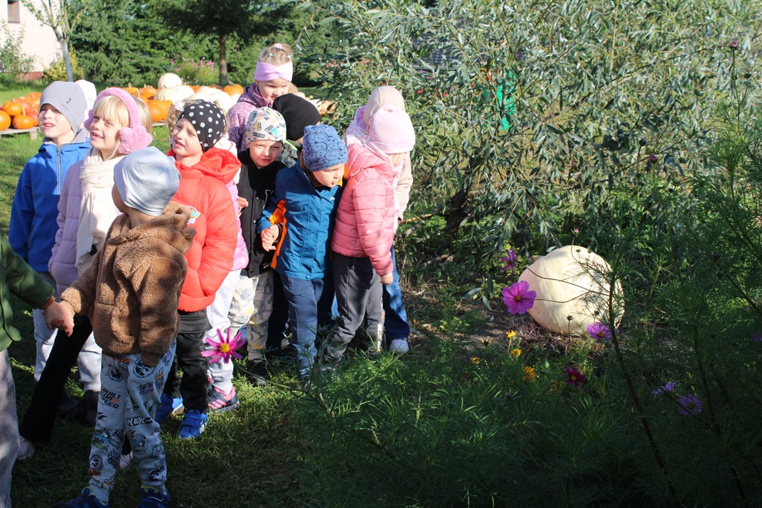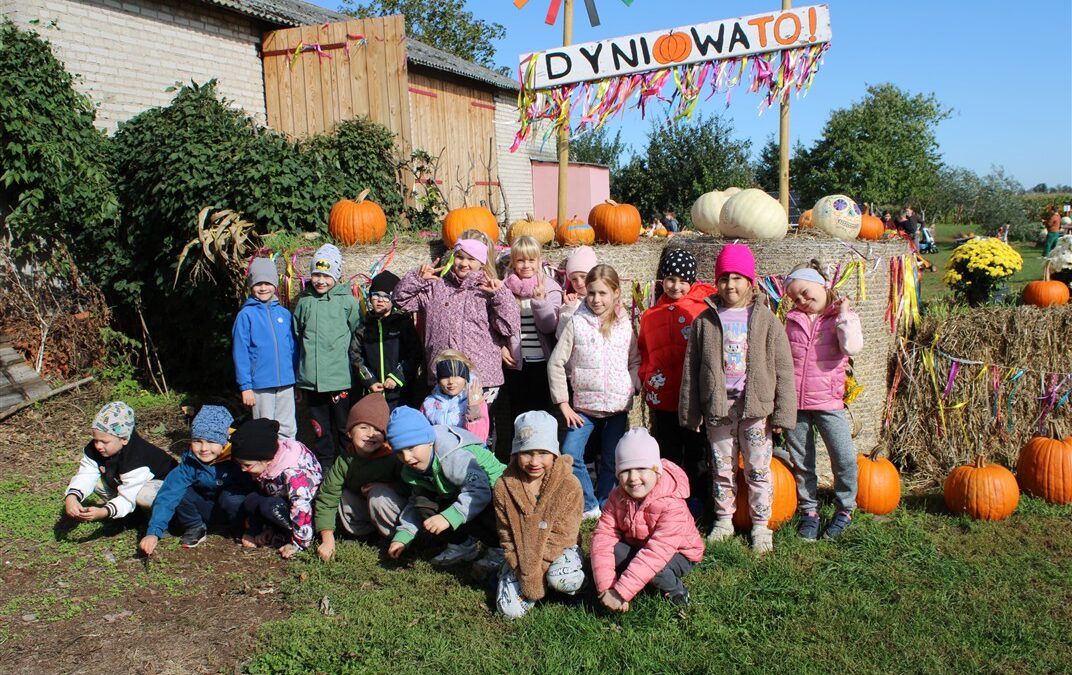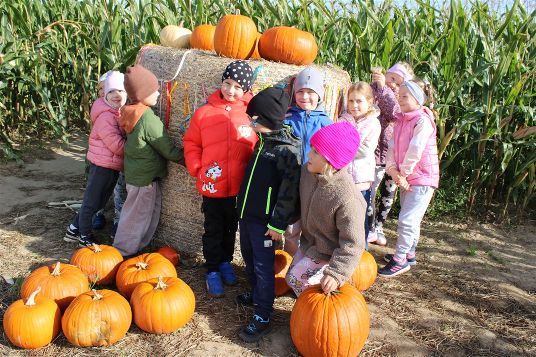W dniu 26 września dzieci z grupy „Biedronek” wyjechały na wycieczkę do Kopaszyna, na farmę dyń „Dyniowato”. Na początku spotkania dowiedziały się, jak wiele gatunków dyń zgromadzonych jest na farmie, jak one wyglądają i które z nich są przeznaczone do jedzenia, a które nie. Obejrzały pole, na którym urosły dynie i poznały wiadomości na temat warunków potrzebnych dyniom do wzrostu. Podczas warsztatów miały okazję obejrzeć ogromne dynie także od środka i wybrać z nich pestki, które zabrały do domu. Najatrakcyjniejsze jednak okazały się zabawy ruchowe wśród setek dyń, w tym wędrowanie labiryntem wśród kukurydzy i wielu dyń, czy też zabawy na dyniowym placu zabaw.