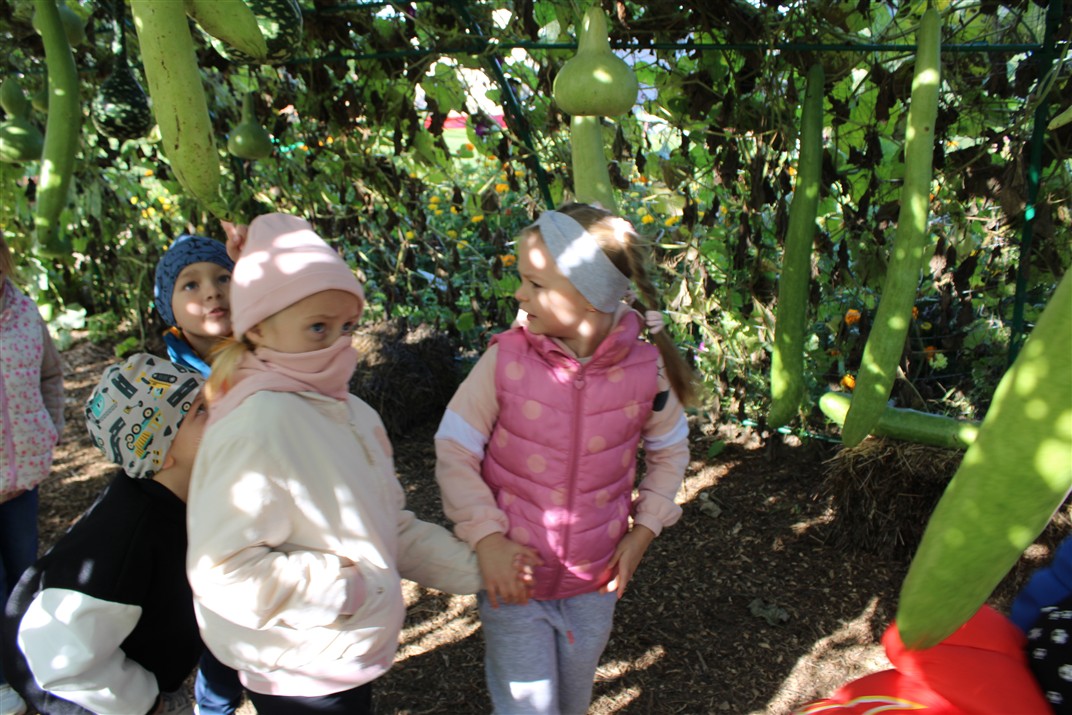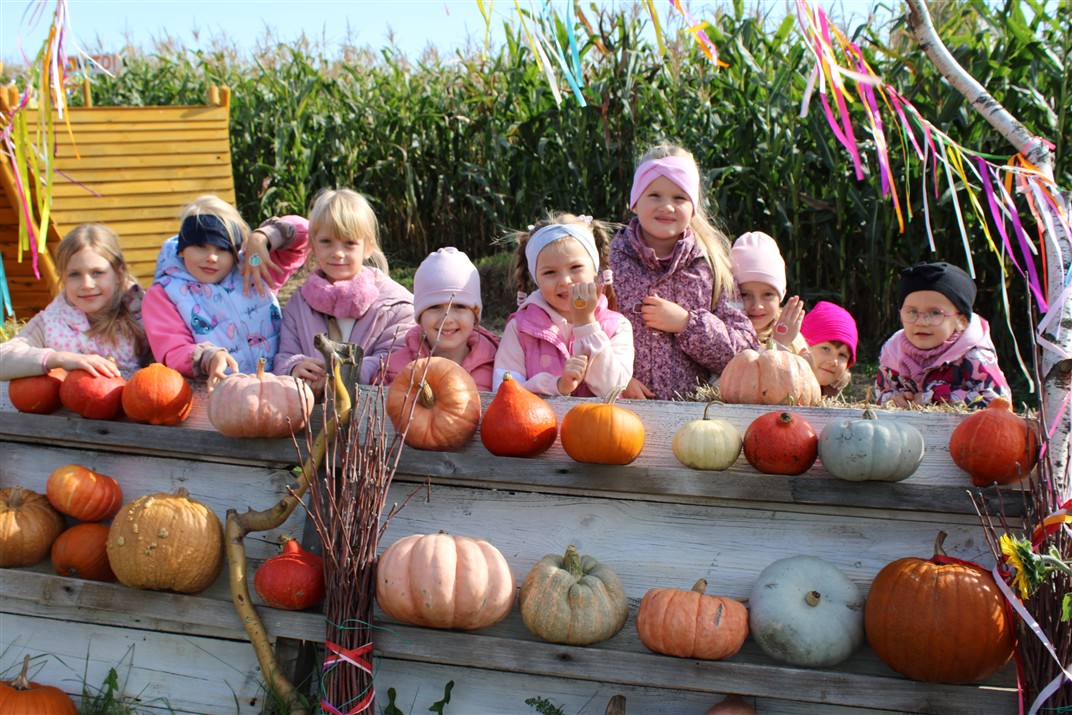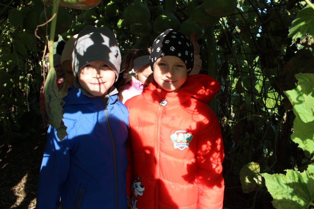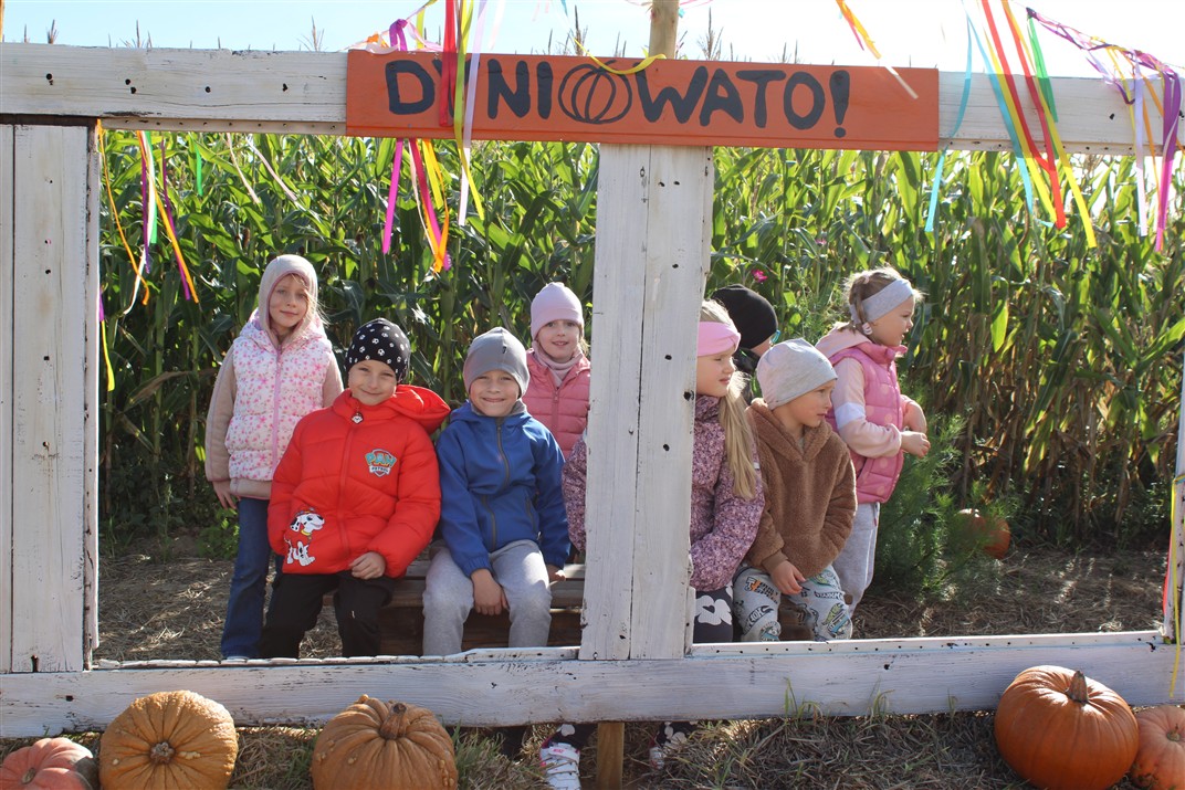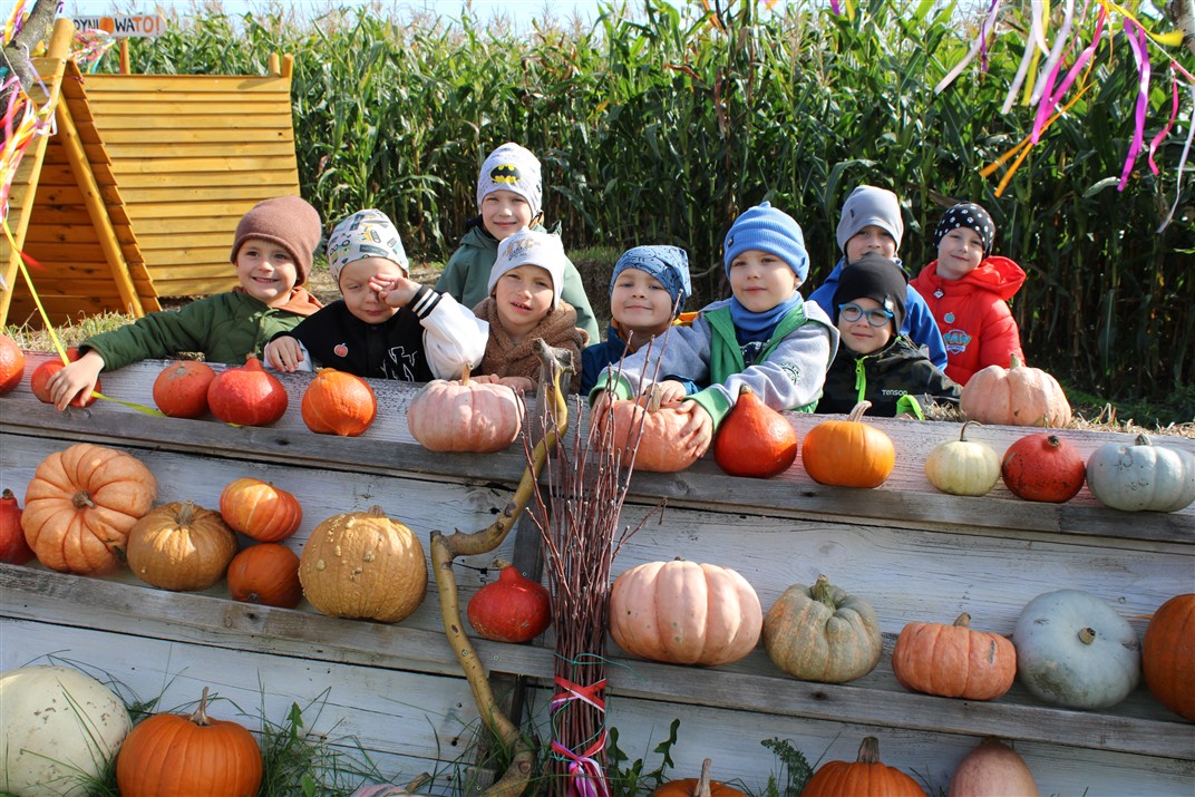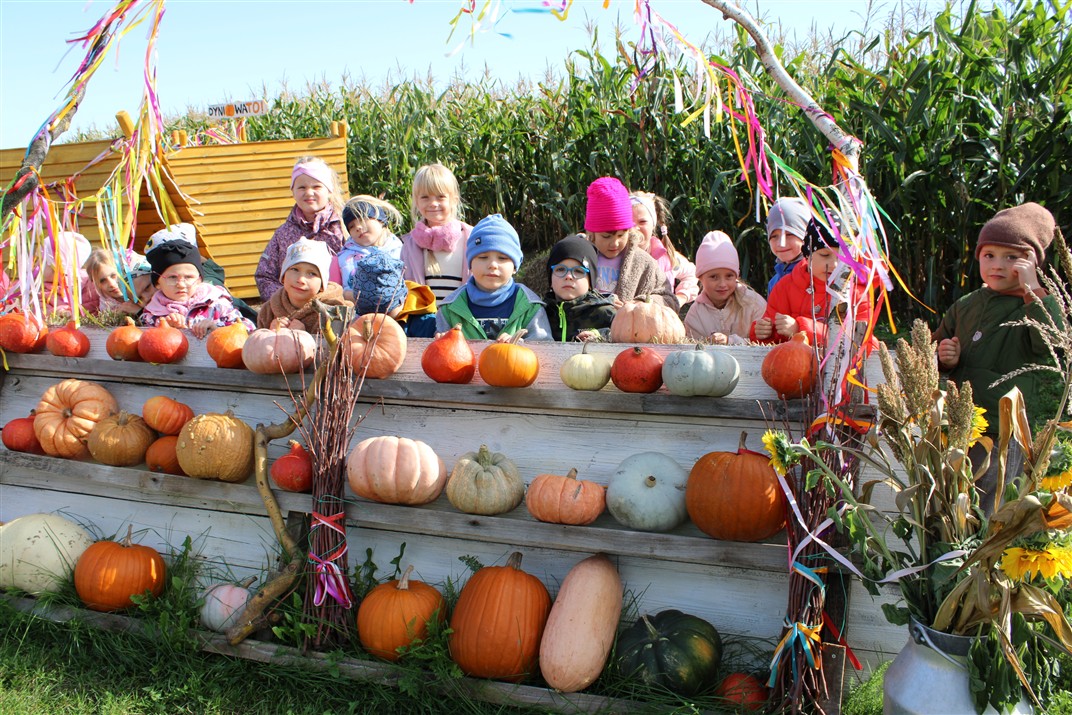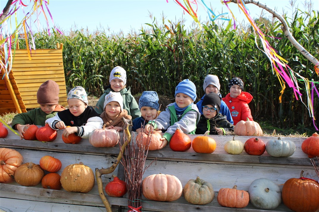 W dniu 26 września dzieci z grupy „Biedronek” wyjechały na wycieczkę do Kopaszyna, na farmę dyń „Dyniowato”. Na początku spotkania dowiedziały się, jak wiele gatunków dyń zgromadzonych jest na farmie, jak one wyglądają i które z nich są przeznaczone do jedzenia, a które nie. Obejrzały pole, na którym urosły dynie i poznały wiadomości na temat warunków potrzebnych dyniom do wzrostu. Podczas warsztatów miały okazję obejrzeć ogromne dynie także od środka i wybrać z nich pestki, które zabrały do domu. Najatrakcyjniejsze jednak okazały się zabawy ruchowe wśród setek dyń, w tym wędrowanie labiryntem wśród kukurydzy i wielu dyń, czy też zabawy na dyniowym placu zabaw.