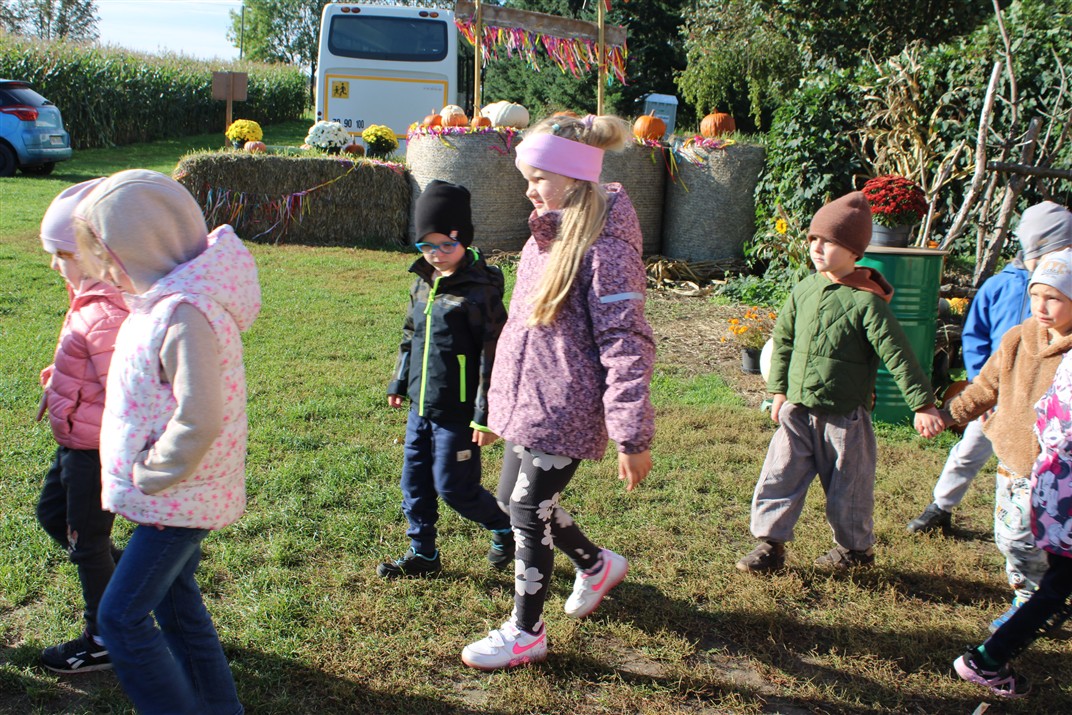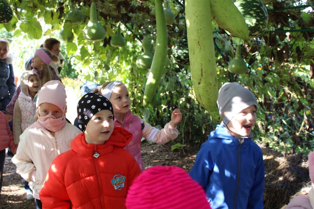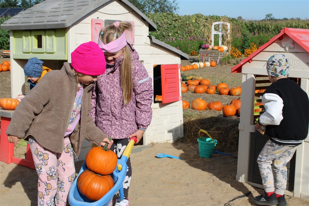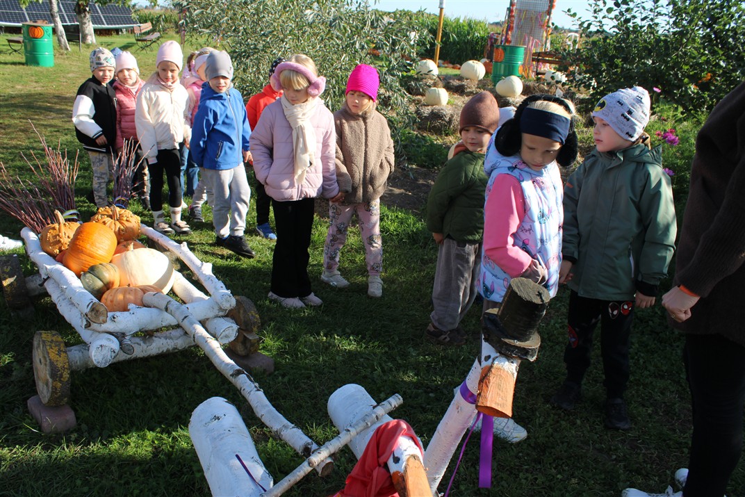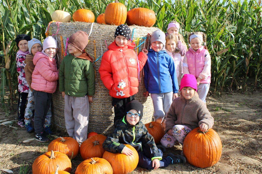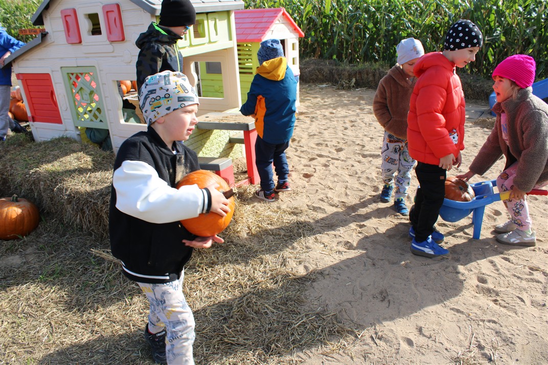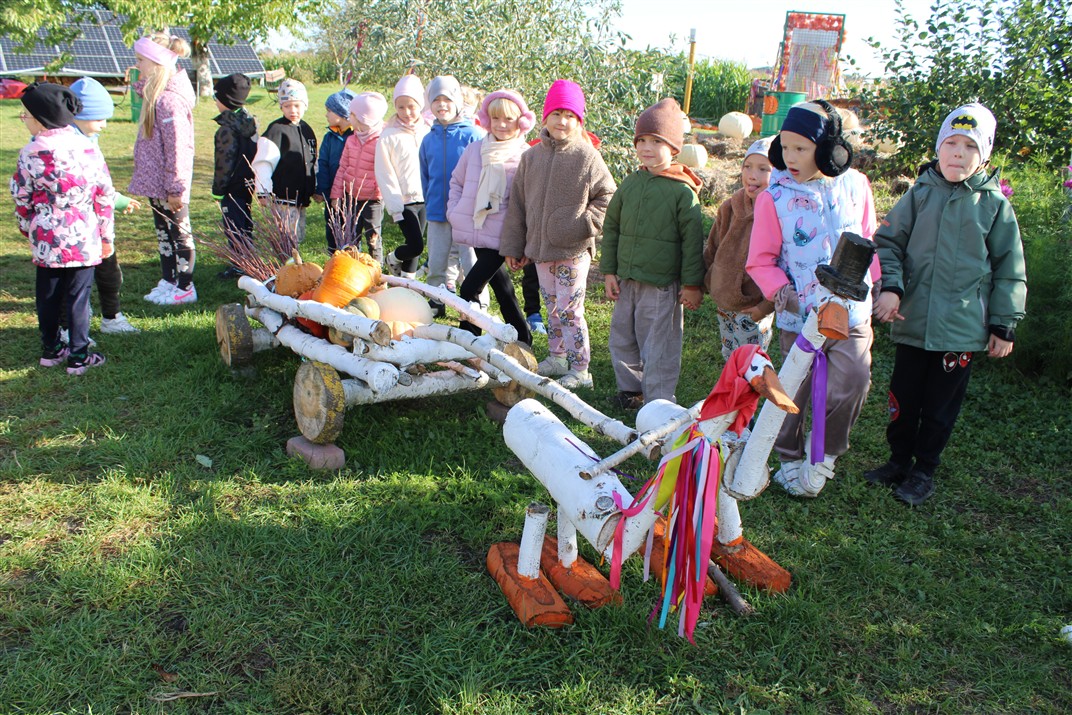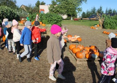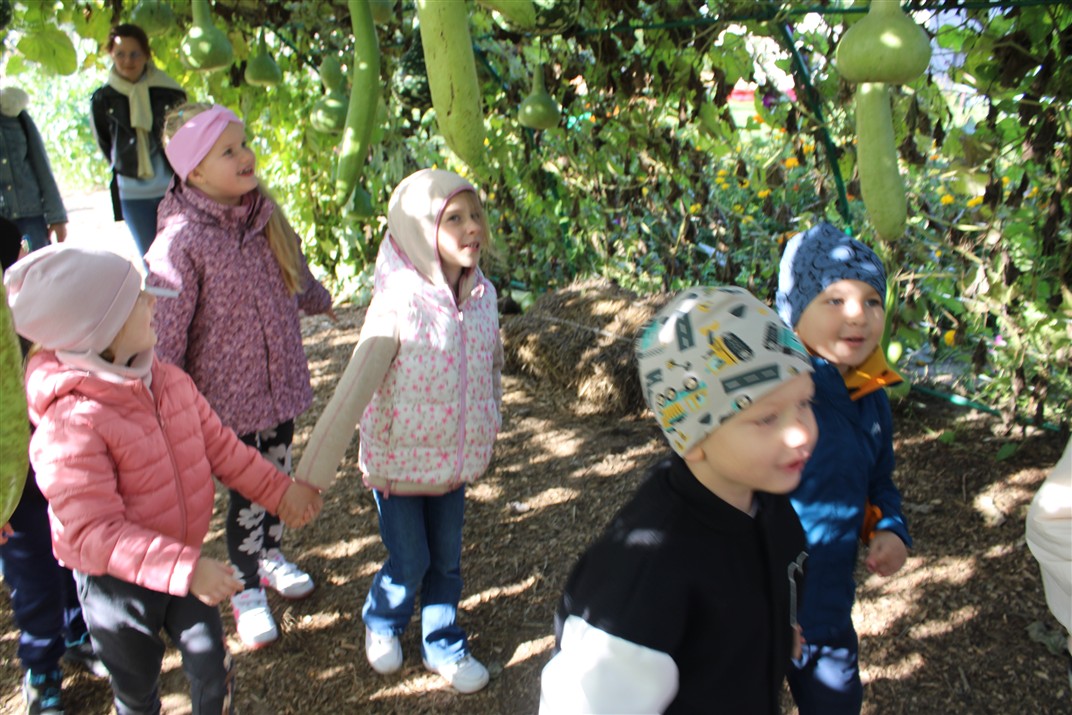 W dniu 26 września dzieci z grupy „Biedronek” wyjechały na wycieczkę do Kopaszyna, na farmę dyń „Dyniowato”. Na początku spotkania dowiedziały się, jak wiele gatunków dyń zgromadzonych jest na farmie, jak one wyglądają i które z nich są przeznaczone do jedzenia, a które nie. Obejrzały pole, na którym urosły dynie i poznały wiadomości na temat warunków potrzebnych dyniom do wzrostu. Podczas warsztatów miały okazję obejrzeć ogromne dynie także od środka i wybrać z nich pestki, które zabrały do domu. Najatrakcyjniejsze jednak okazały się zabawy ruchowe wśród setek dyń, w tym wędrowanie labiryntem wśród kukurydzy i wielu dyń, czy też zabawy na dyniowym placu zabaw.