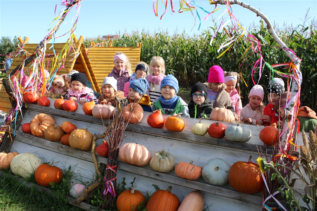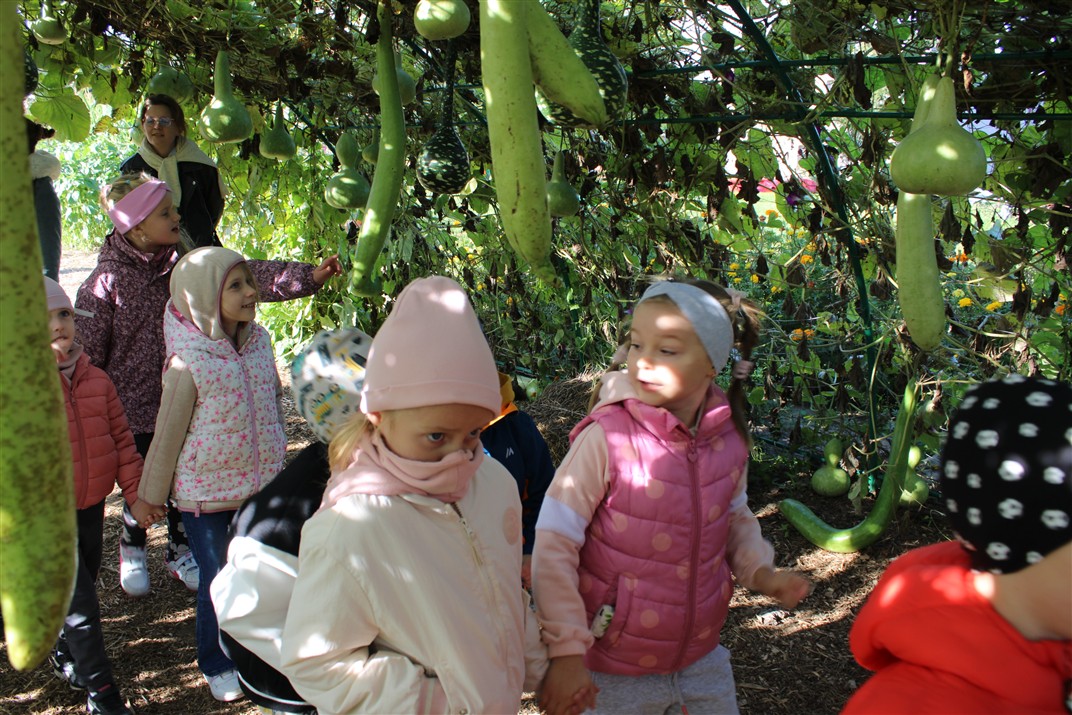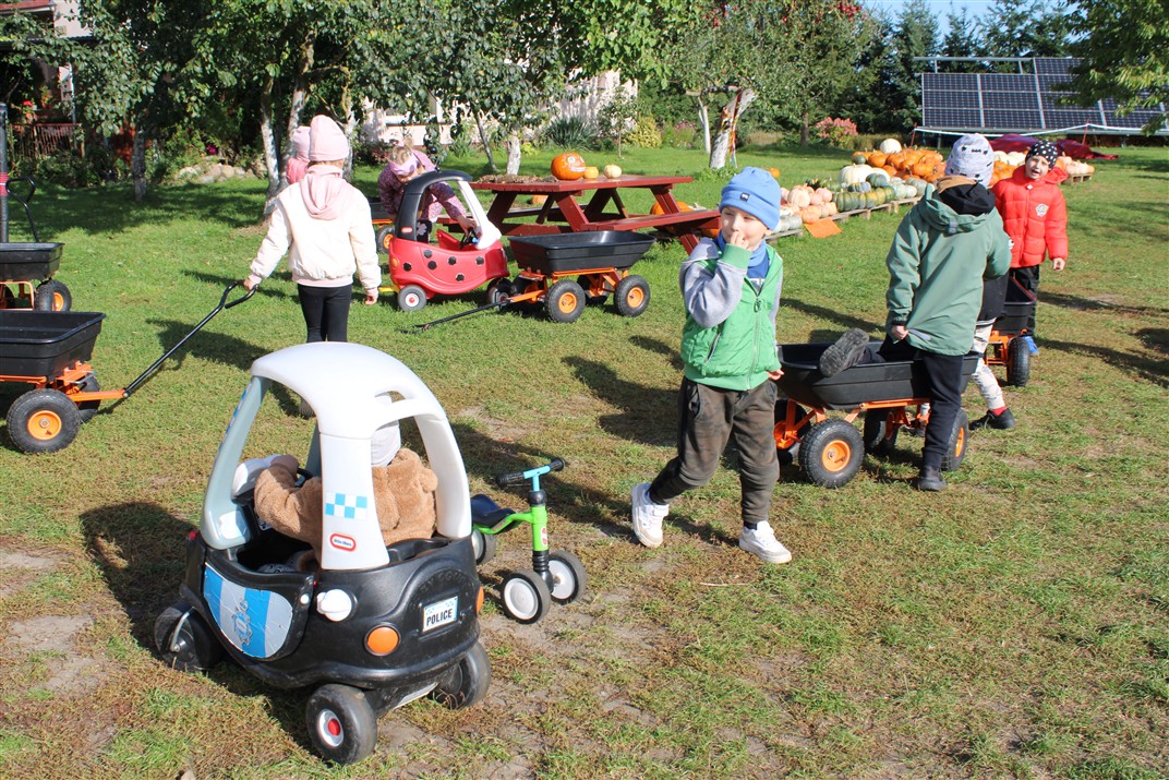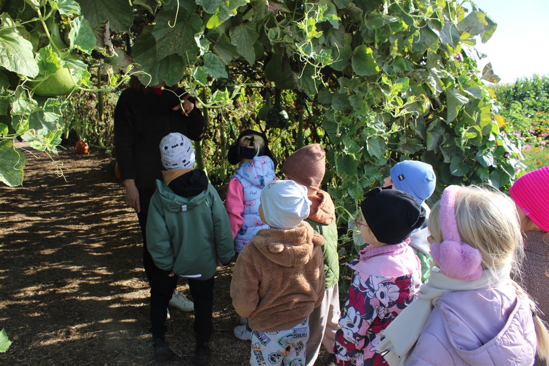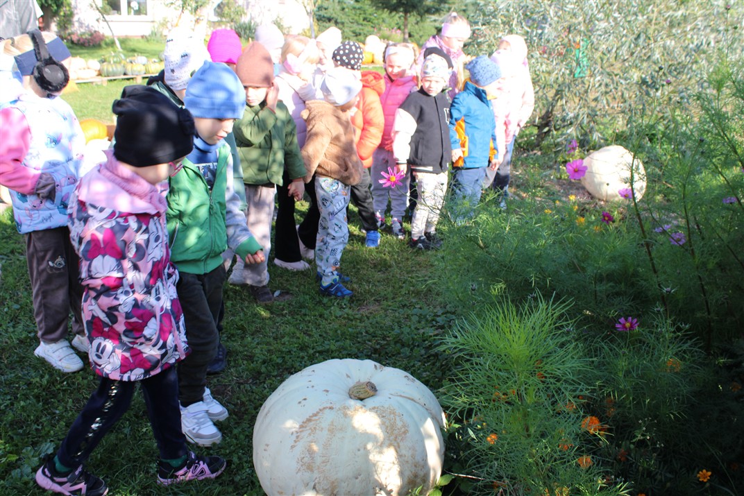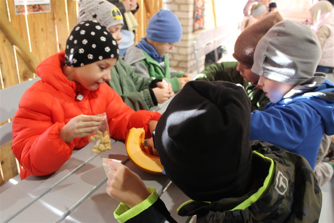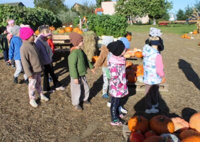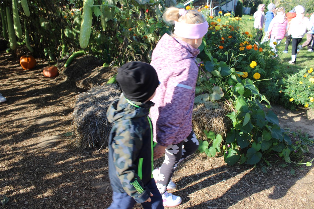 W dniu 26 września dzieci z grupy „Biedronek” wyjechały na wycieczkę do Kopaszyna, na farmę dyń „Dyniowato”. Na początku spotkania dowiedziały się, jak wiele gatunków dyń zgromadzonych jest na farmie, jak one wyglądają i które z nich są przeznaczone do jedzenia, a które nie. Obejrzały pole, na którym urosły dynie i poznały wiadomości na temat warunków potrzebnych dyniom do wzrostu. Podczas warsztatów miały okazję obejrzeć ogromne dynie także od środka i wybrać z nich pestki, które zabrały do domu. Najatrakcyjniejsze jednak okazały się zabawy ruchowe wśród setek dyń, w tym wędrowanie labiryntem wśród kukurydzy i wielu dyń, czy też zabawy na dyniowym placu zabaw.