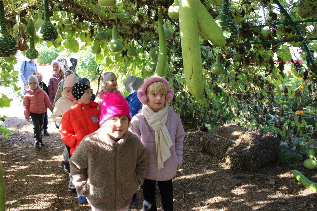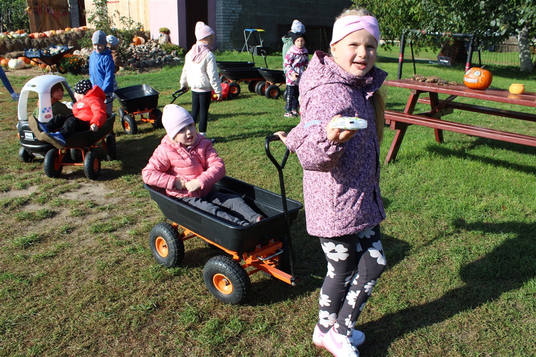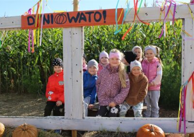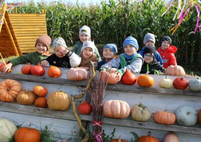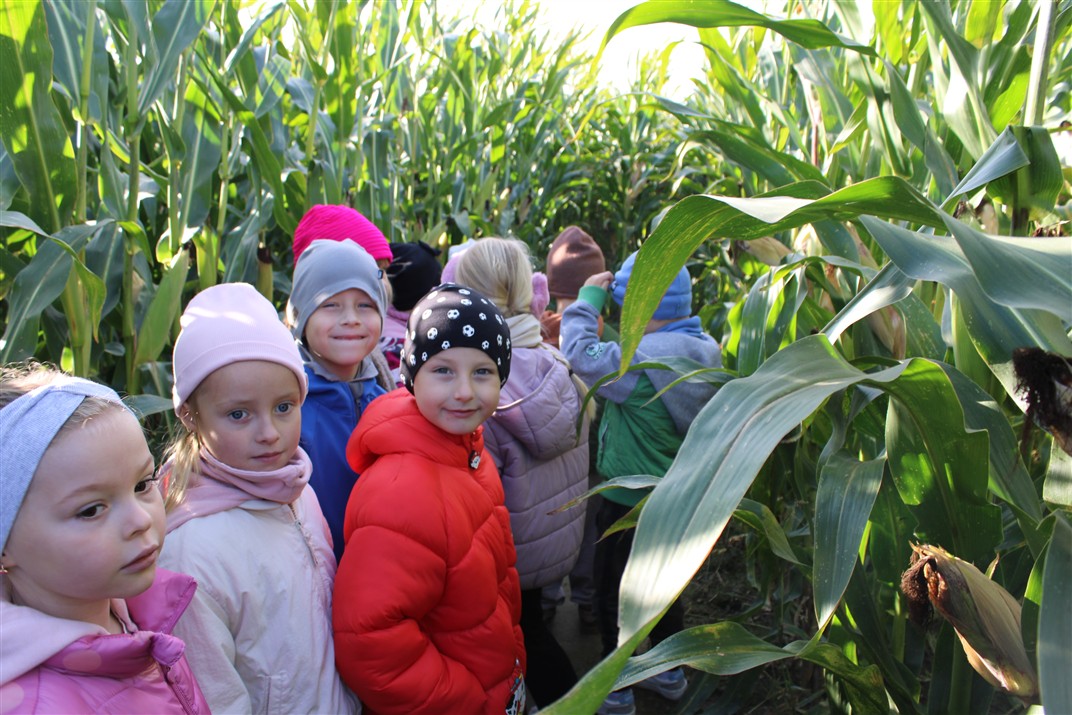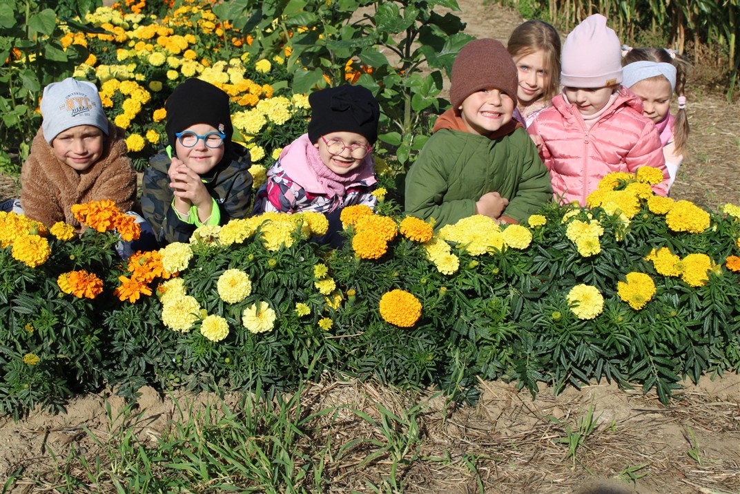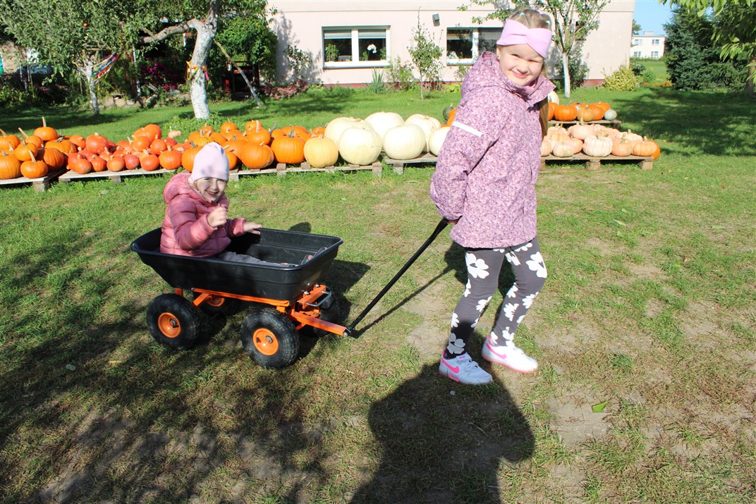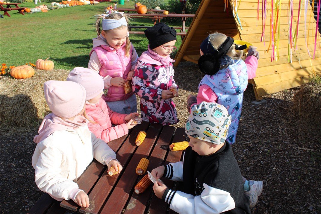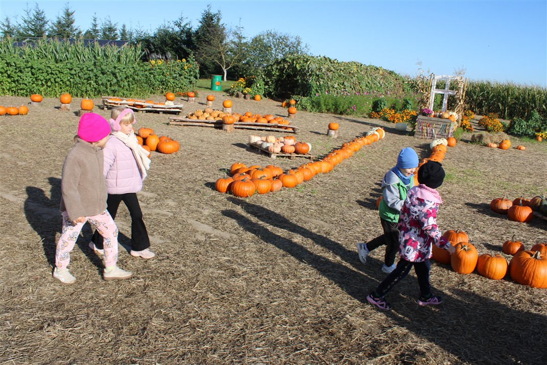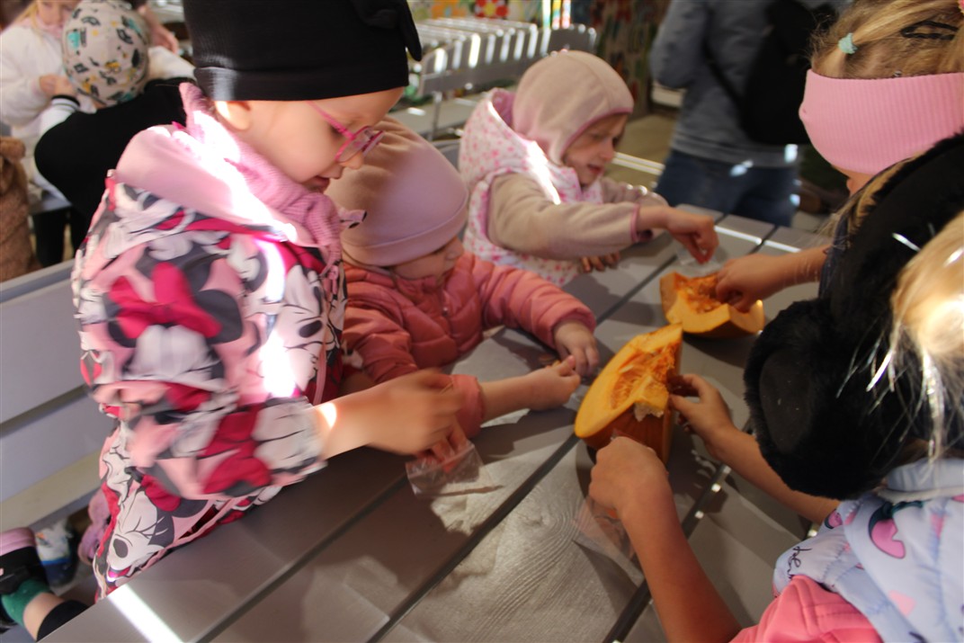W dniu 26 września dzieci z grupy „Biedronek” wyjechały na wycieczkę do Kopaszyna, na farmę dyń „Dyniowato”. Na początku spotkania dowiedziały się, jak wiele gatunków dyń zgromadzonych jest na farmie, jak one wyglądają i które z nich są przeznaczone do jedzenia, a które nie. Obejrzały pole, na którym urosły dynie i poznały wiadomości na temat warunków potrzebnych dyniom do wzrostu. Podczas warsztatów miały okazję obejrzeć ogromne dynie także od środka i wybrać z nich pestki, które zabrały do domu. Najatrakcyjniejsze jednak okazały się zabawy ruchowe wśród setek dyń, w tym wędrowanie labiryntem wśród kukurydzy i wielu dyń, czy też zabawy na dyniowym placu zabaw.