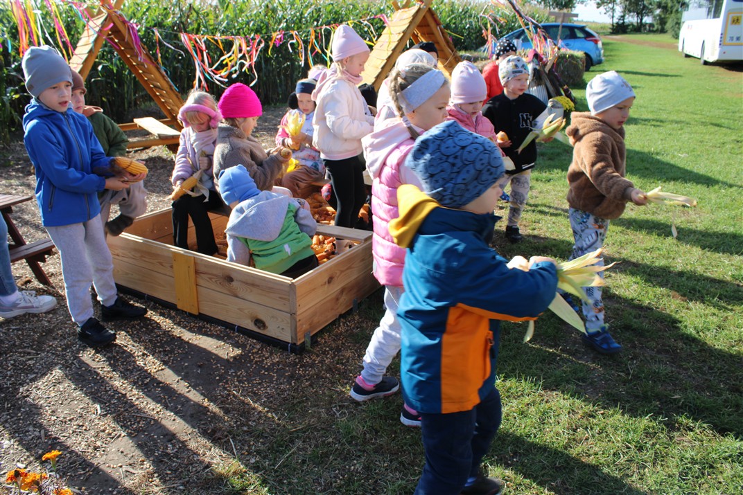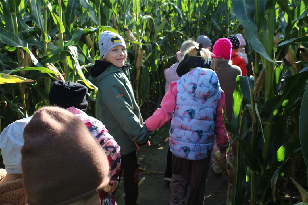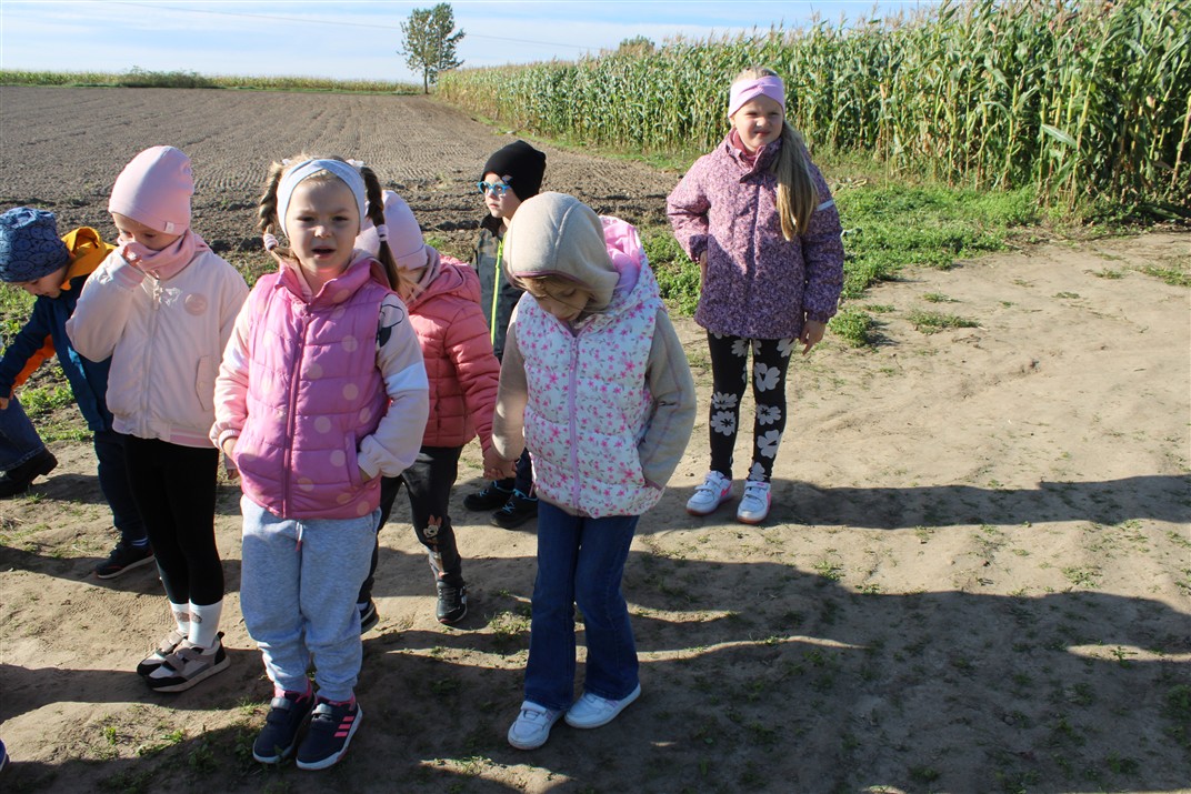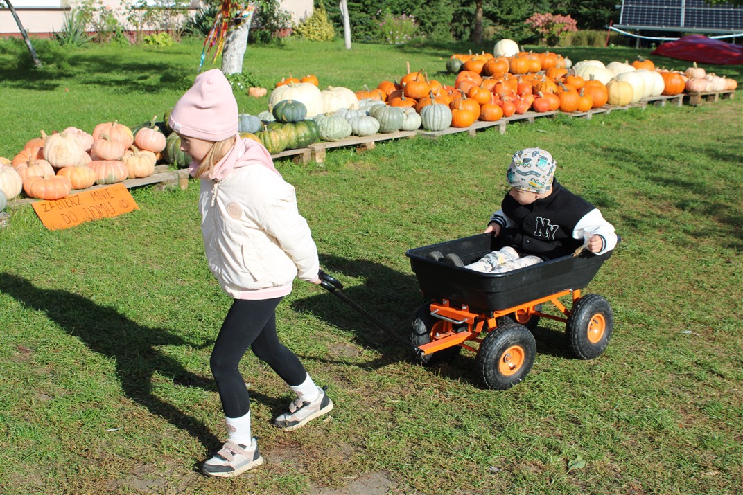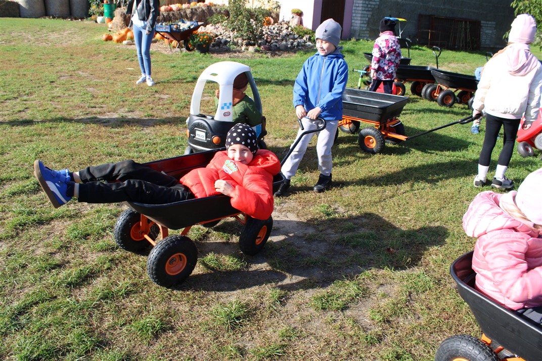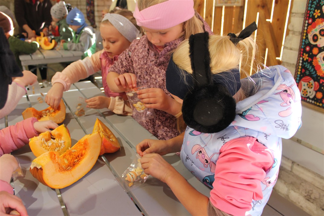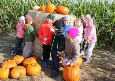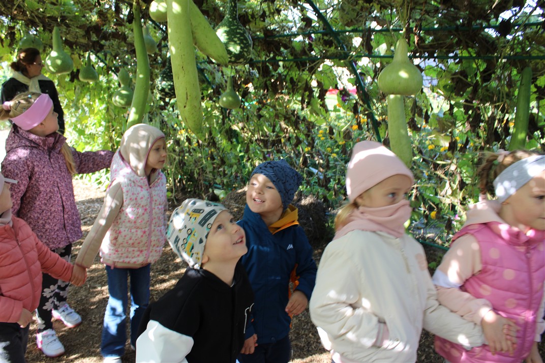 W dniu 26 września dzieci z grupy „Biedronek” wyjechały na wycieczkę do Kopaszyna, na farmę dyń „Dyniowato”. Na początku spotkania dowiedziały się, jak wiele gatunków dyń zgromadzonych jest na farmie, jak one wyglądają i które z nich są przeznaczone do jedzenia, a które nie. Obejrzały pole, na którym urosły dynie i poznały wiadomości na temat warunków potrzebnych dyniom do wzrostu. Podczas warsztatów miały okazję obejrzeć ogromne dynie także od środka i wybrać z nich pestki, które zabrały do domu. Najatrakcyjniejsze jednak okazały się zabawy ruchowe wśród setek dyń, w tym wędrowanie labiryntem wśród kukurydzy i wielu dyń, czy też zabawy na dyniowym placu zabaw.